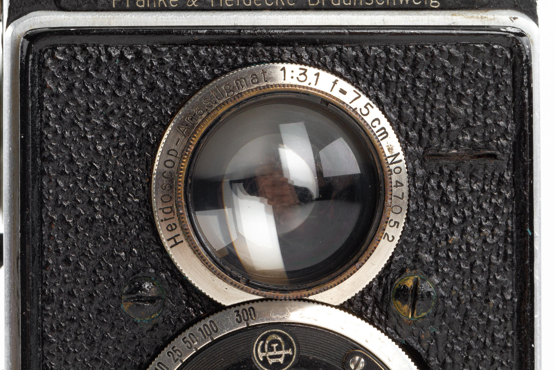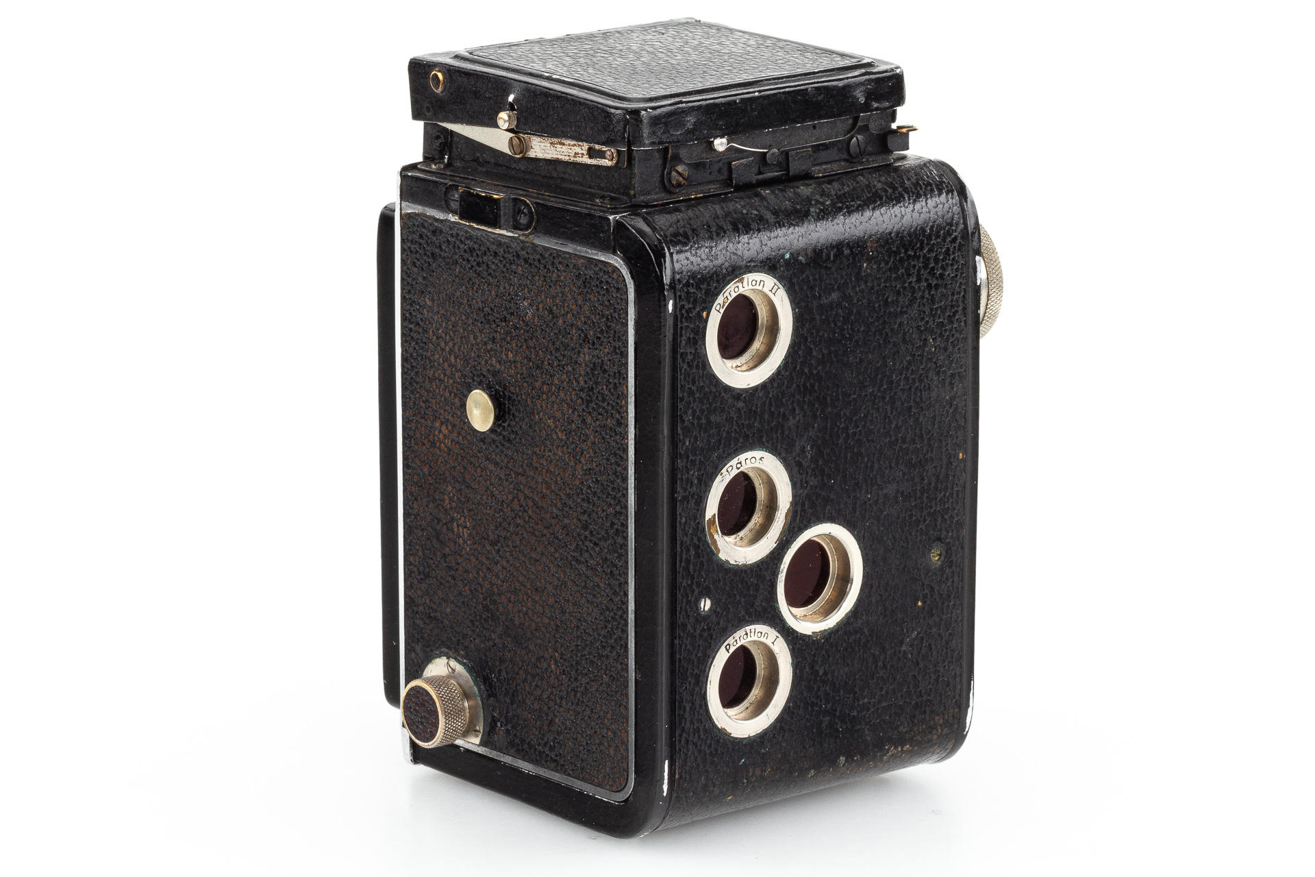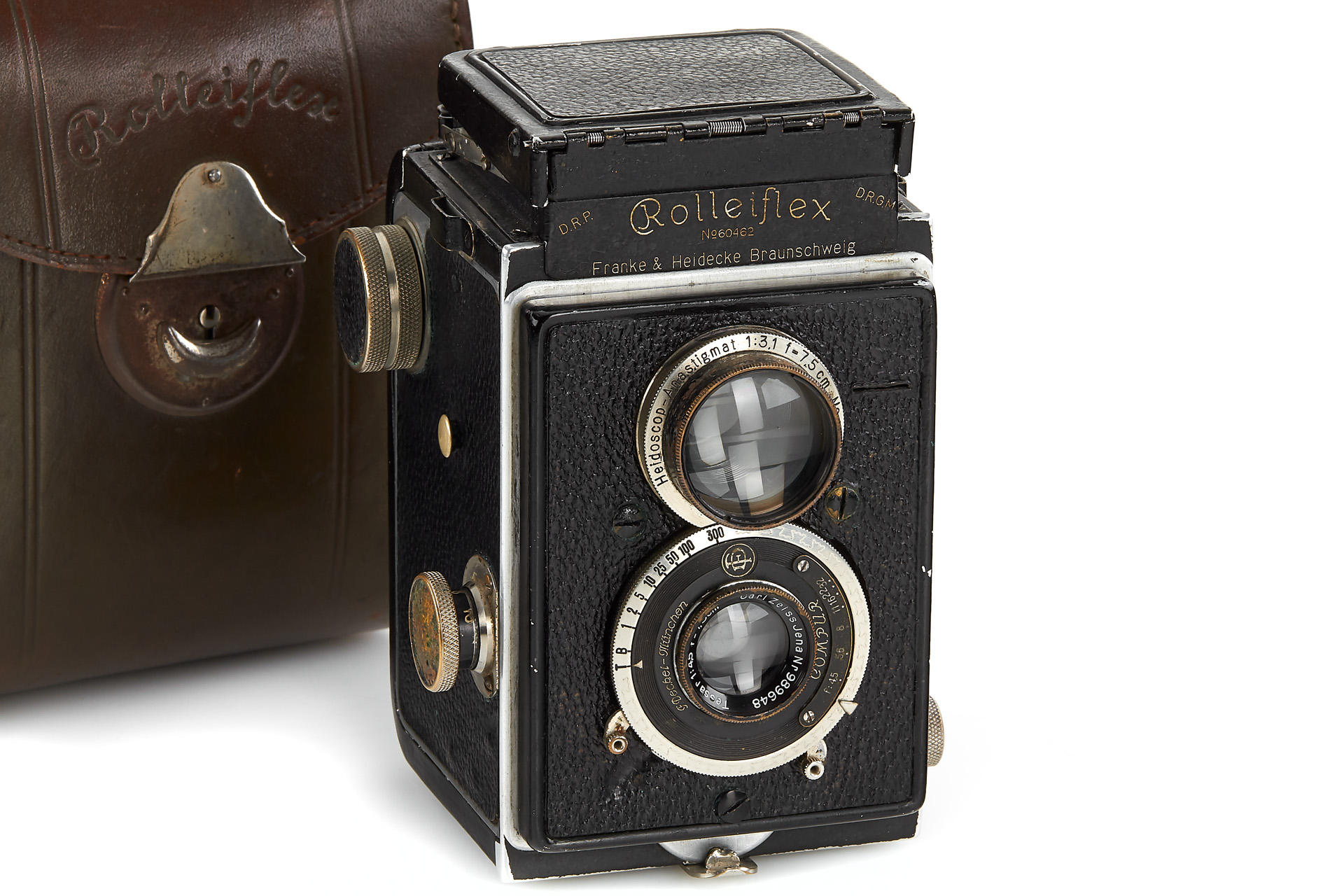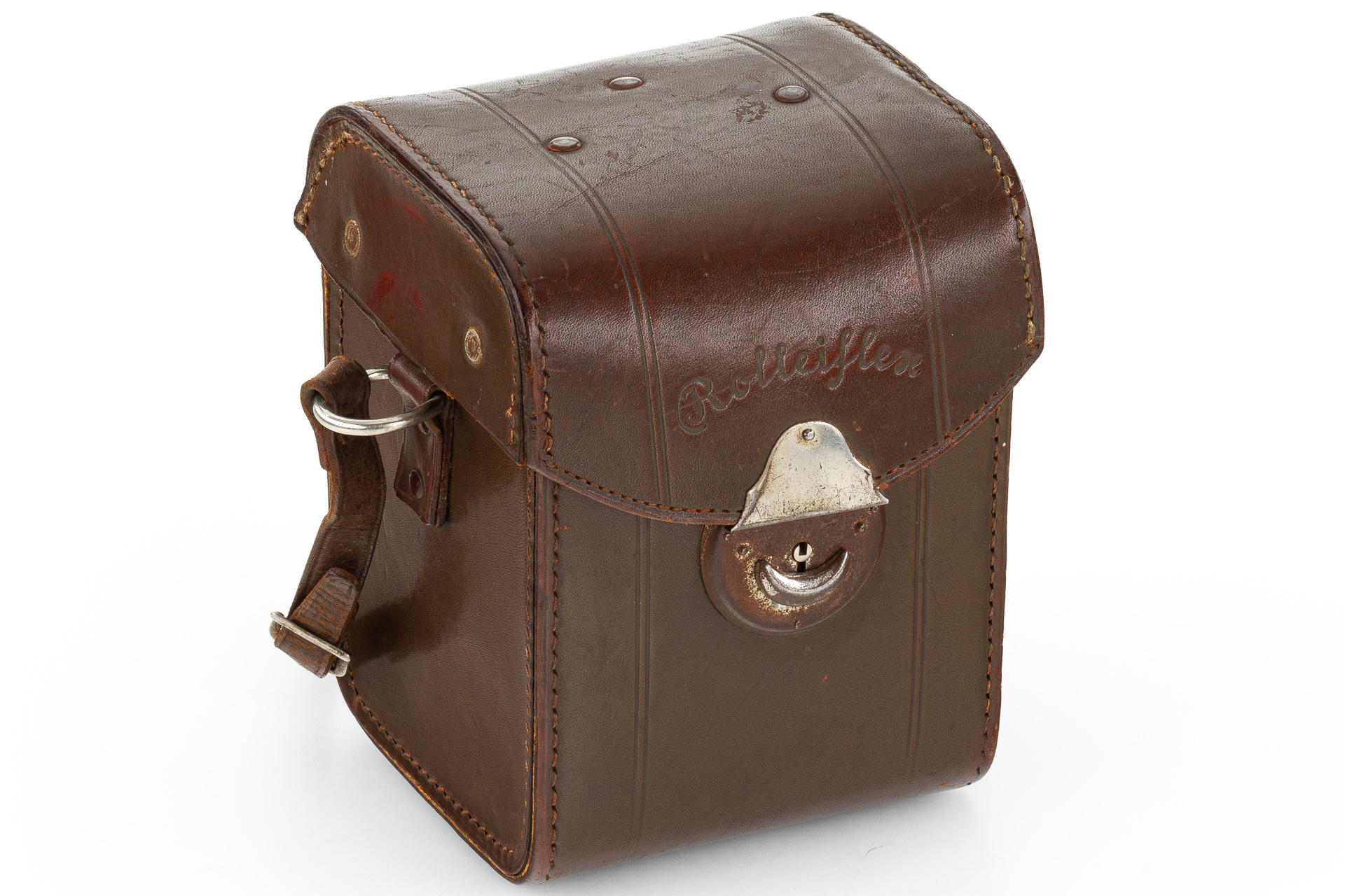 second type Rolleiflex 6x6 with special back door with 4 viewing windows - the purpose of this unique modification is not known - most probably to allow 6x3cm exposures, the camera is in fine condition, with Tessar 4.5/7.5cm no.989648 taking lens, leather case