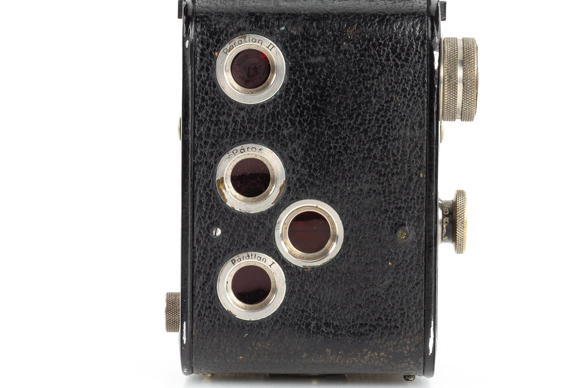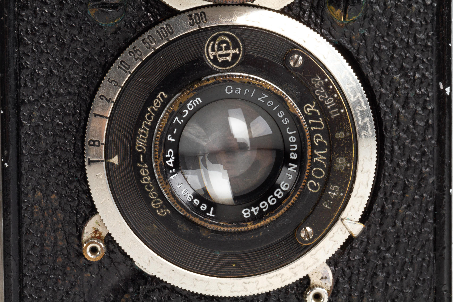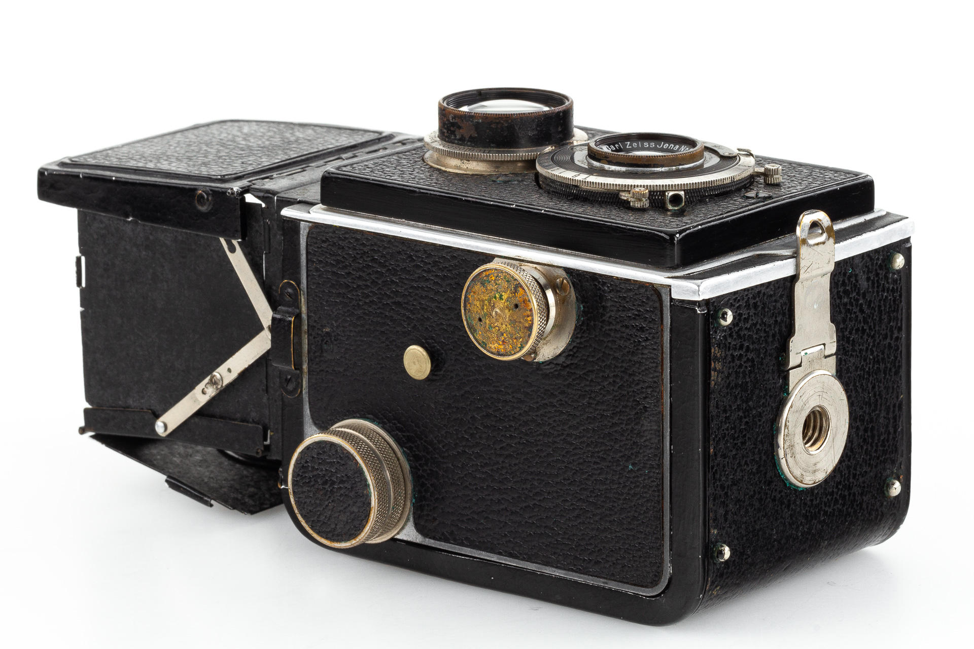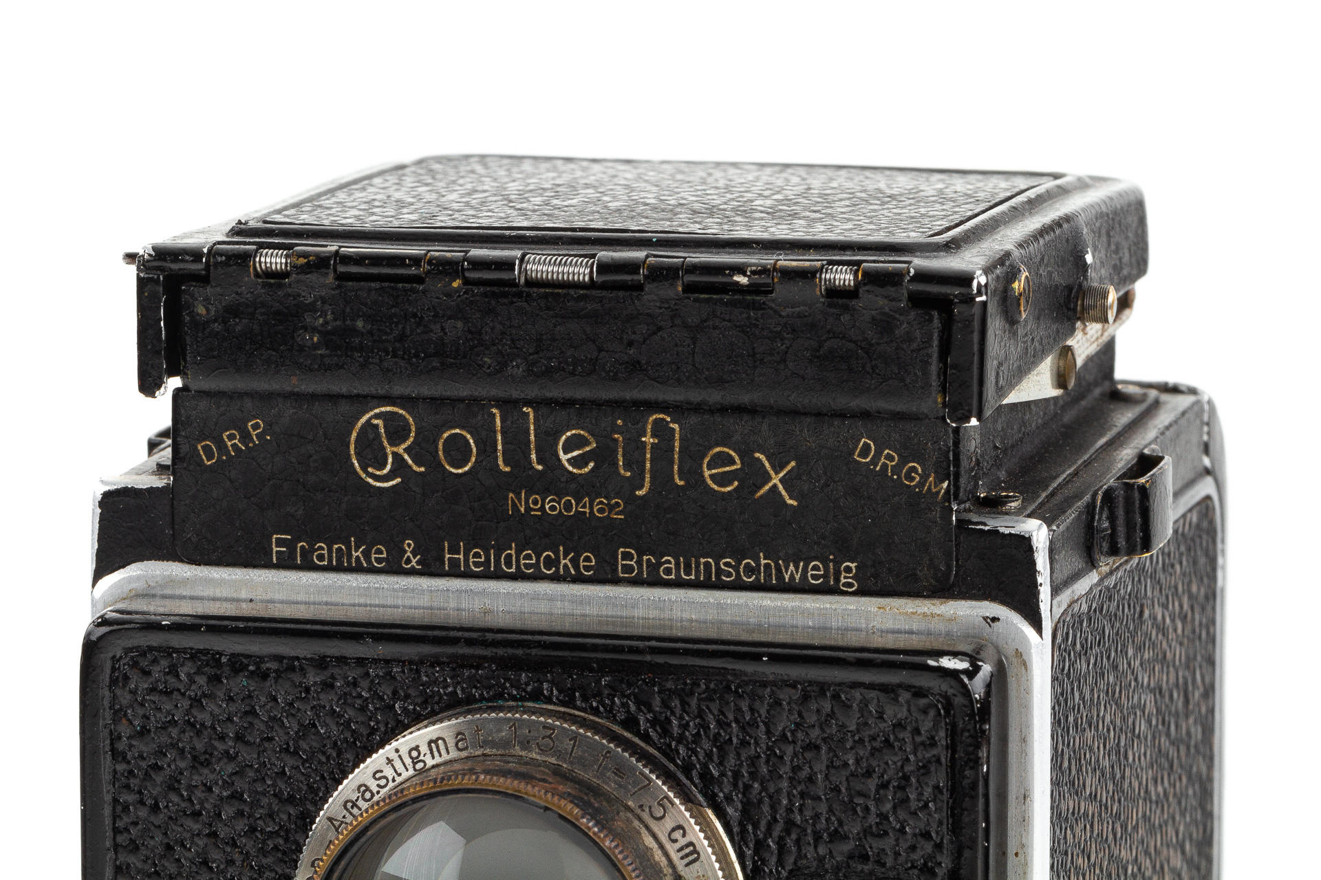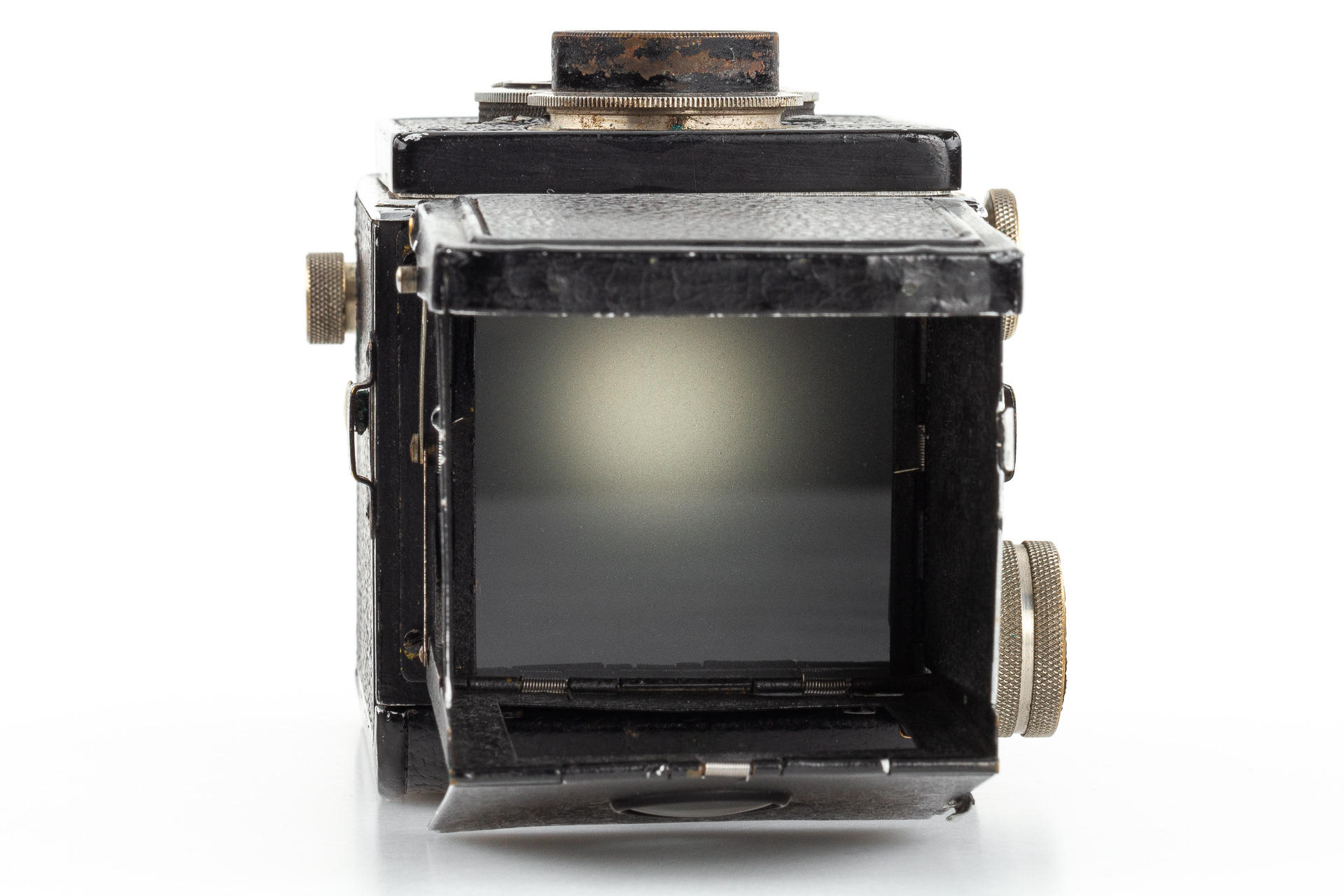 second type Rolleiflex 6x6 with special back door with 4 viewing windows - the purpose of this unique modification is not known - most probably to allow 6x3cm exposures, the camera is in fine condition, with Tessar 4.5/7.5cm no.989648 taking lens, leather case