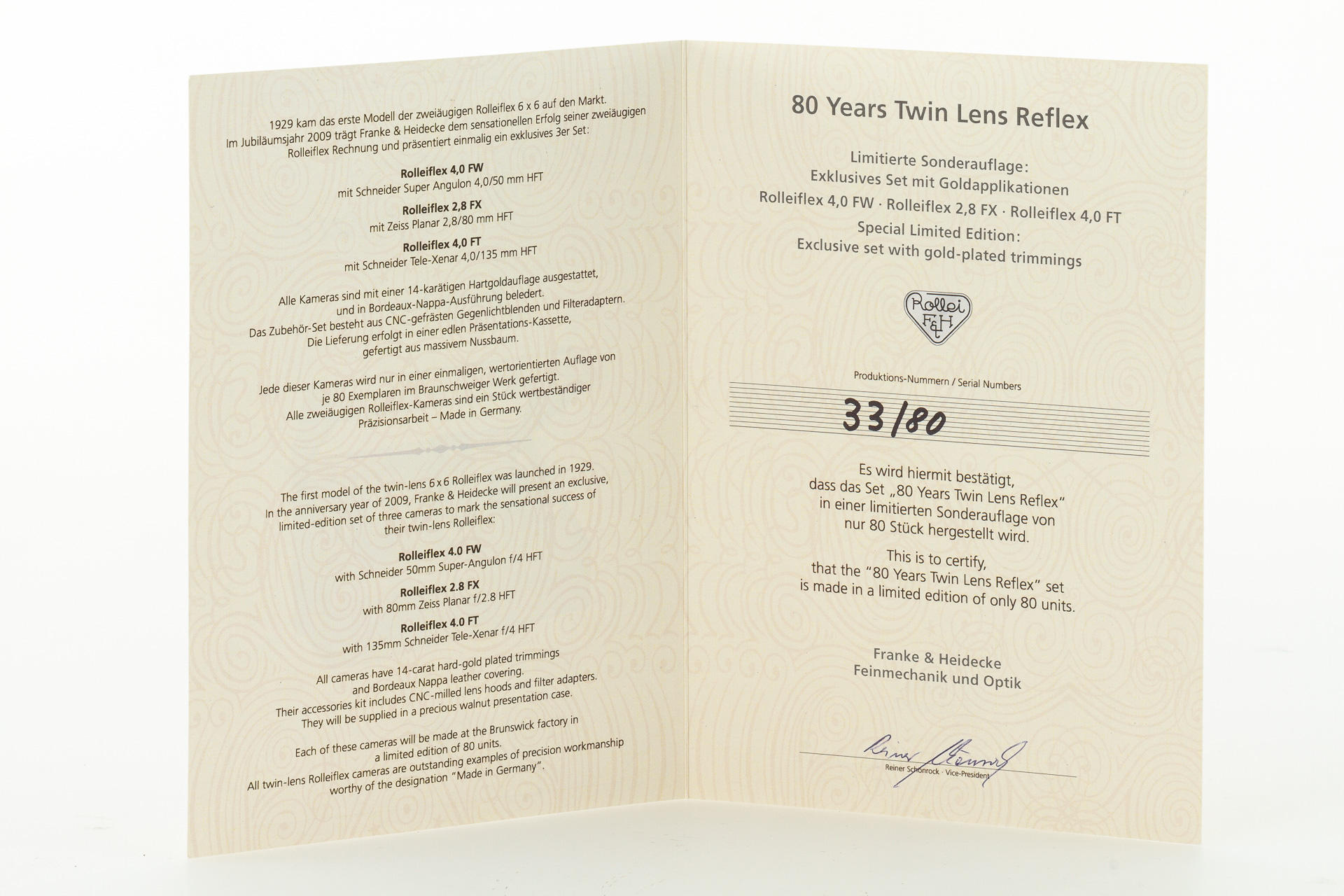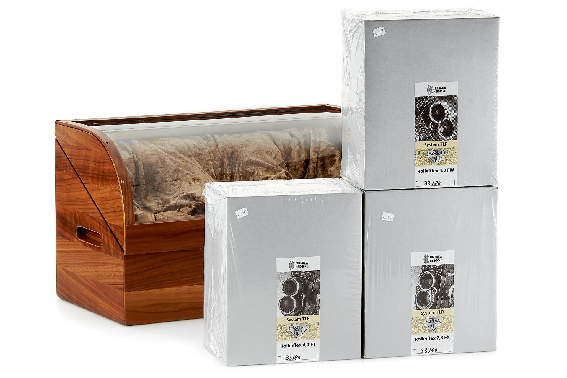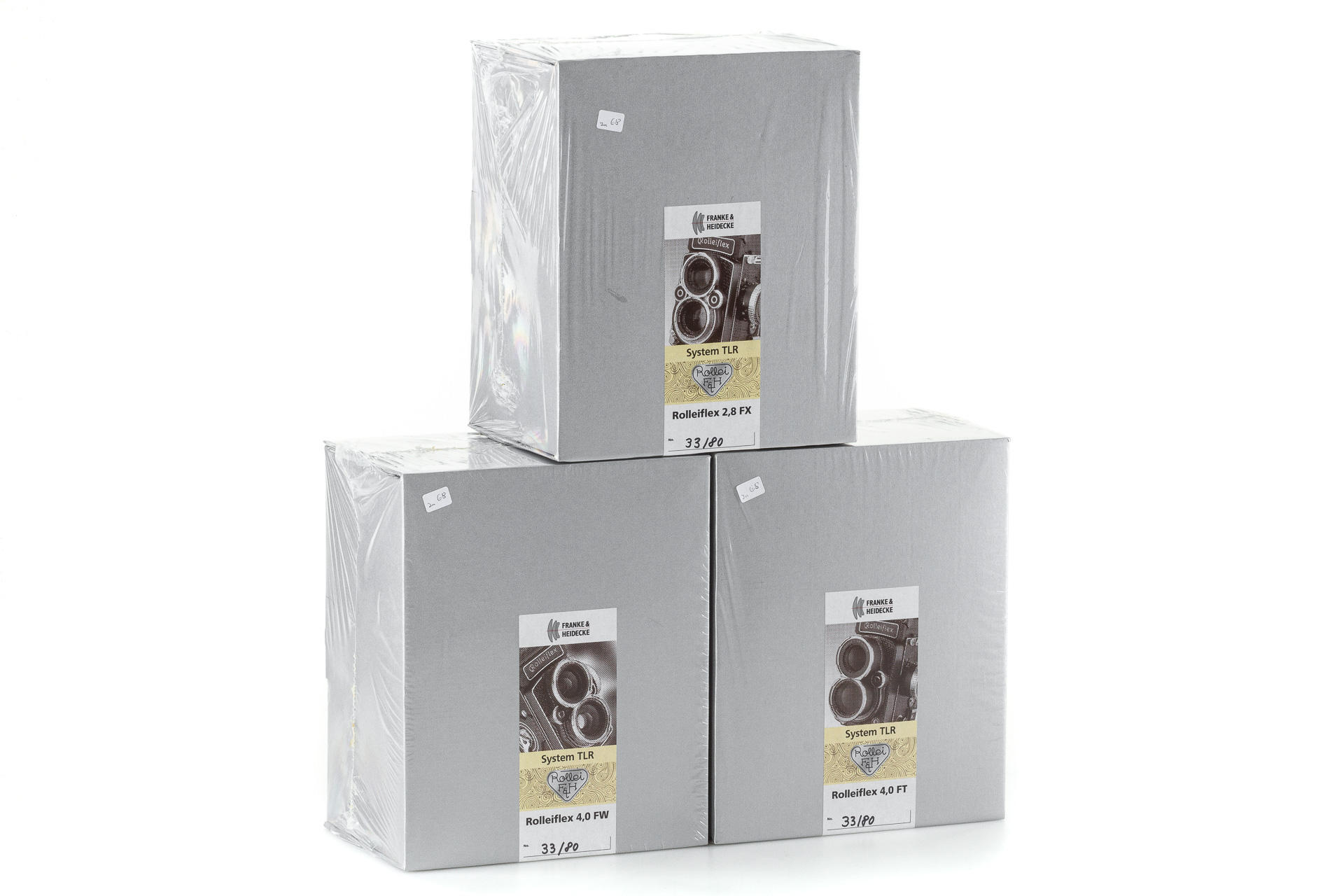 the most exclusive Rolleiflex edition ever made, issued to commemorate 80 years of Rolleiflex TLR cameras, the set includes a wide-angle Rolleiflex 4.0 FW, Rolleiflex 2.8FX and Tele-Rolleiflex 4.0 FT, all cameras with gold-plated applications, all unused and still sealed in maker's boxes, with attractive walnut presentation cabinet for all three cameras