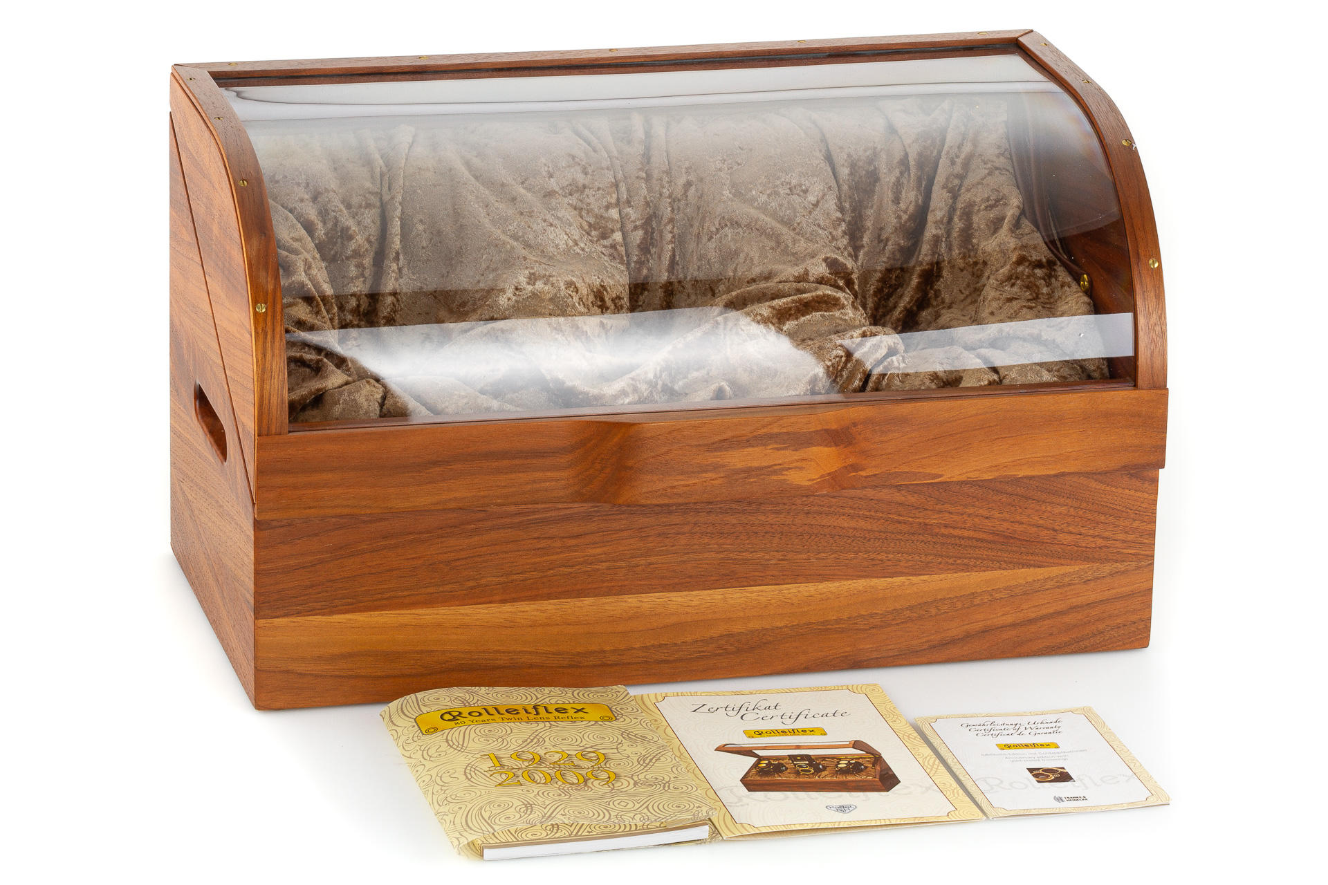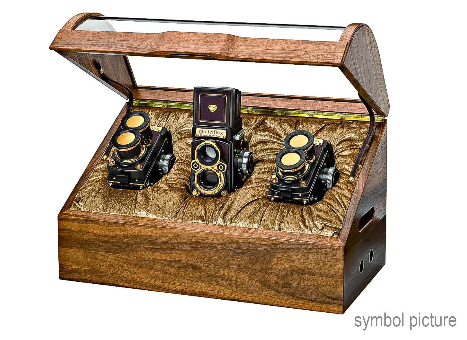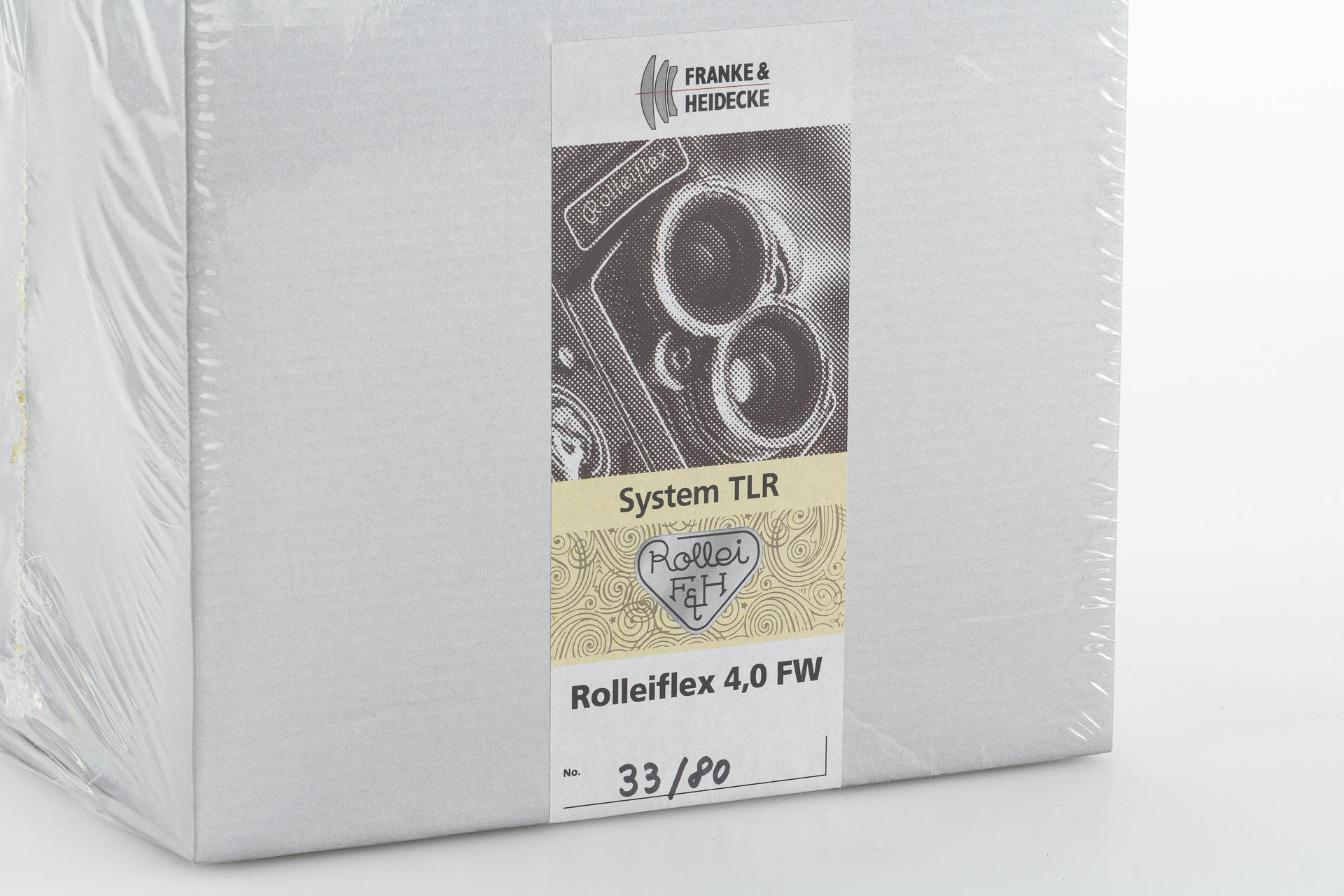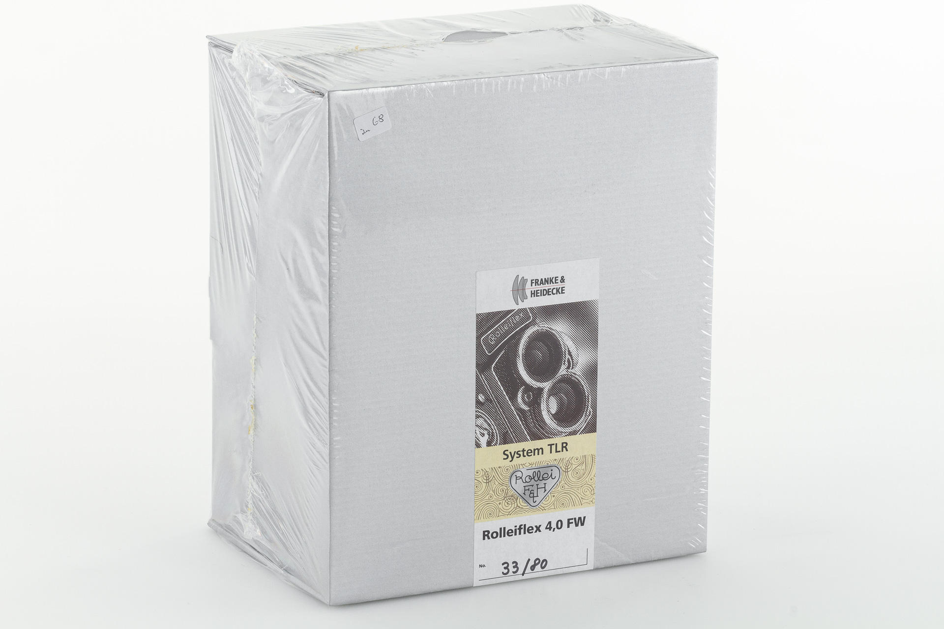 the most exclusive Rolleiflex edition ever made, issued to commemorate 80 years of Rolleiflex TLR cameras, the set includes a wide-angle Rolleiflex 4.0 FW, Rolleiflex 2.8FX and Tele-Rolleiflex 4.0 FT, all cameras with gold-plated applications, all unused and still sealed in maker's boxes, with attractive walnut presentation cabinet for all three cameras