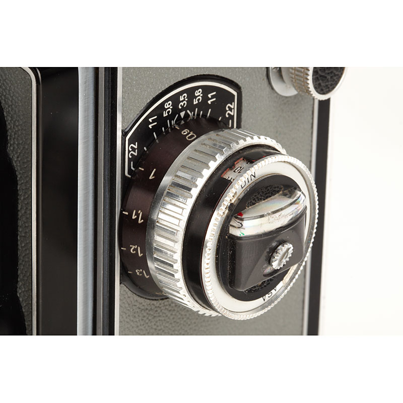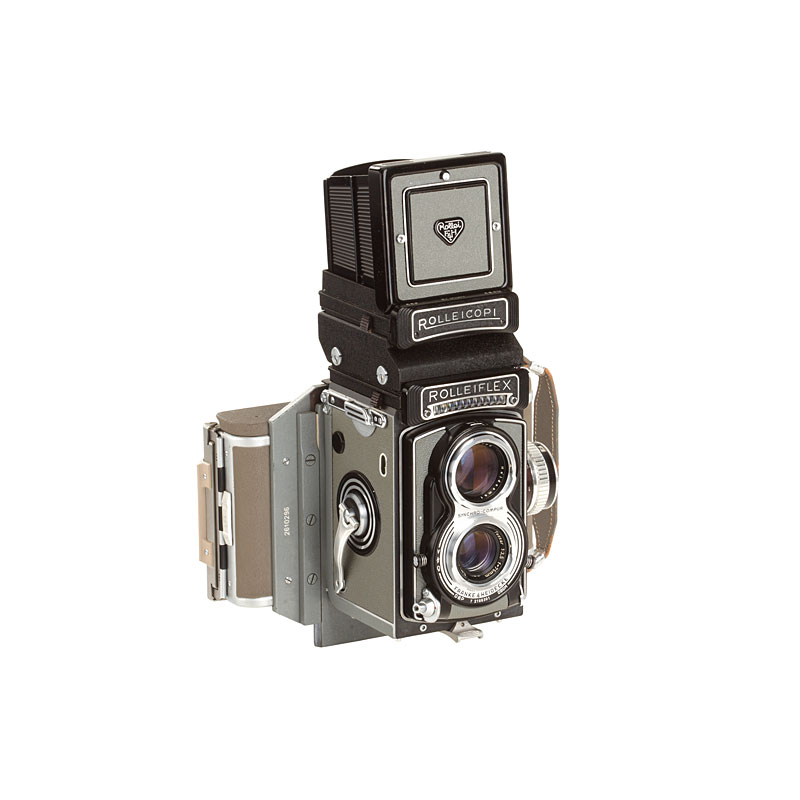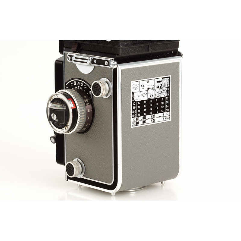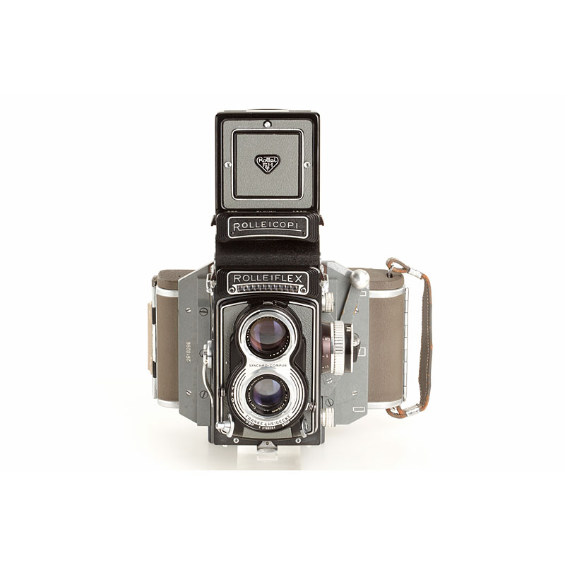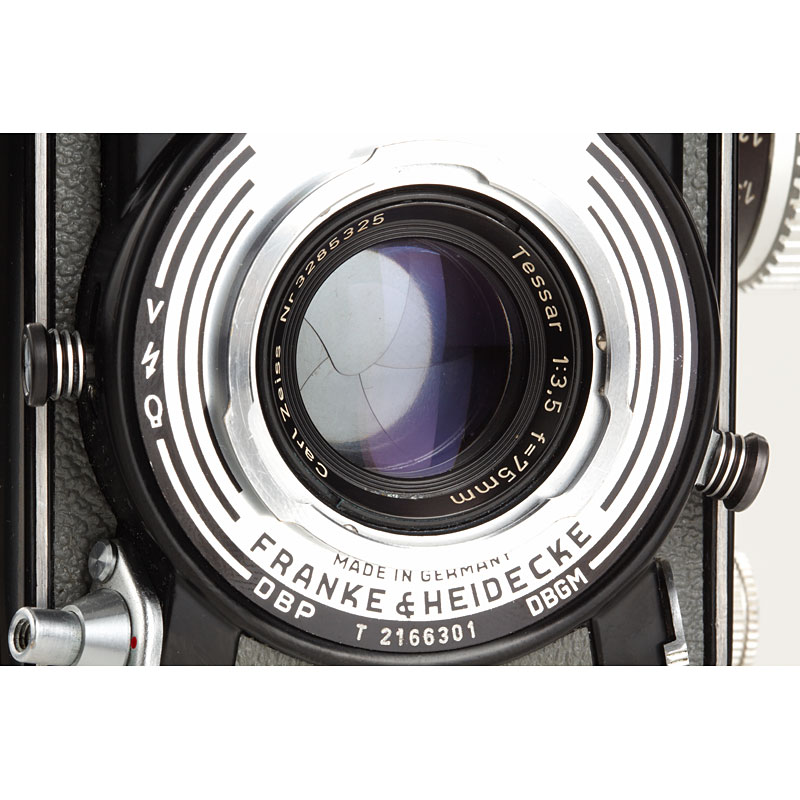 mint first type Rolleiflex T with exposure meter, grey leather covering, in good working order, with Tessar 3.5/75mm no.3285325, viewing lens no.3030185 (cap), Polaroid attachment no.2610296, Rolleicopi and regular back