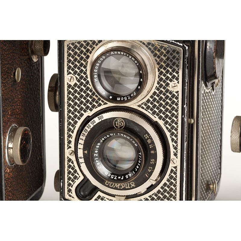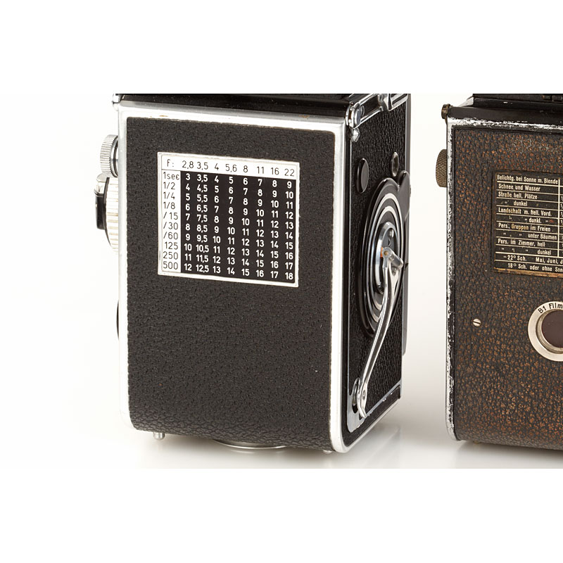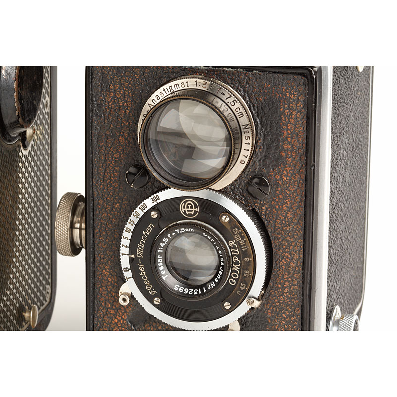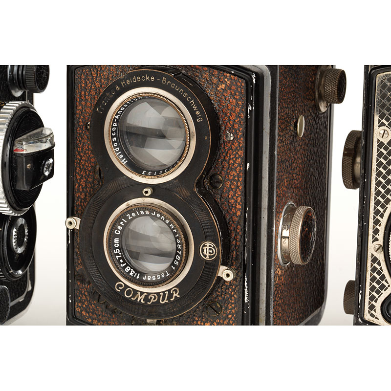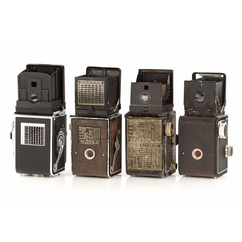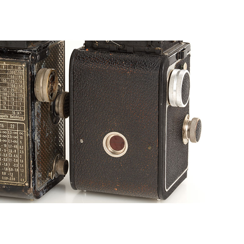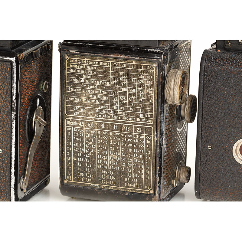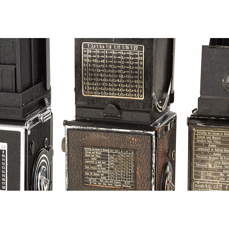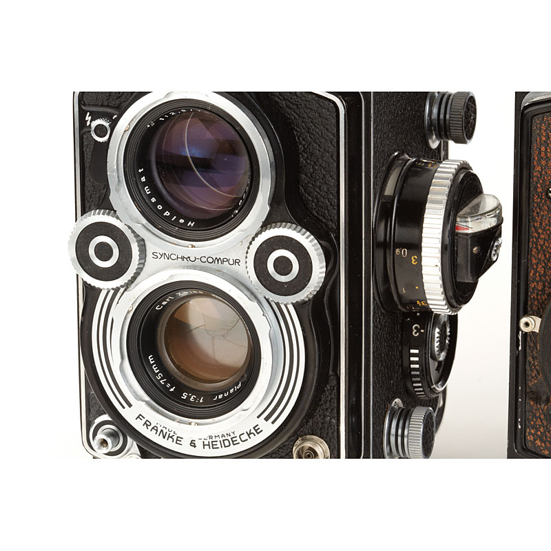 (1) 1st type Rolleiflex 6x6 no.46476 with Tessar 4.5/7.5cm no.1132695 in Compur shutter (cond. B-), (2) 2nd type Rolleiflex 6x6 no.235652 with Tessar 3.8/7.5cm no.1387851 in Compur shutter (cond. C), (3) Rolleicord Ia Art Deco with Triotar 4.5/7.5cm no.1468758 in Compur shutter (cond. C-, cap), (4) Rolleiflex 3.5F no.2826087 with Planar 3.5/75mm no.4663002 in Synchro-Compur shutter (cond. B+, meter not operable) (4)