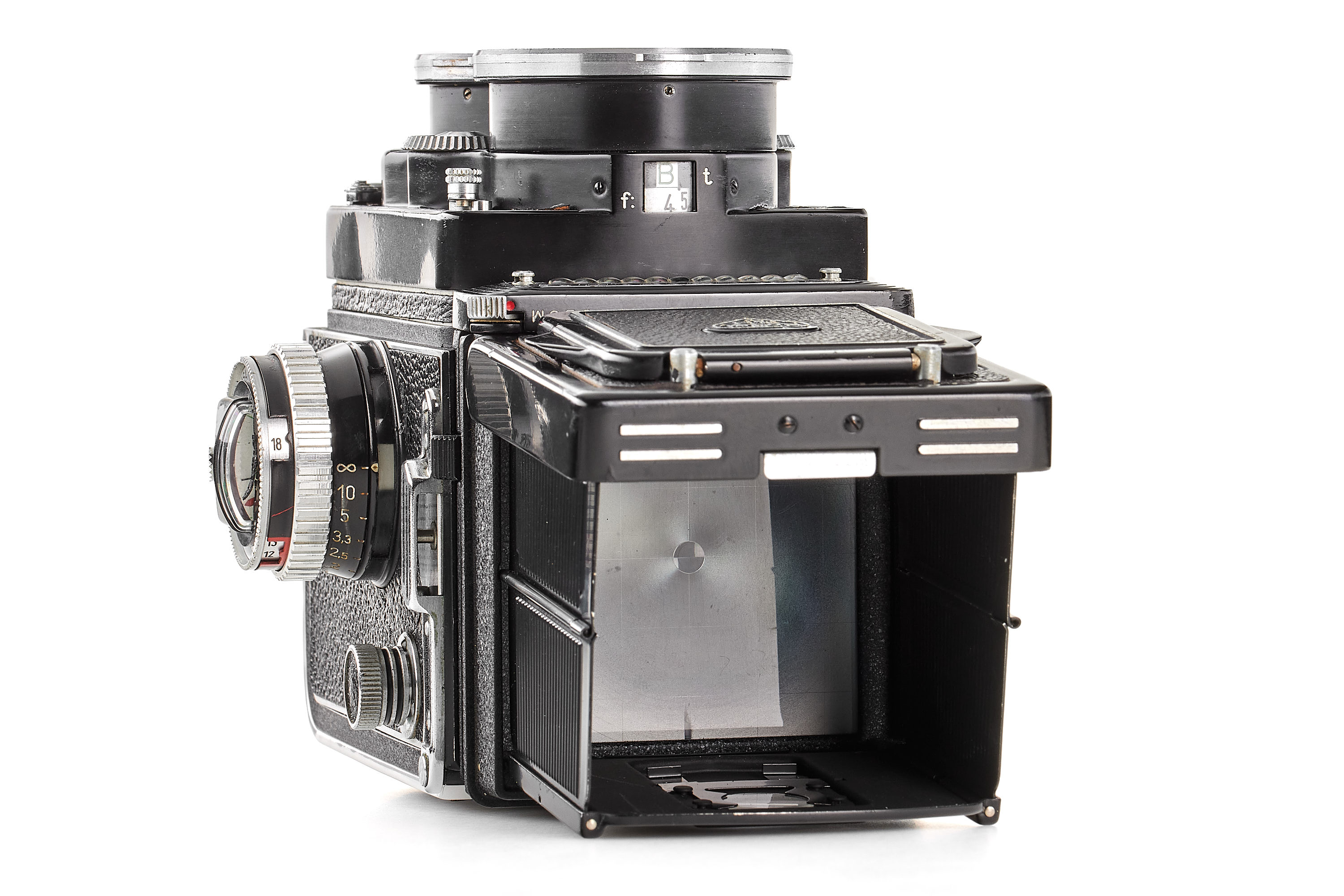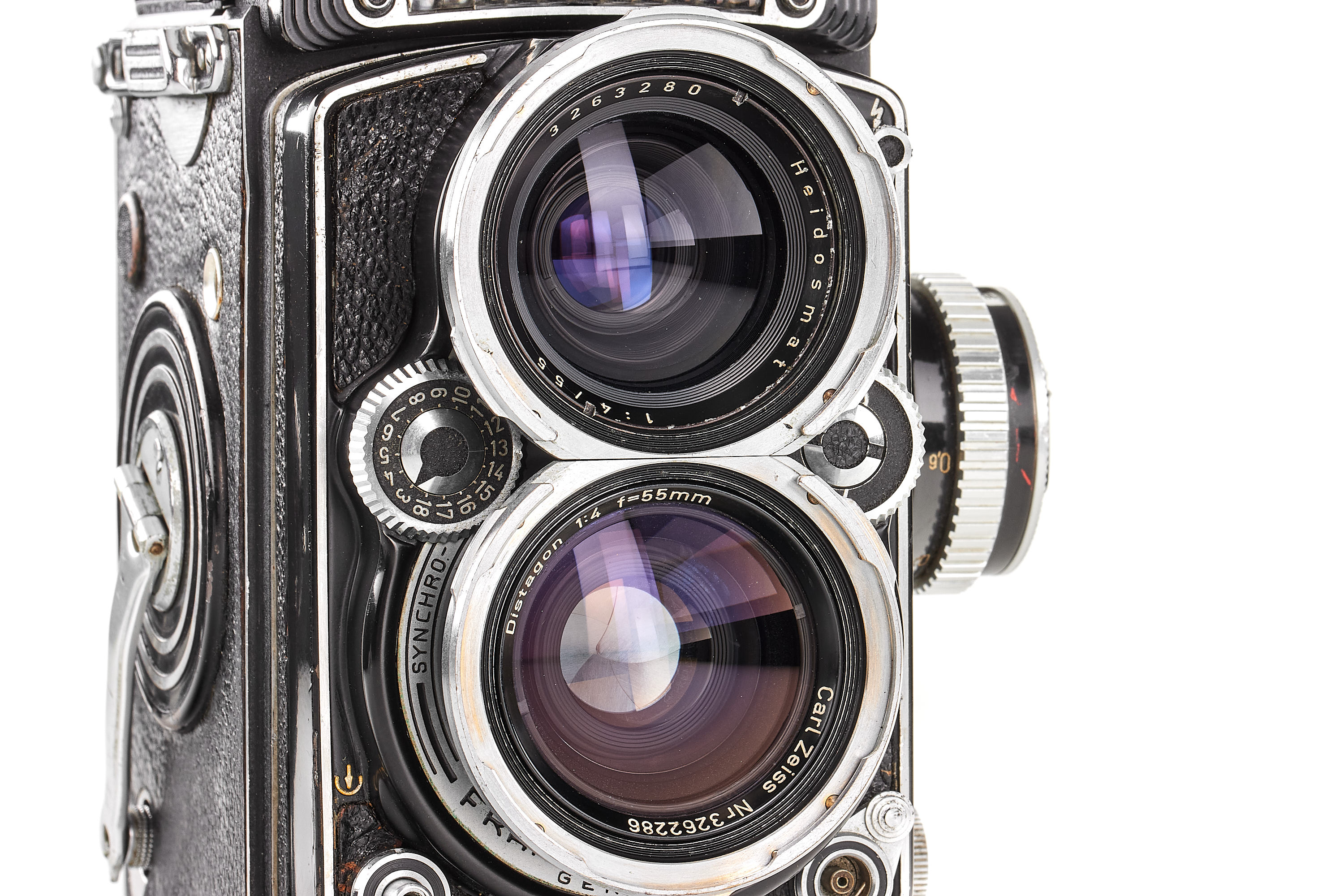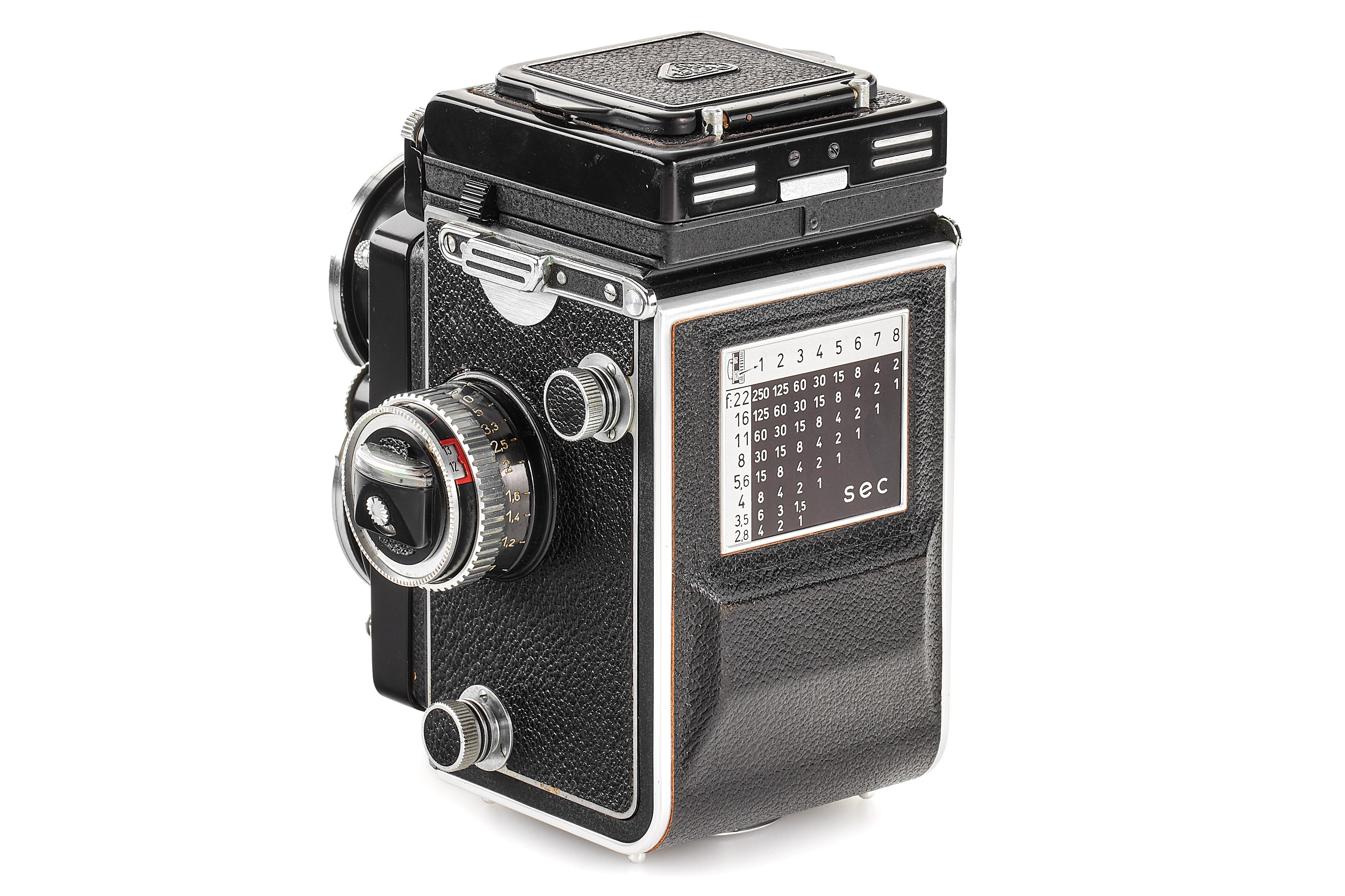 Very interesting and rare early wide angle Rolleiflex, first version in very good condition, and working order (light meter reacting but accuracy not tested), with Distagon 4/55mm no.3262286 (good optics with very few dust particles), with front lenses cap, note the absence of serial number on the front plate, probably due to a replaced part.