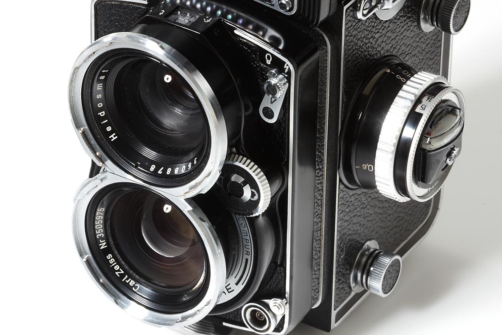 sought-after camera in beautiful condition, with exposure meter, in perfect working order, Distagon 4/55mm no.3505975 taking lens, Heidosmat 4/55mm no.3508878 viewing lens, lens cap, rare hood, original everready case