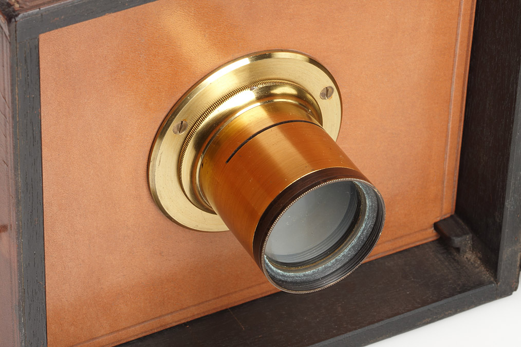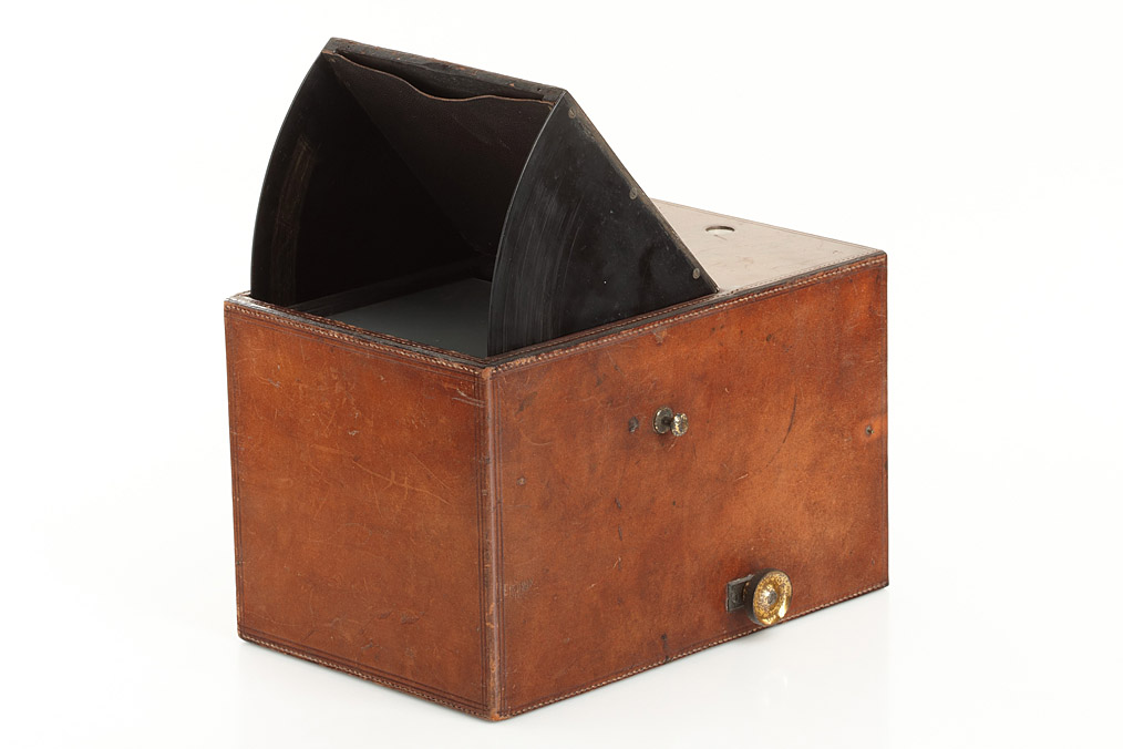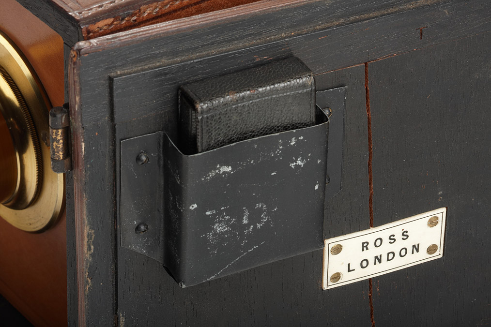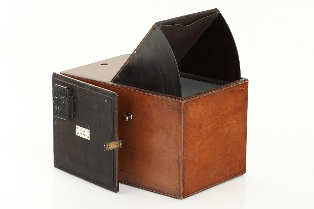 very fine Camera Obscura by Ross London, calf's leather covered wooden sliding box, brass Ross lens with waterhouse stops, image size 12x12cm, dimensions of the apparatus 25x17x16cm