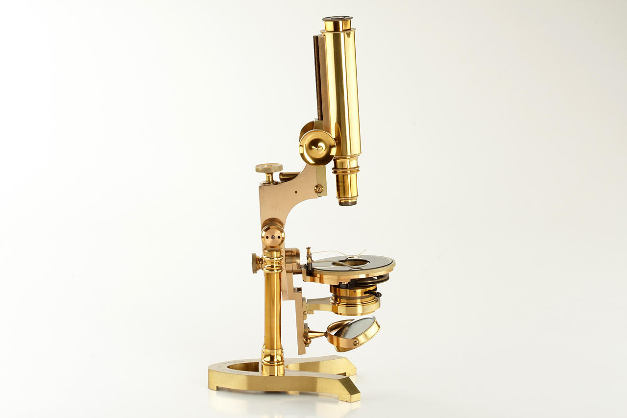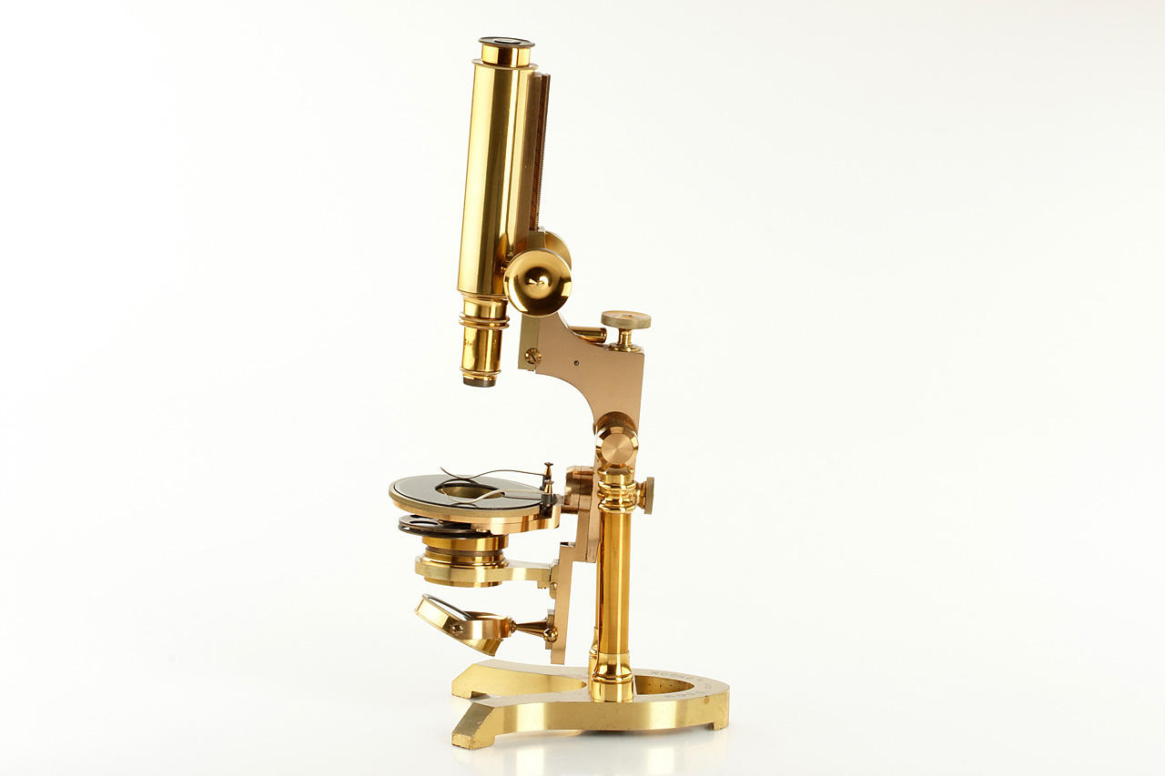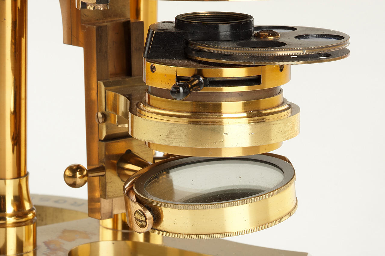 magnificent English brass microscope, base engraved with maker's name, with 3" Manley lens, eyepiece marked 1, and two other unmarked lenses, the sub-stage condenser consists of a rotating filter and aperture holder and a variable iris diaphragm, the mirror is plano-concave, the microscope is complete and in absolutely perfect condition, of course fully functional, it comes with a very interesting selection of 6 boxed micro photographs mounted on standard sample carrier: (1) micro photography labelled ‘Naughty boy’, reseller label by J. Amadio London, (2) marked ‘Jubilee Photography of her Majesty the Queen’, (3) ‘Photograph The Stage at Bay. Painted by Sir E. Landseer’, (4) portrait of Richard Cobden, printed label ‘A Photographic Curiosity for the Microscope’, (5) portrait of Dr. David Livingstone, (6) portrait of Garibaldi, all photographs are in perfect condition, also included is a selection of 10 mounted pathological specimens