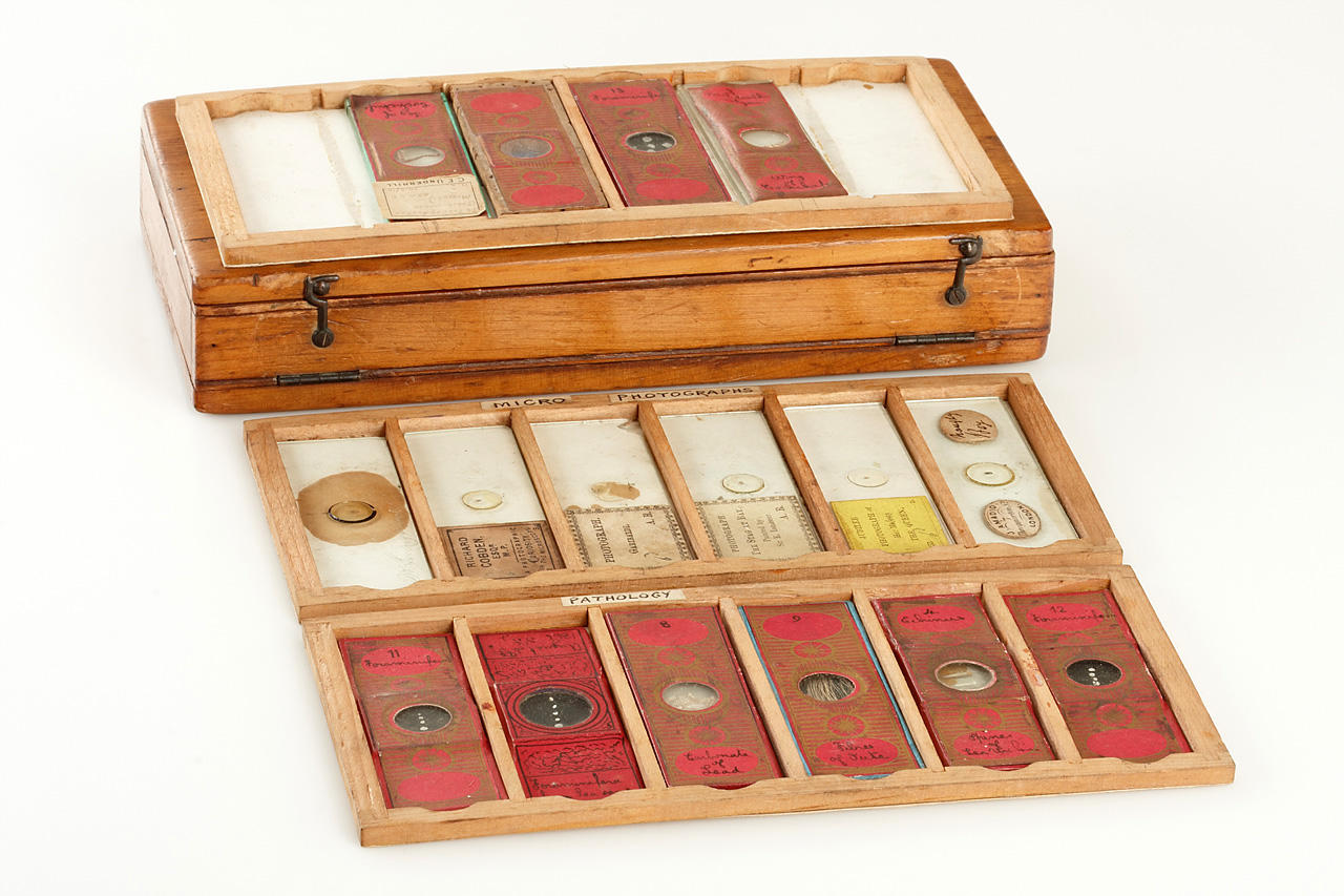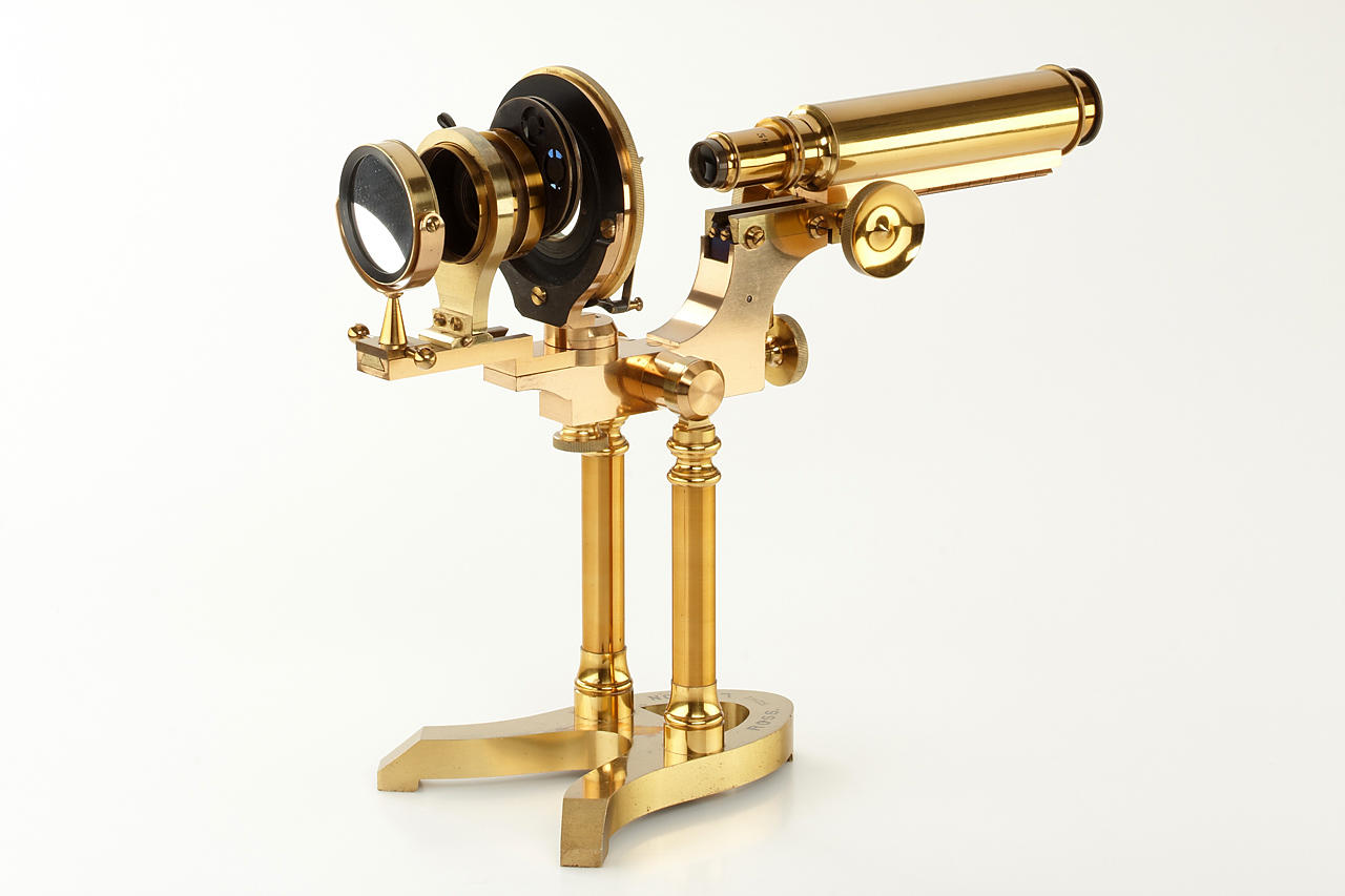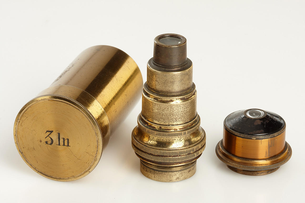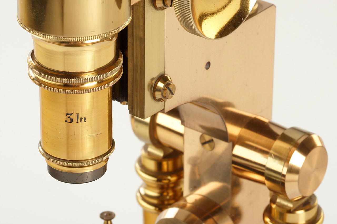 magnificent English brass microscope, base engraved with maker's name, with 3" Manley lens, eyepiece marked 1, and two other unmarked lenses, the sub-stage condenser consists of a rotating filter and aperture holder and a variable iris diaphragm, the mirror is plano-concave, the microscope is complete and in absolutely perfect condition, of course fully functional, it comes with a very interesting selection of 6 boxed micro photographs mounted on standard sample carrier: (1) micro photography labelled ‘Naughty boy’, reseller label by J. Amadio London, (2) marked ‘Jubilee Photography of her Majesty the Queen’, (3) ‘Photograph The Stage at Bay. Painted by Sir E. Landseer’, (4) portrait of Richard Cobden, printed label ‘A Photographic Curiosity for the Microscope’, (5) portrait of Dr. David Livingstone, (6) portrait of Garibaldi, all photographs are in perfect condition, also included is a selection of 10 mounted pathological specimens