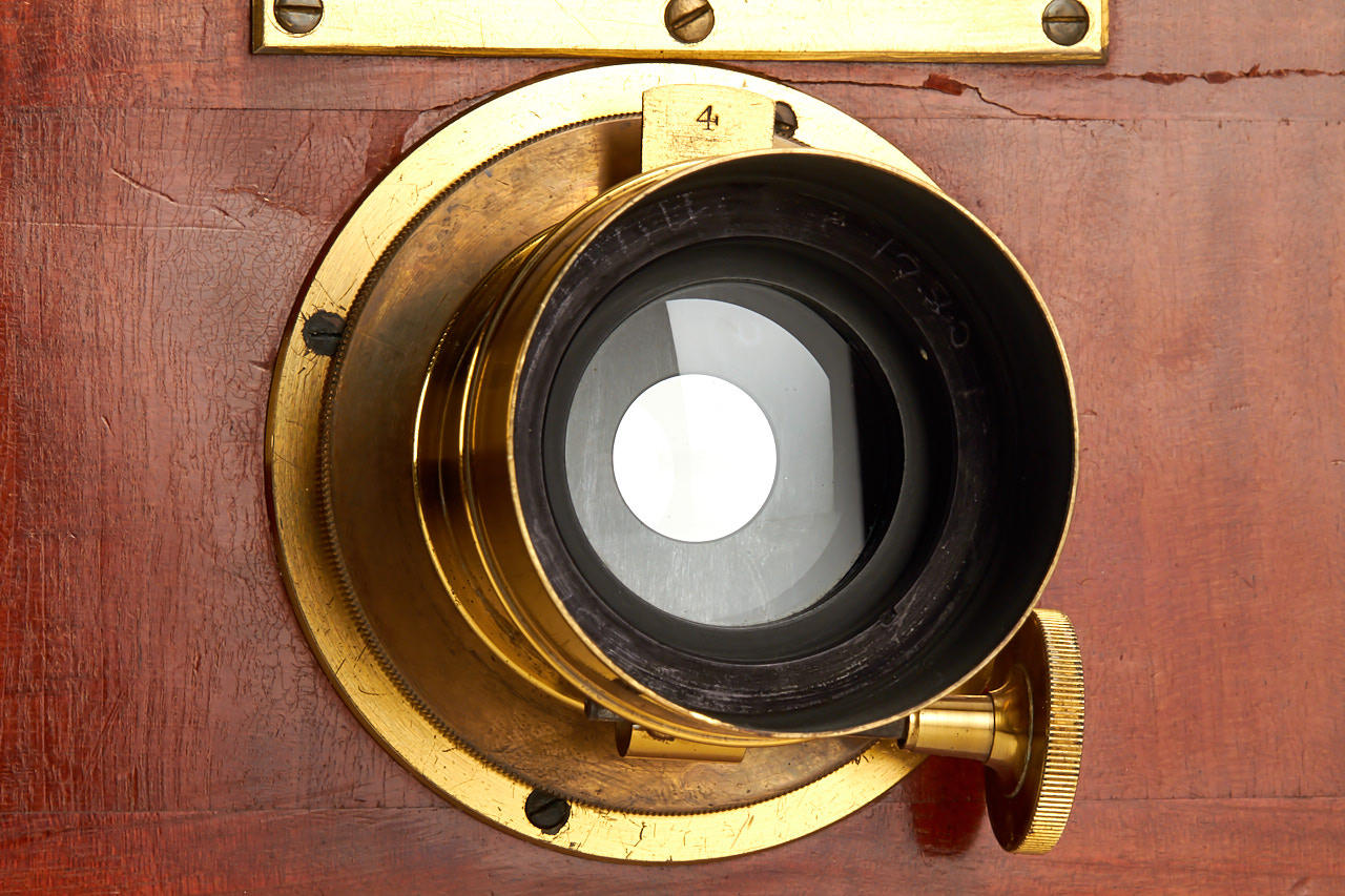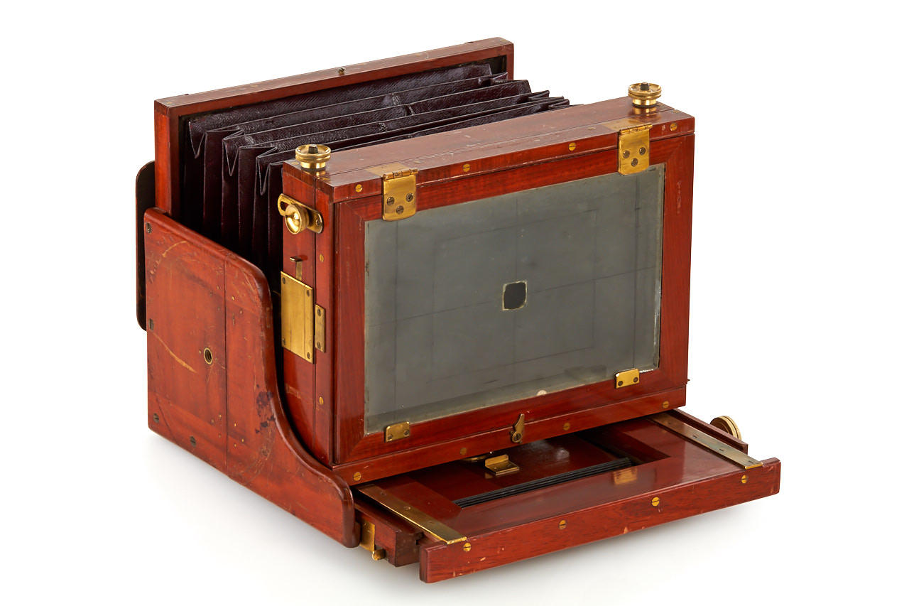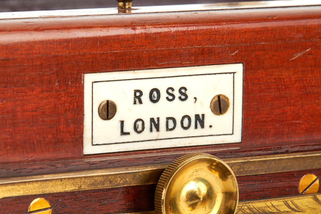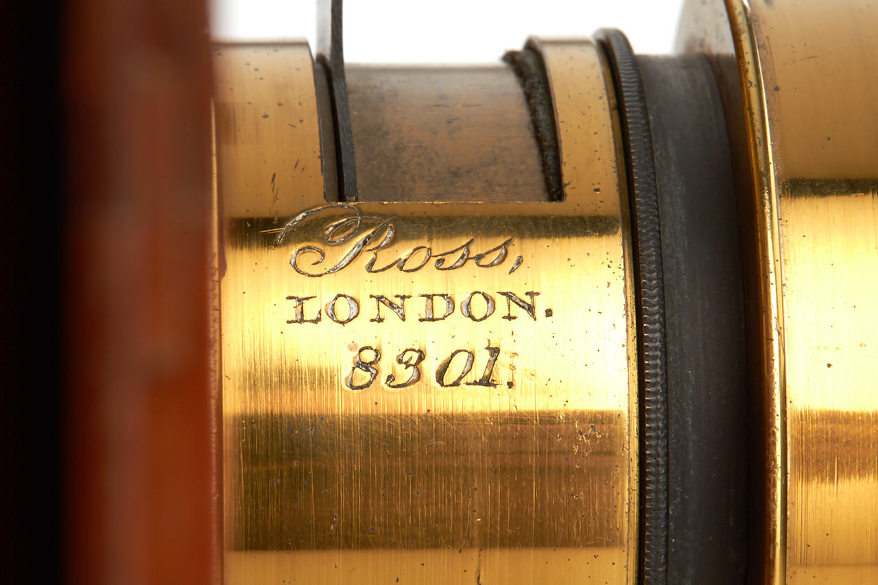 mahogany stereo tailboard camera in excellent condition, for panoramic exposures c.13x20cm, or stereo exposures (lenses not included), maker's plaque on front 'Ross, London', with Ross brass lens no.8301