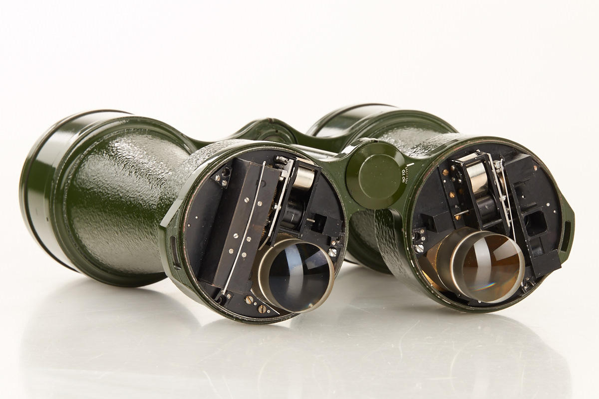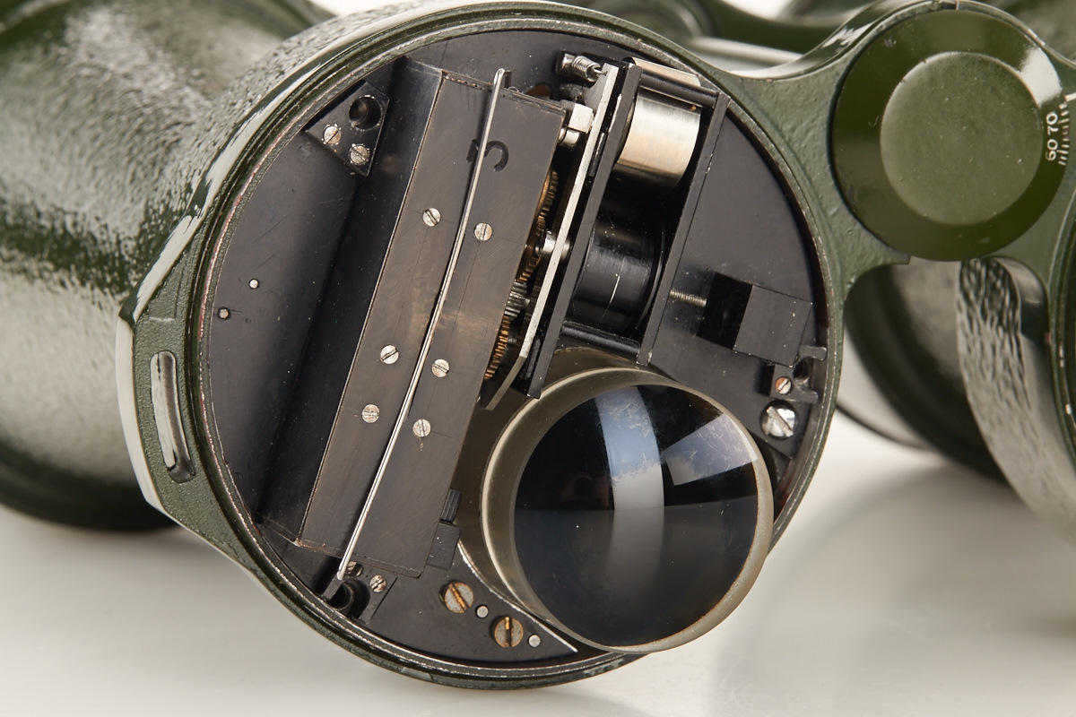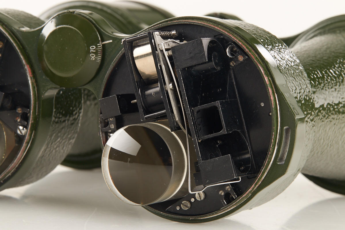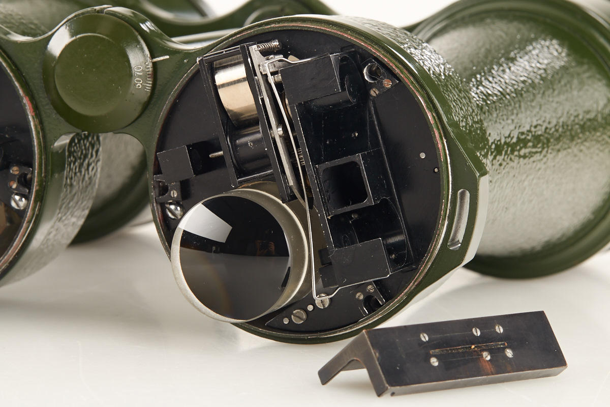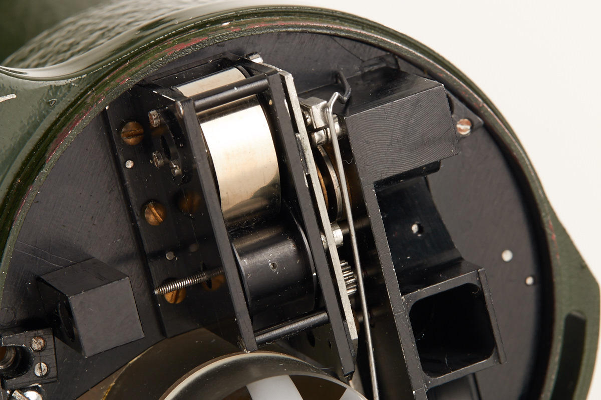 This clandestine subminiature Tele camera in form of a Ross No. 5 Mk IV binocular, was a very robust optical instrument used by the military and had provisions for use under tropical conditions. The designer of the clandestine camera changed the optical part of the binocular from 7x50 to 10x45 and integrated two very small motorized subminiature cameras for thin base film in dedicated cassettes. The cameras, that work independently and whose parts were milled from the solid, are cleverly positioned in the light path of the Porro prism arrangements: the first of the usual three prisms was replaced by a semi-transparent mirror whose outer form and size are that of a prism. Both cameras have their own small lenses and sit in the optical axle of the binocular objectives, ideal for best photographic results. Negative format of the cameras is 8x8mm, the cassettes have some similarities with Minox cassettes, but are smaller and not interchangeable. The lamellary shutter in form of a rotating disk and the film transport are powered by two highly sophisticated clockwork motors. The rotating lamellary shutters are different and probably rendered two different exposure times (the cameras have different slit widths and different rotation speeds of the shutter), which may be an explanation for the fact that not one, but two cameras were integrated. About 100 exposures can be made with each camera, before they have to be rewound and the film cassettes changed, which demands for a removal of the prism housings. The shutters are tripped by pressing of one of the two chrome plated screw heads on the prism housings (that in the original binocular serve for flooding the binocular halves with dry air or nitrogen to prevent haze and fungus). The cameras lack the cassettes, the green outer painting seems to have been renewed at some time. All in all a superbly made clandestine military camera that was totally unknown to collectors until now. We highly suspect a military origin of this device, as the design is far too complicated and the execution of the optics and mechanics is far too professional for any amateur workshop or forger.