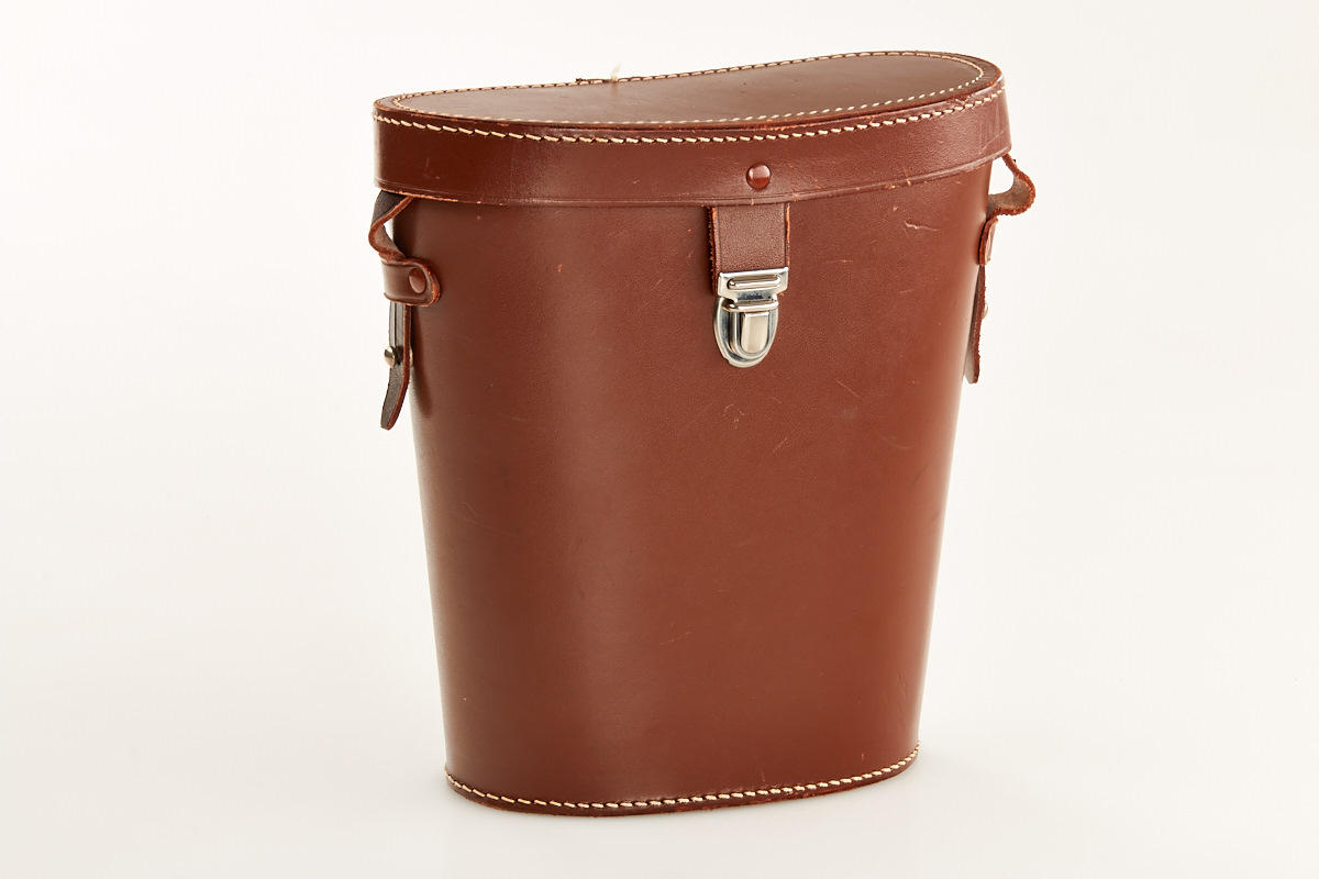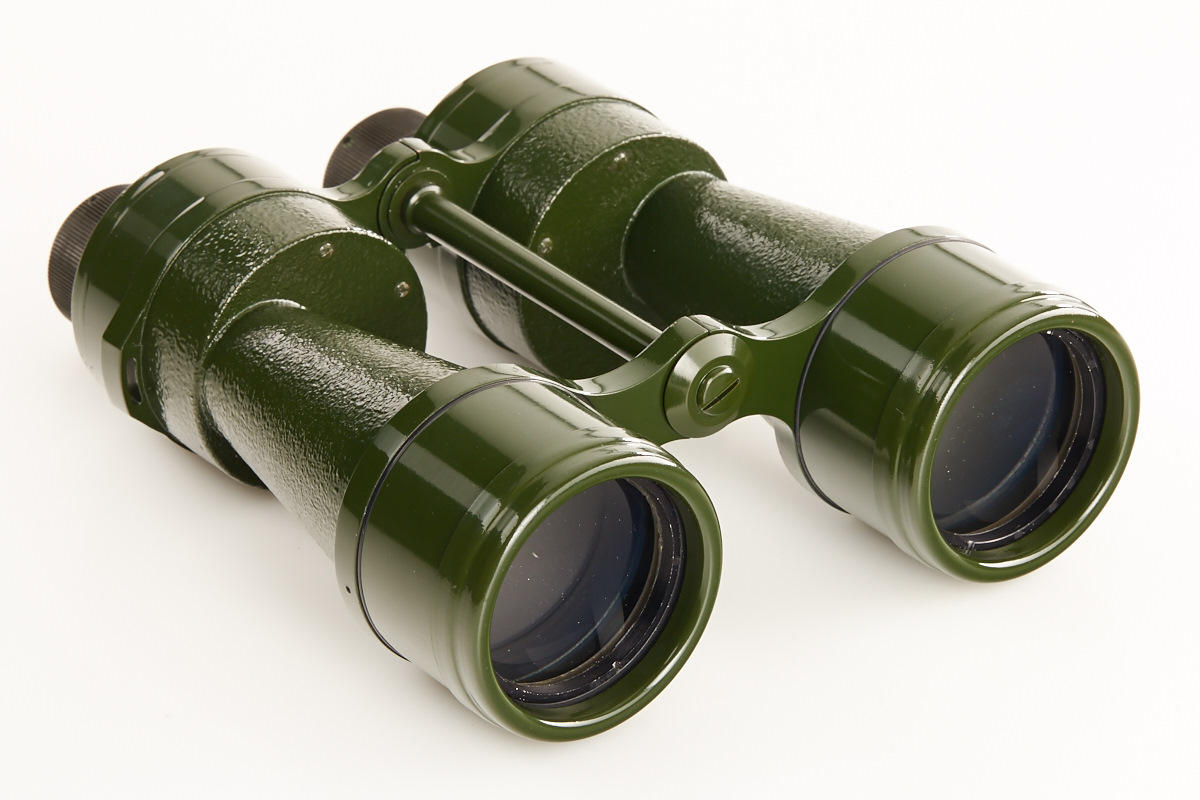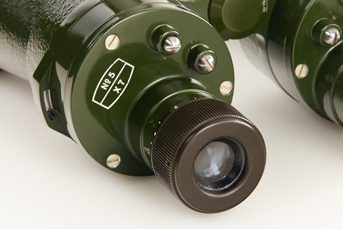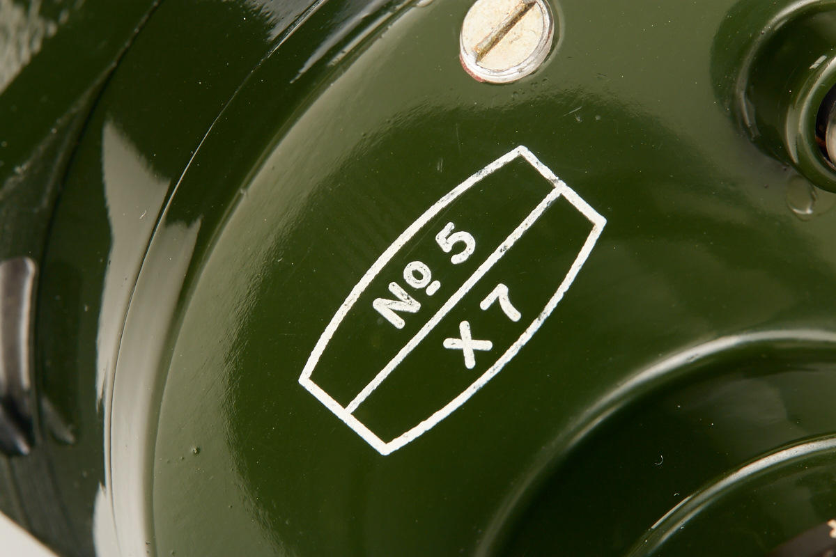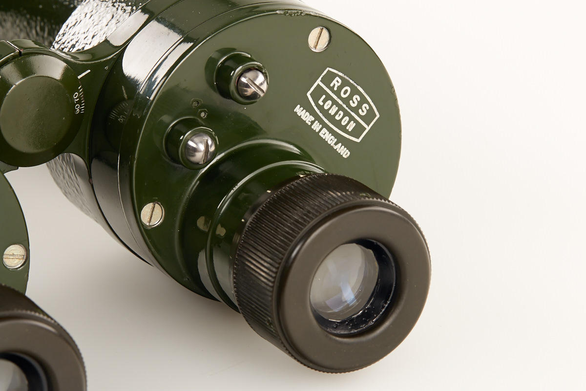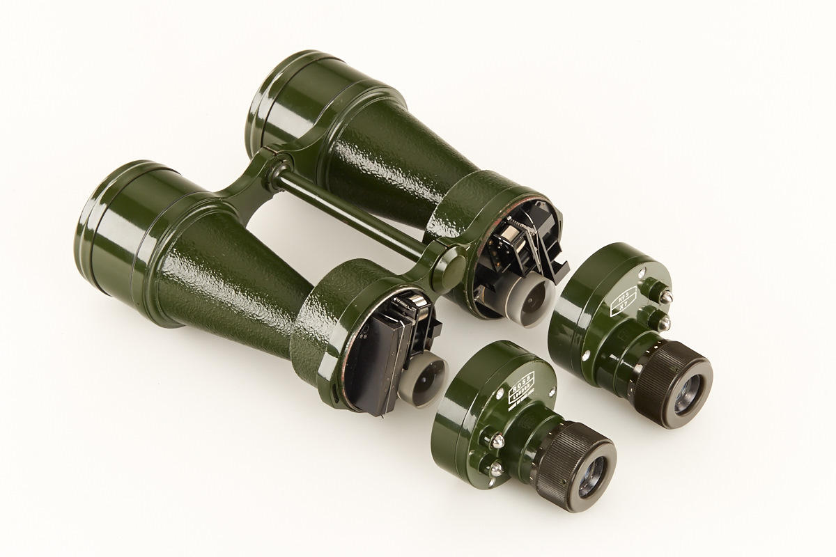 This clandestine subminiature Tele camera in form of a Ross No. 5 Mk IV binocular, was a very robust optical instrument used by the military and had provisions for use under tropical conditions. The designer of the clandestine camera changed the optical part of the binocular from 7x50 to 10x45 and integrated two very small motorized subminiature cameras for thin base film in dedicated cassettes. The cameras, that work independently and whose parts were milled from the solid, are cleverly positioned in the light path of the Porro prism arrangements: the first of the usual three prisms was replaced by a semi-transparent mirror whose outer form and size are that of a prism. Both cameras have their own small lenses and sit in the optical axle of the binocular objectives, ideal for best photographic results. Negative format of the cameras is 8x8mm, the cassettes have some similarities with Minox cassettes, but are smaller and not interchangeable. The lamellary shutter in form of a rotating disk and the film transport are powered by two highly sophisticated clockwork motors. The rotating lamellary shutters are different and probably rendered two different exposure times (the cameras have different slit widths and different rotation speeds of the shutter), which may be an explanation for the fact that not one, but two cameras were integrated. About 100 exposures can be made with each camera, before they have to be rewound and the film cassettes changed, which demands for a removal of the prism housings. The shutters are tripped by pressing of one of the two chrome plated screw heads on the prism housings (that in the original binocular serve for flooding the binocular halves with dry air or nitrogen to prevent haze and fungus). The cameras lack the cassettes, the green outer painting seems to have been renewed at some time. All in all a superbly made clandestine military camera that was totally unknown to collectors until now. We highly suspect a military origin of this device, as the design is far too complicated and the execution of the optics and mechanics is far too professional for any amateur workshop or forger.