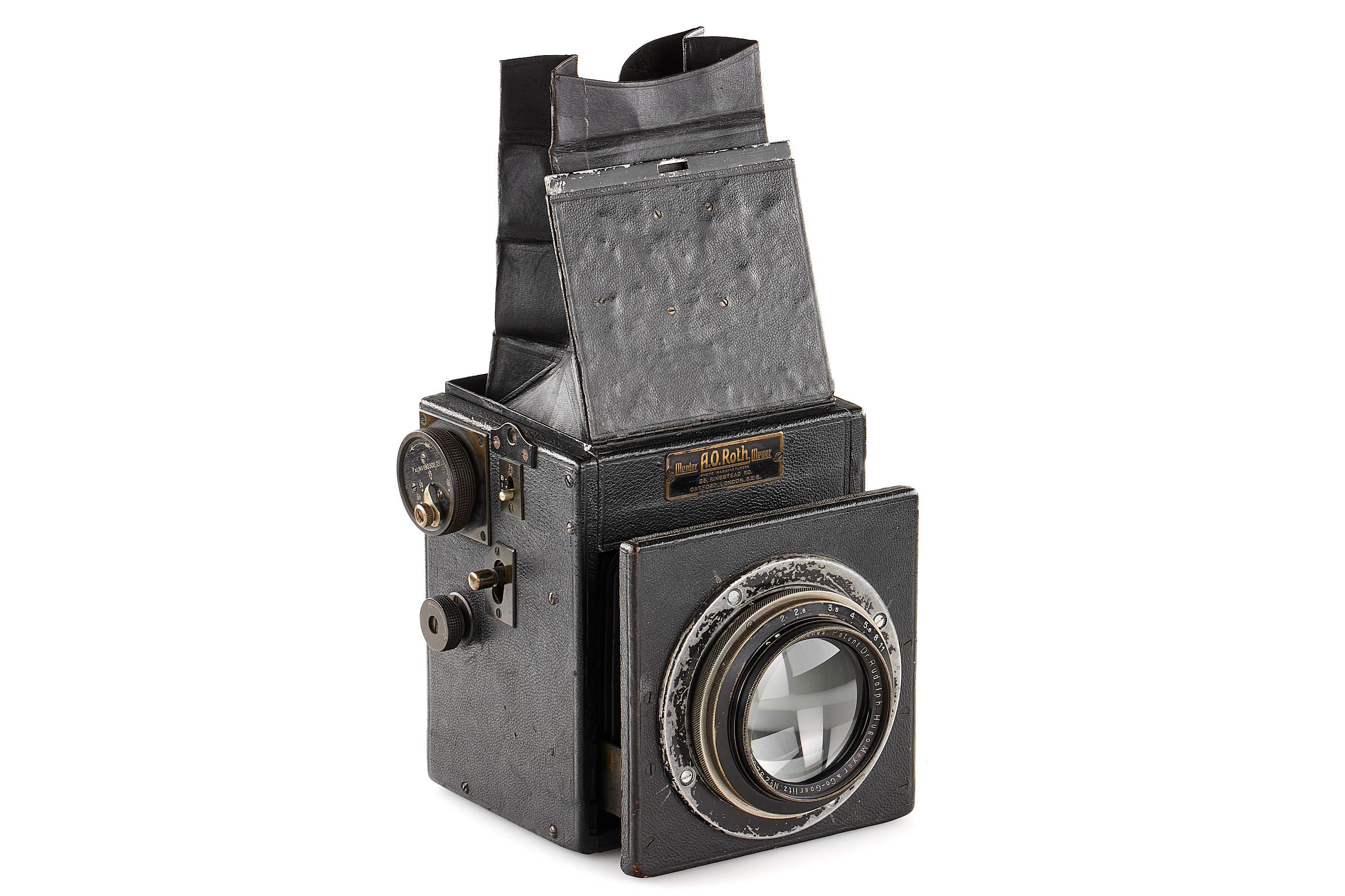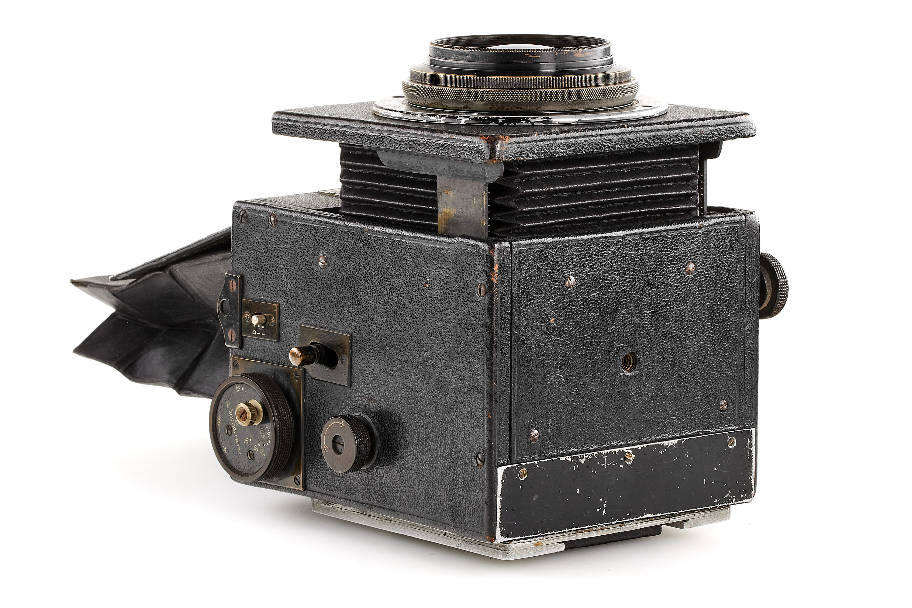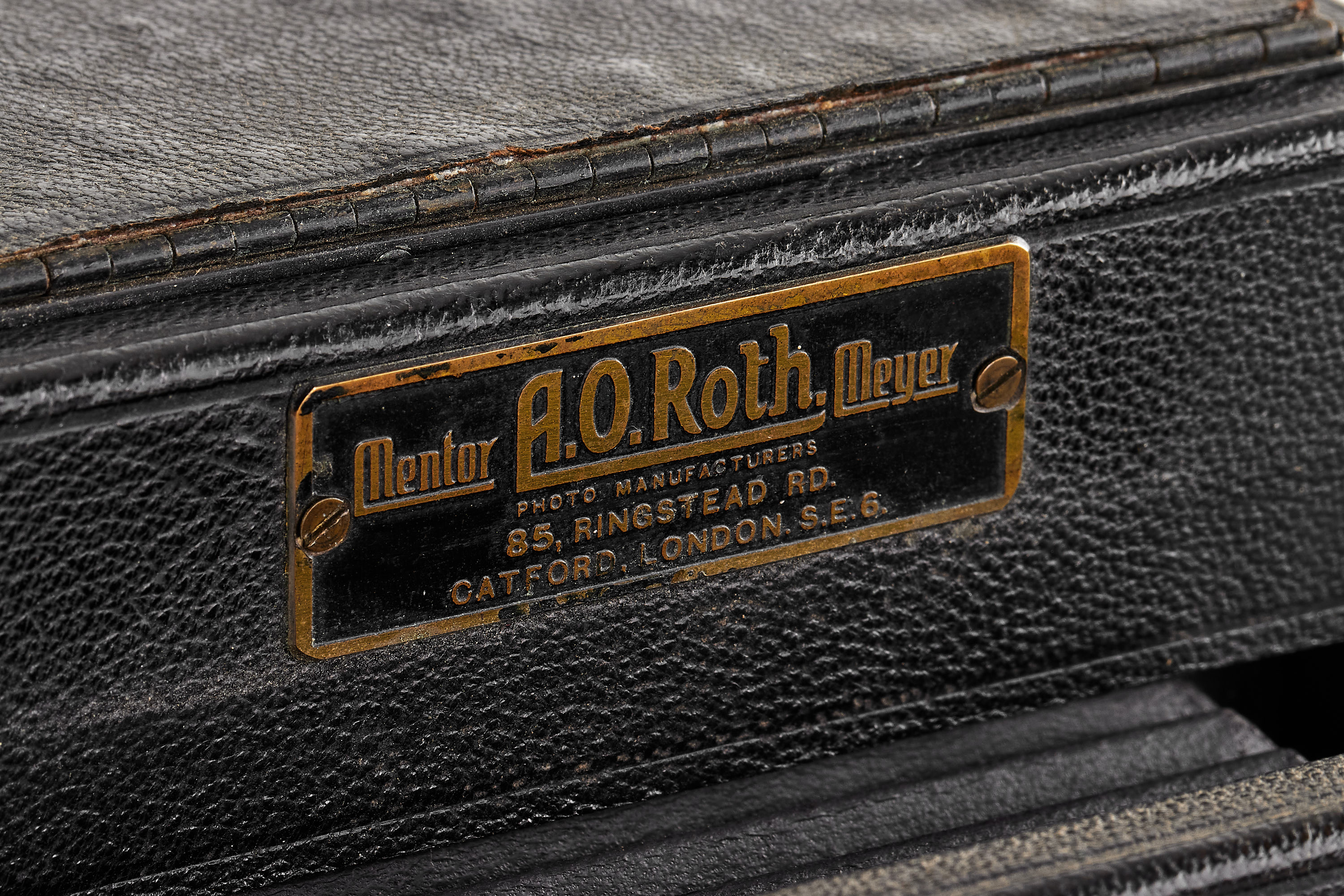 Very rare reflex camera for 4.5x6cm with focal plane shutter to 1/1000 sec., made by Roth, an English importer of Mentor and Meyer cameras and lenses, in used condition, the shutter needs attention, modified with a rotating back, together with fast, rare sought-after Meyer Goerlitz Plasmat 2/4" no.292022 with good optics only showing some cleaning marks.