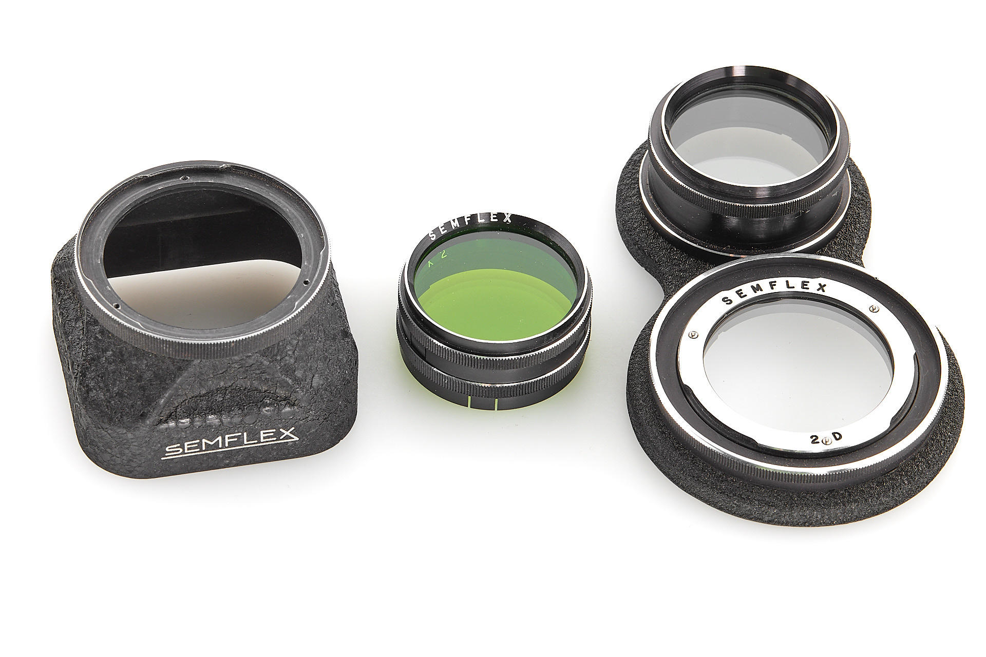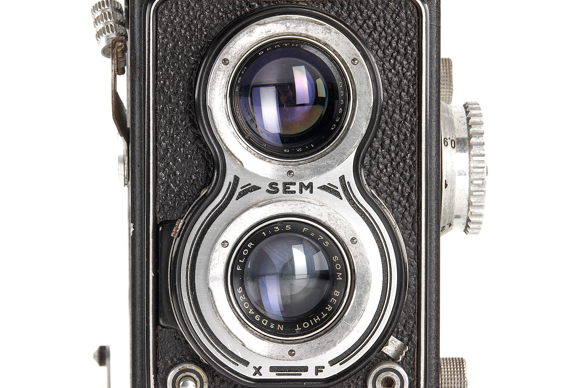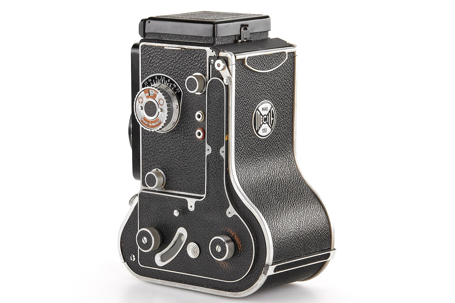 French 6x6 TLR camera in good cosmetic condition and working order, with Som Berthiot Flor 3.5/75mm no.D94026 showing some cleaning marks, with very rare Mecila 150 magazine, yellow and green filters, close up attachment and hood