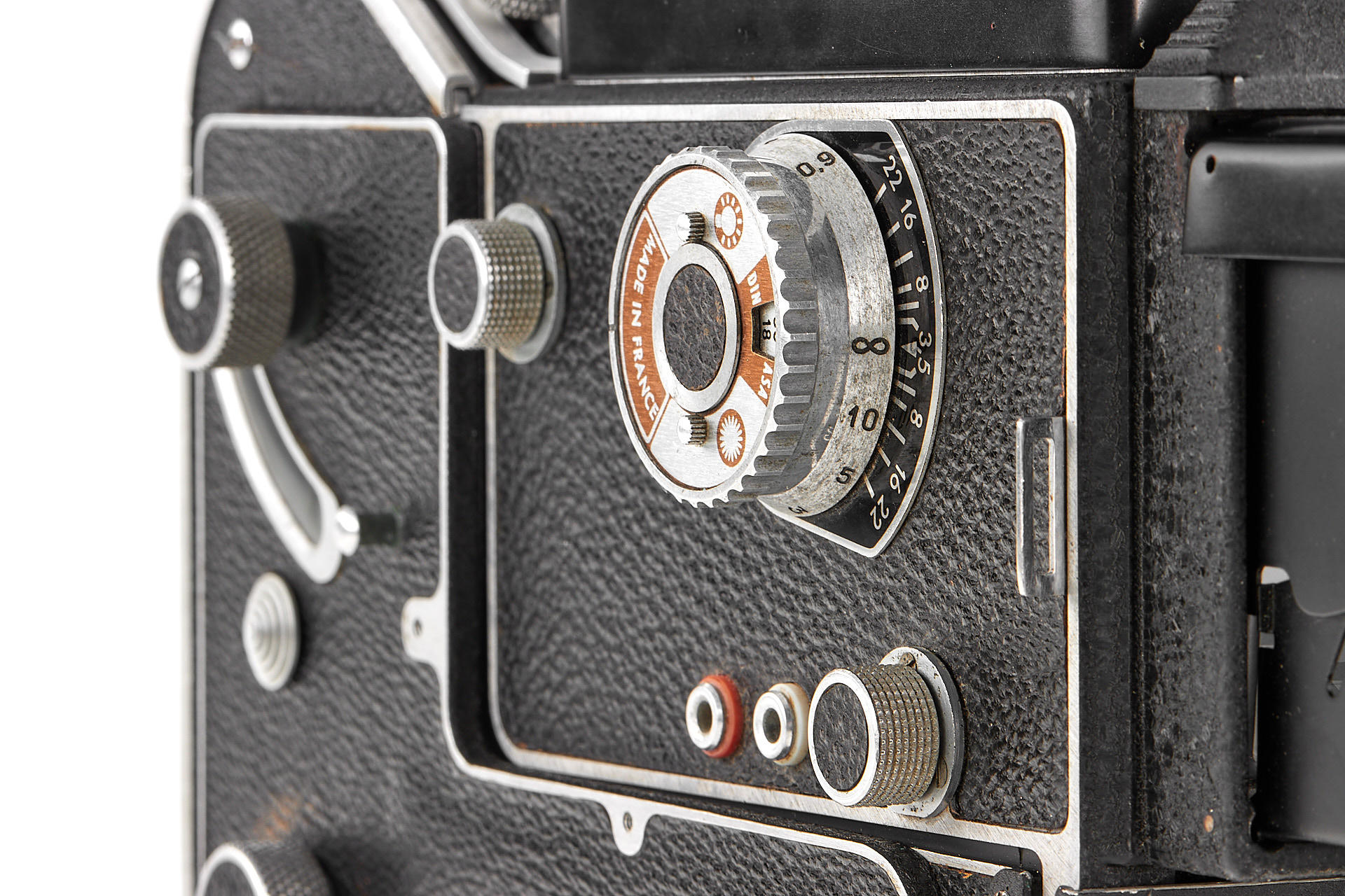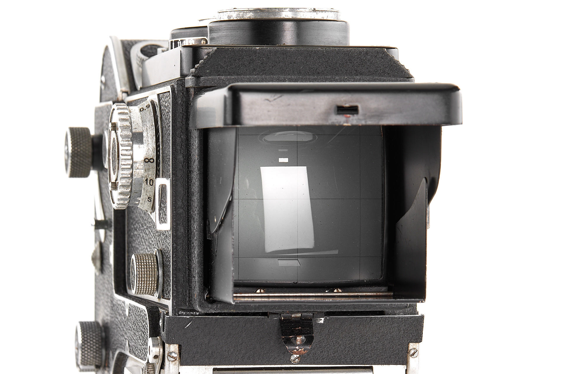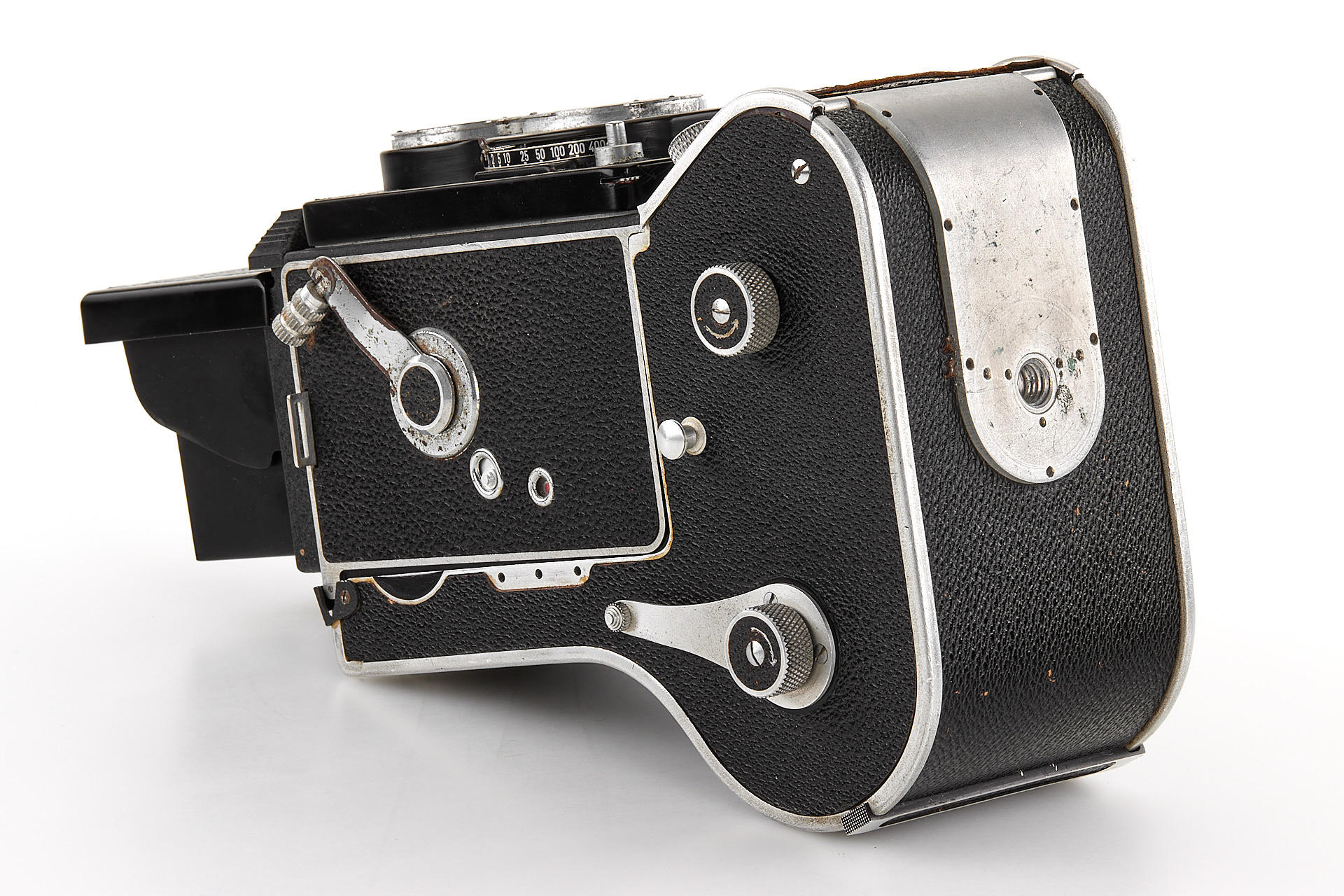 French 6x6 TLR camera in good cosmetic condition and working order, with Som Berthiot Flor 3.5/75mm no.D94026 showing some cleaning marks, with very rare Mecila 150 magazine, yellow and green filters, close up attachment and hood