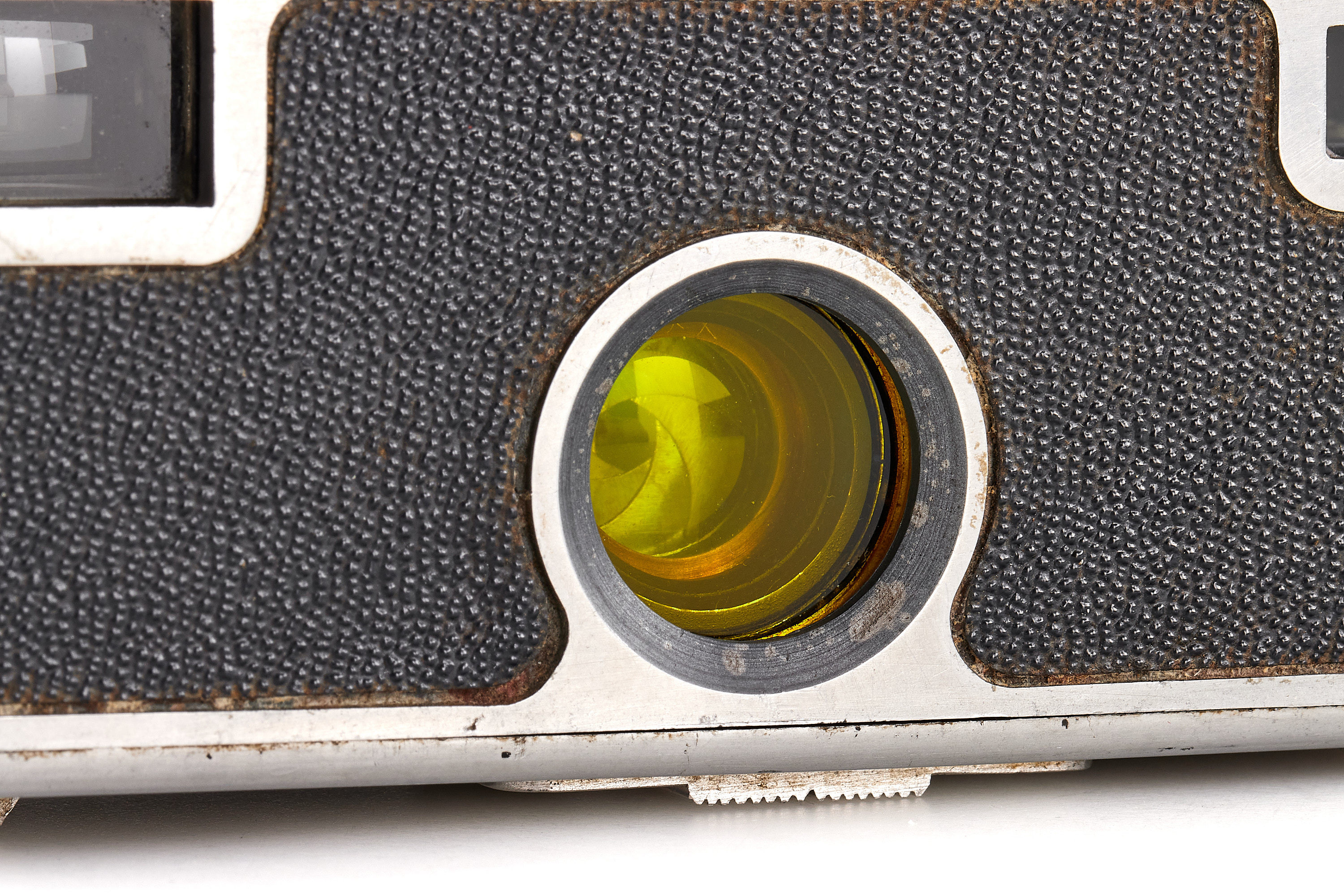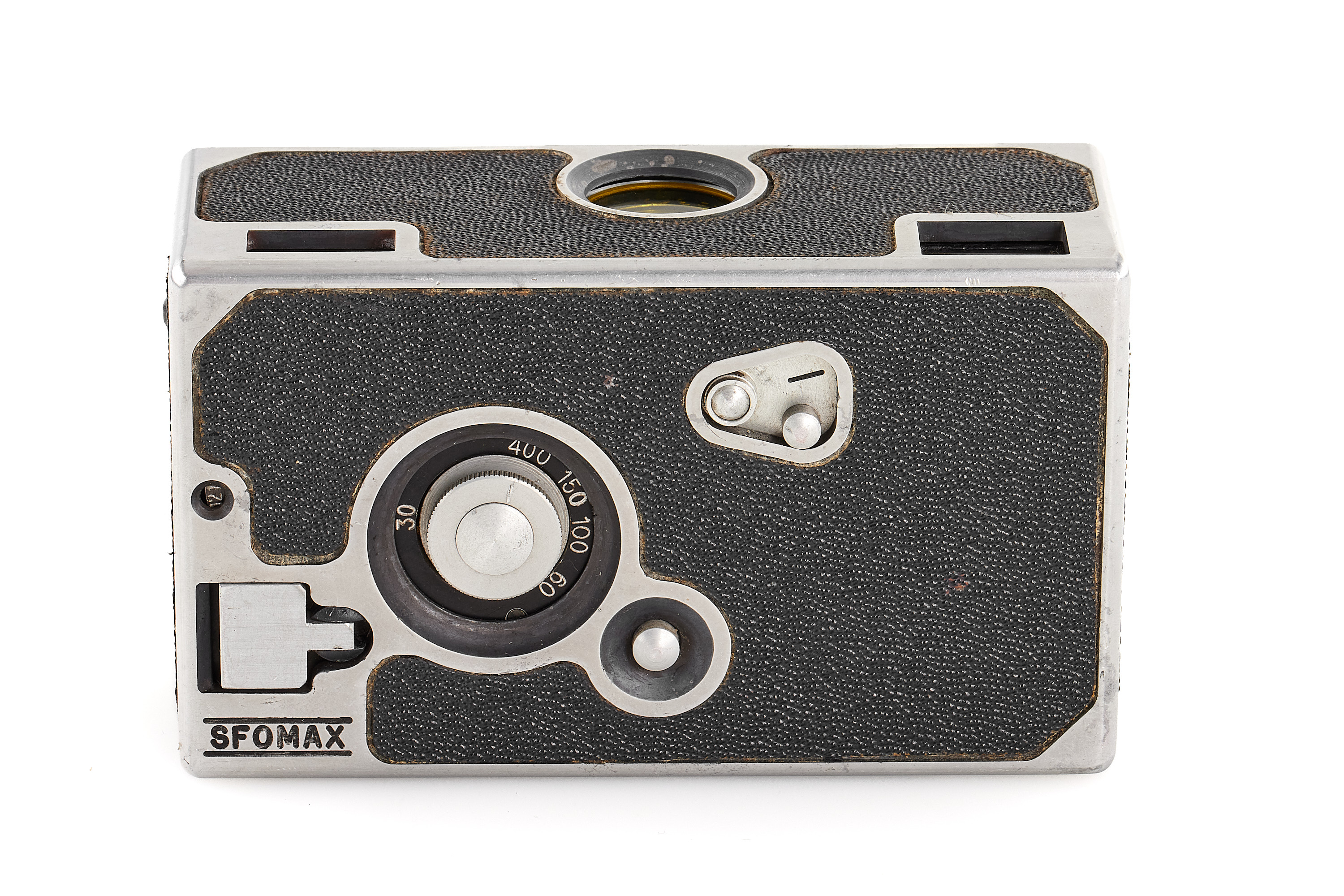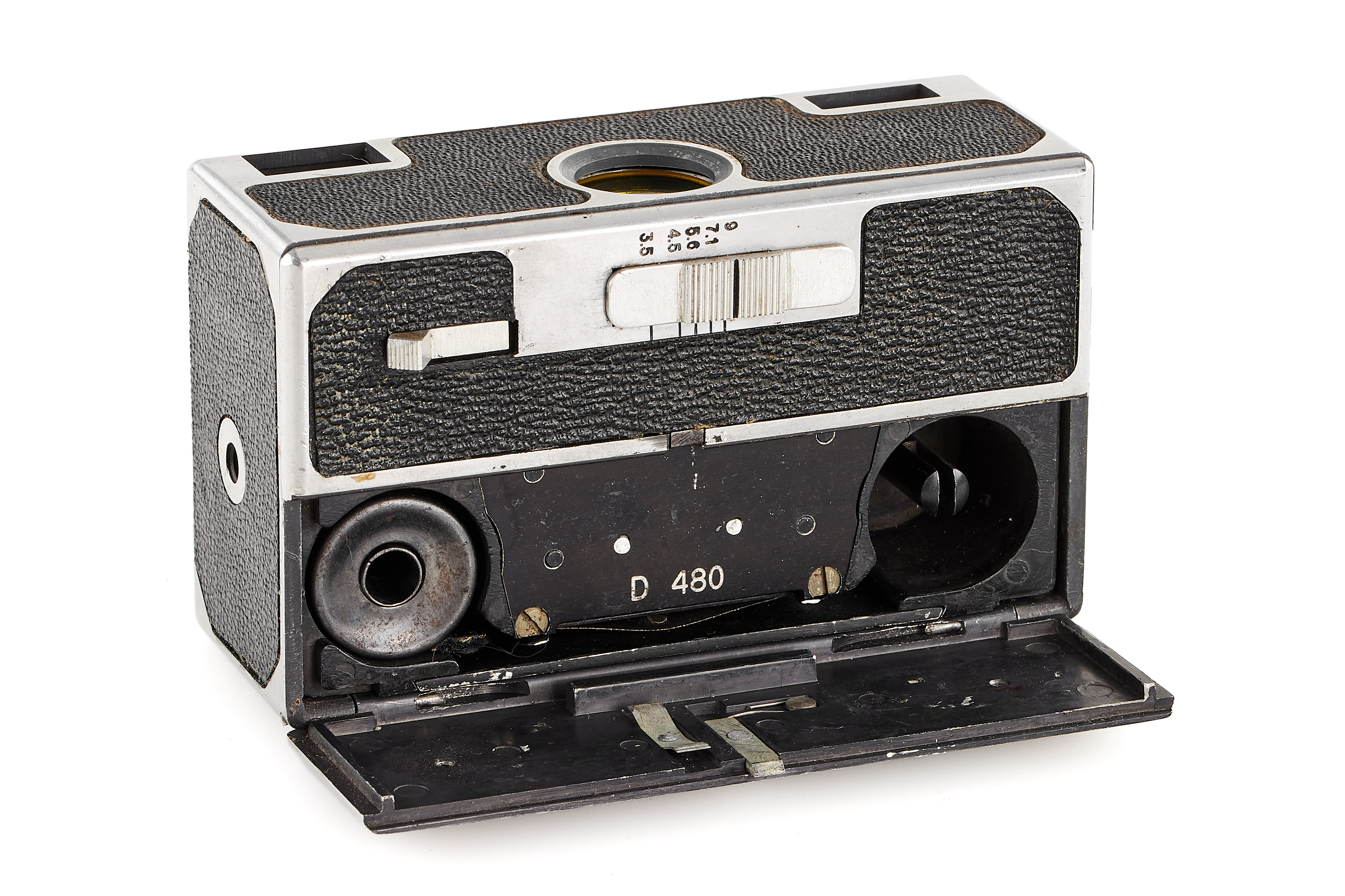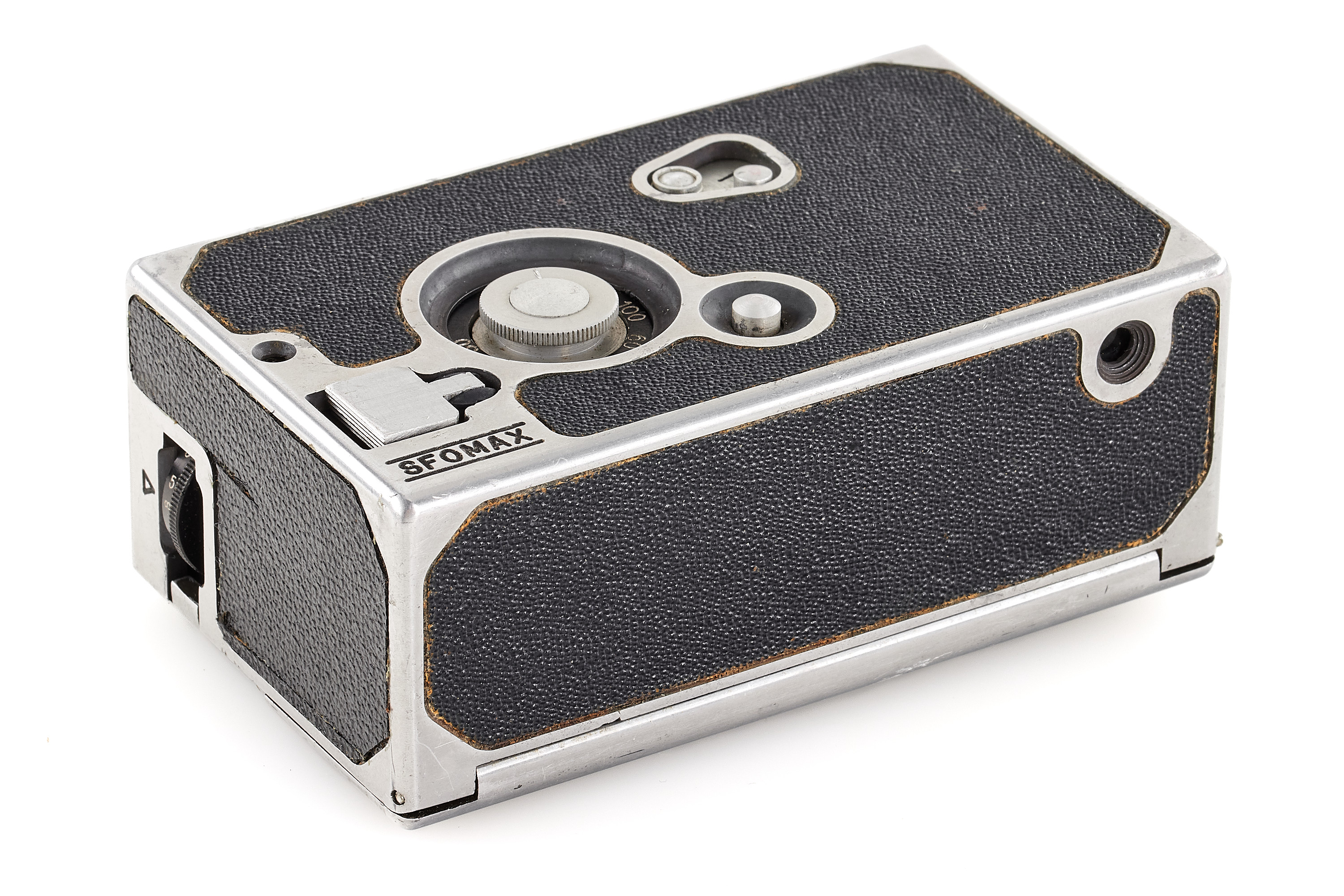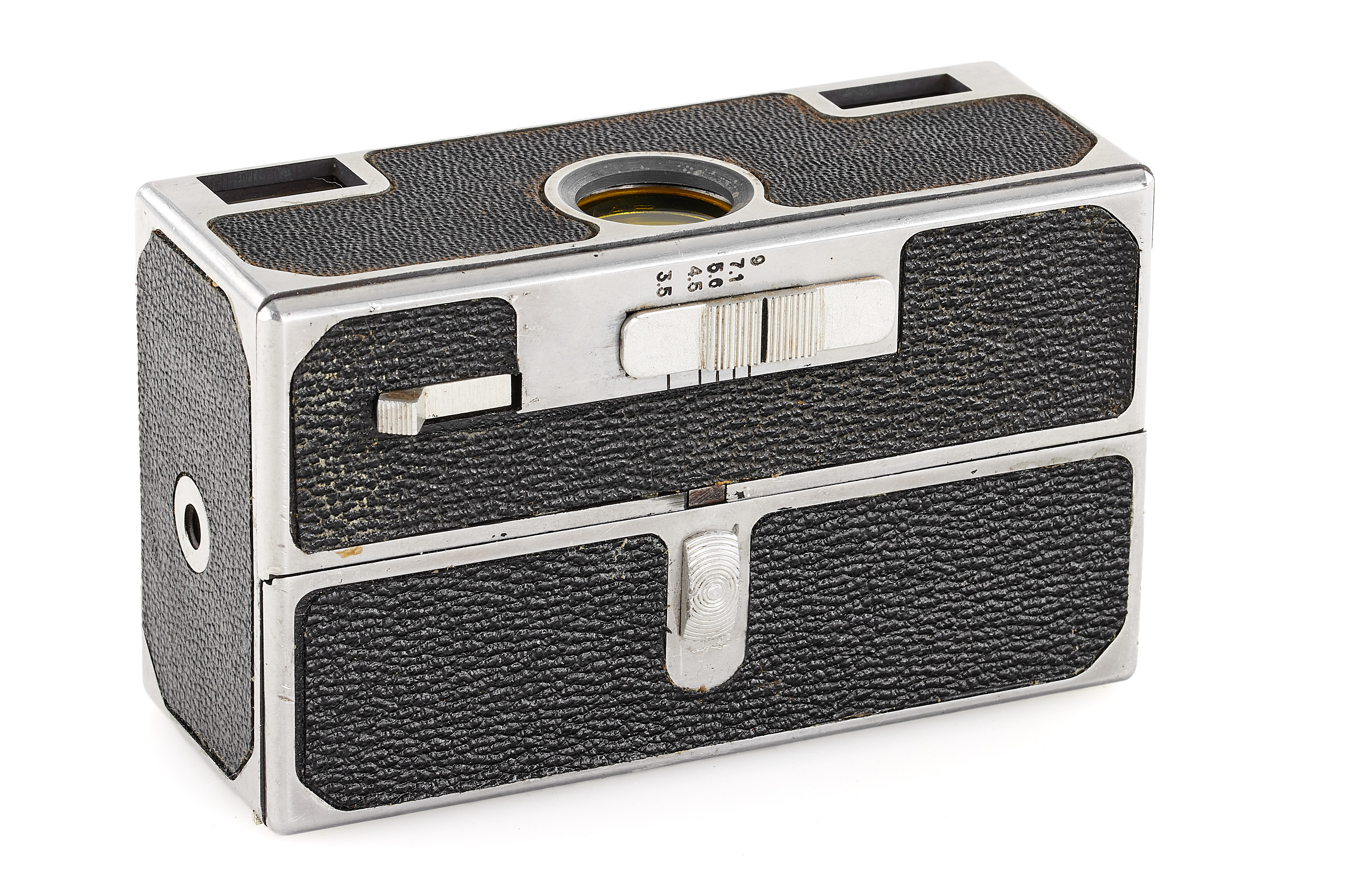 Rare French cast aluminium subminiature camera for 20 exposures 14x23mm on unperforated 16mm film, black leatherette covering, shutter 1/30-1/400, very good condition.