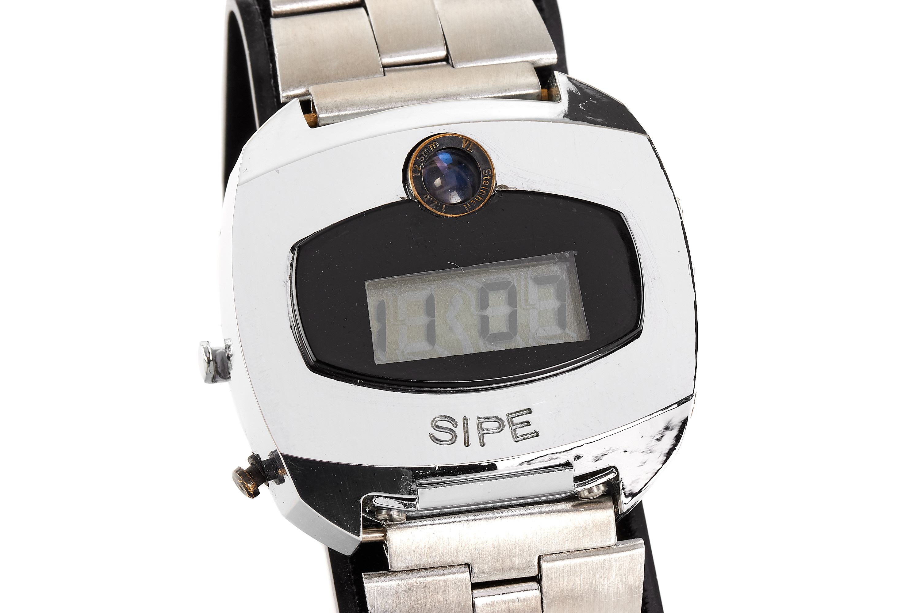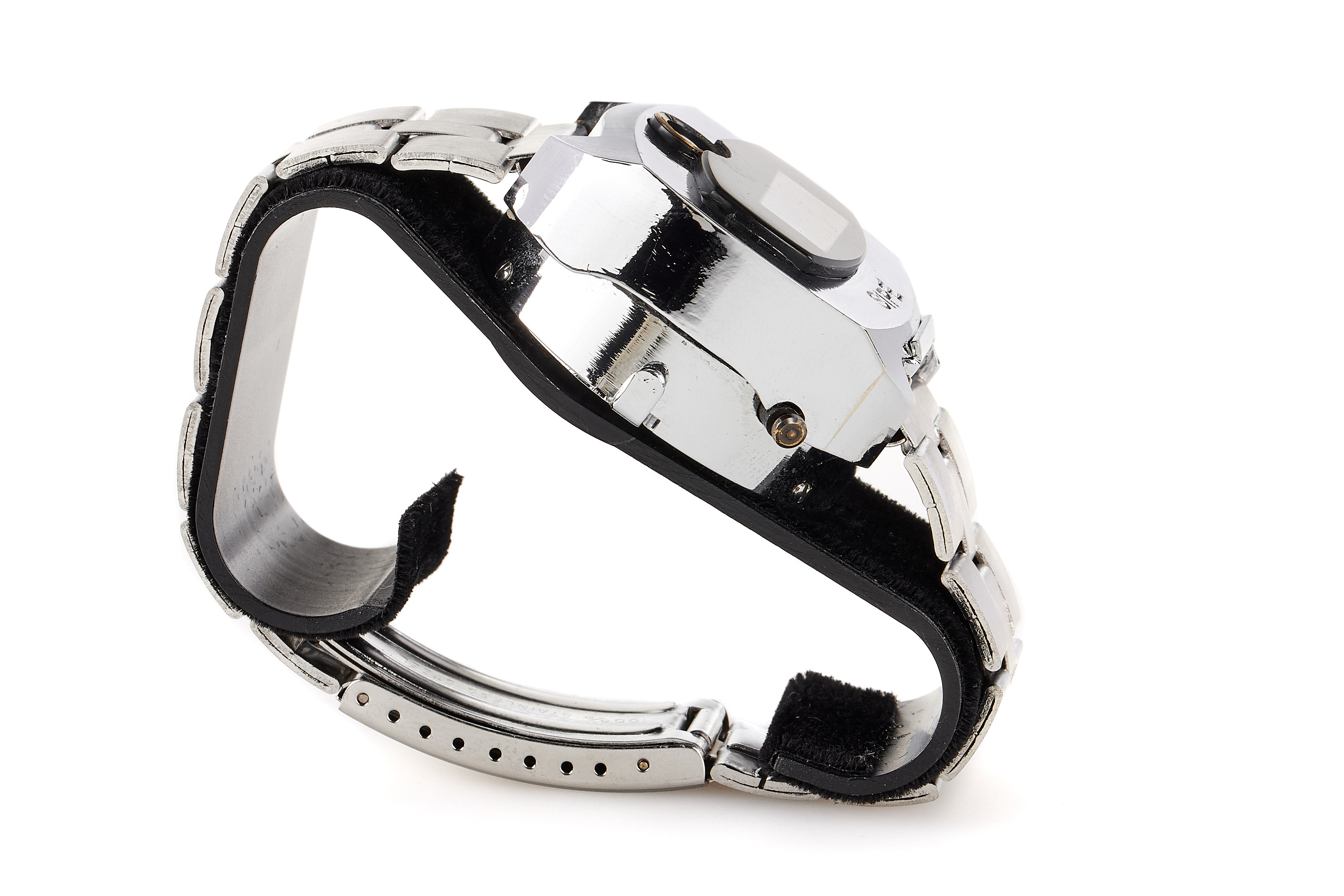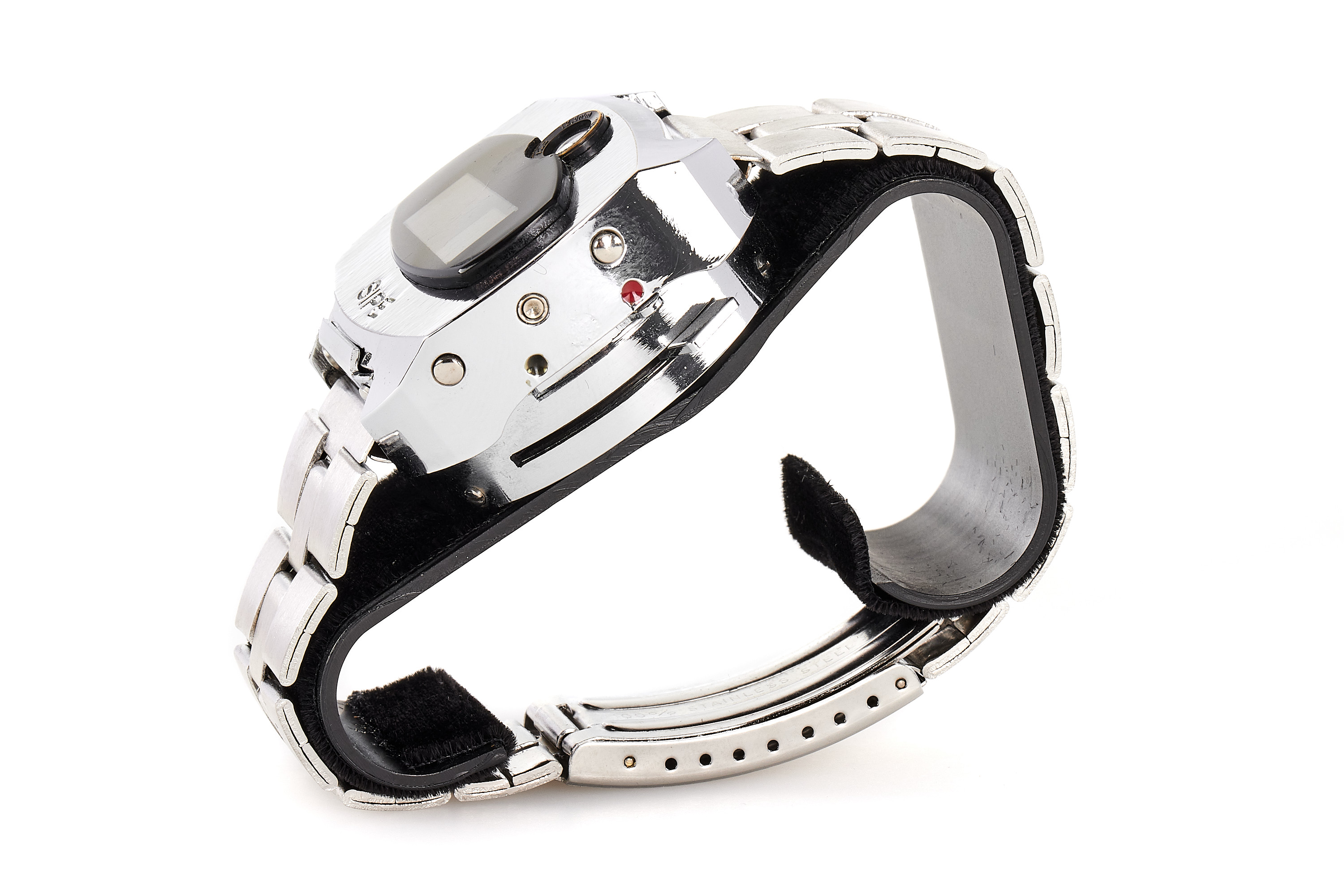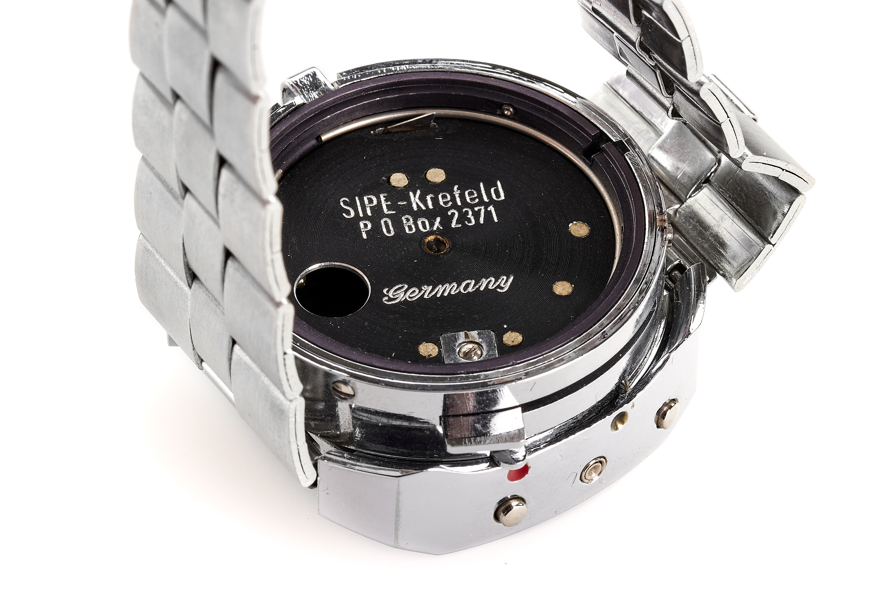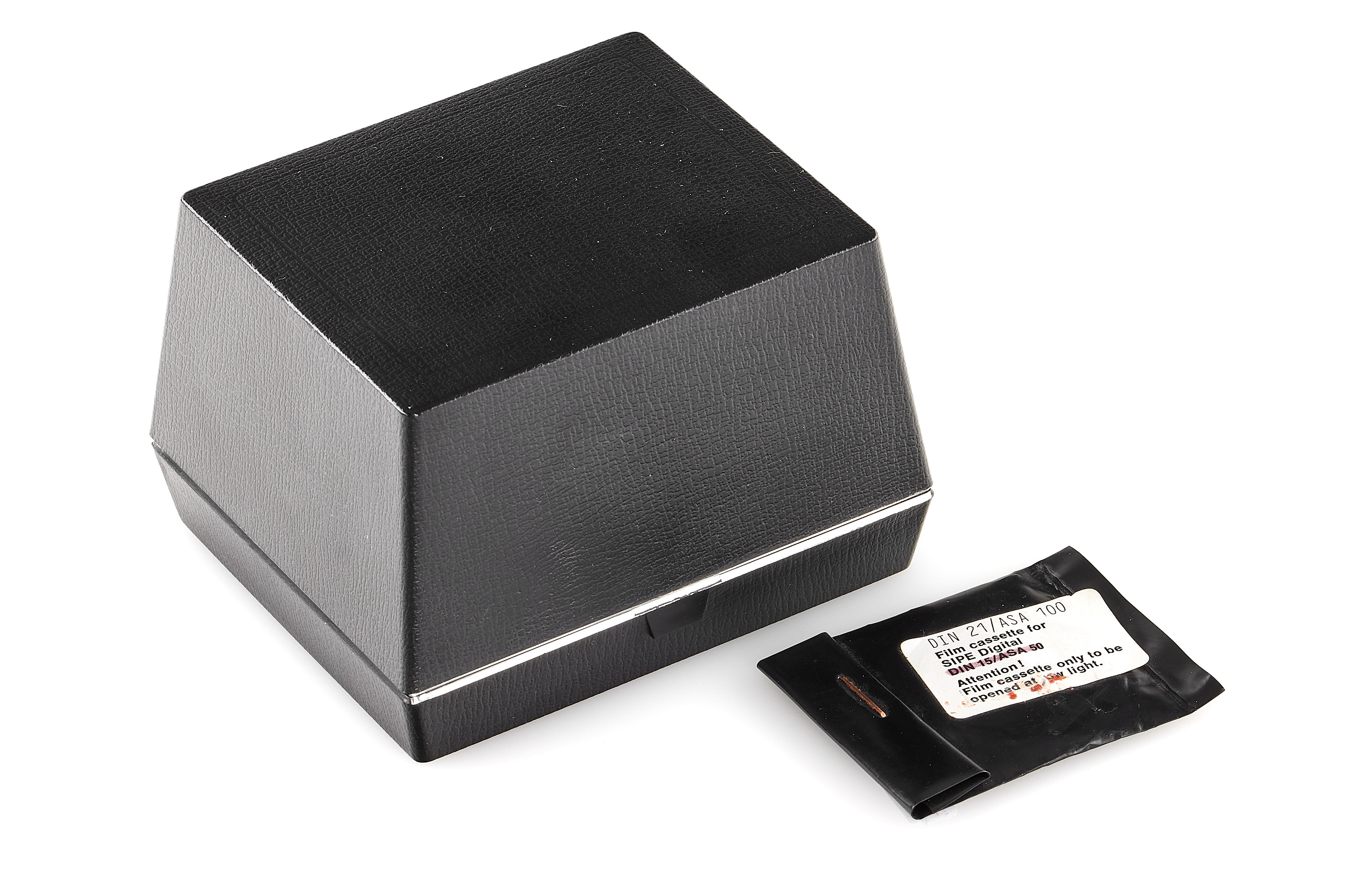 Very rare digital wristwatch with built-in film camera, Steinheil 2.5/12mm VL lens, for 7 exposures on special cassette, in absolute mint condition, in presentation box, with German instructions and unexposed cassette.