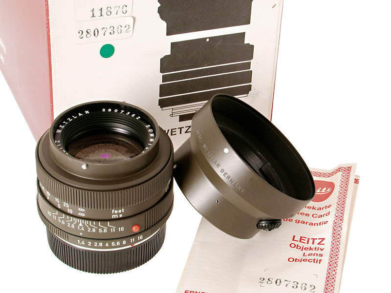 Rare olive Summilux, first type with detachable hood, new in box with papers