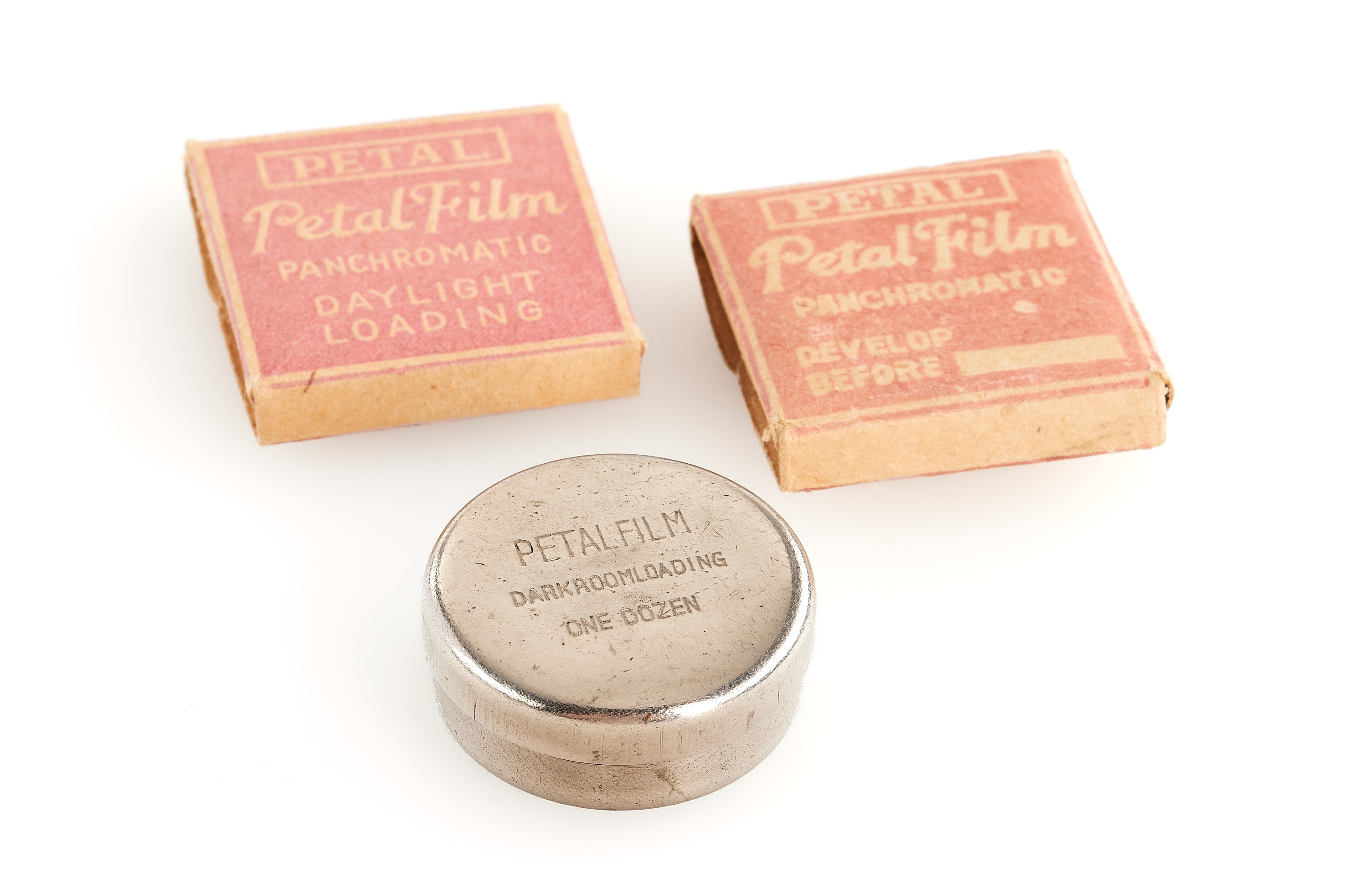 Classic miniature camera in excellent condition, version without engraving on the release lever, with one film magazine, two original films, uncommon metal film keeper and very rare film cutter.