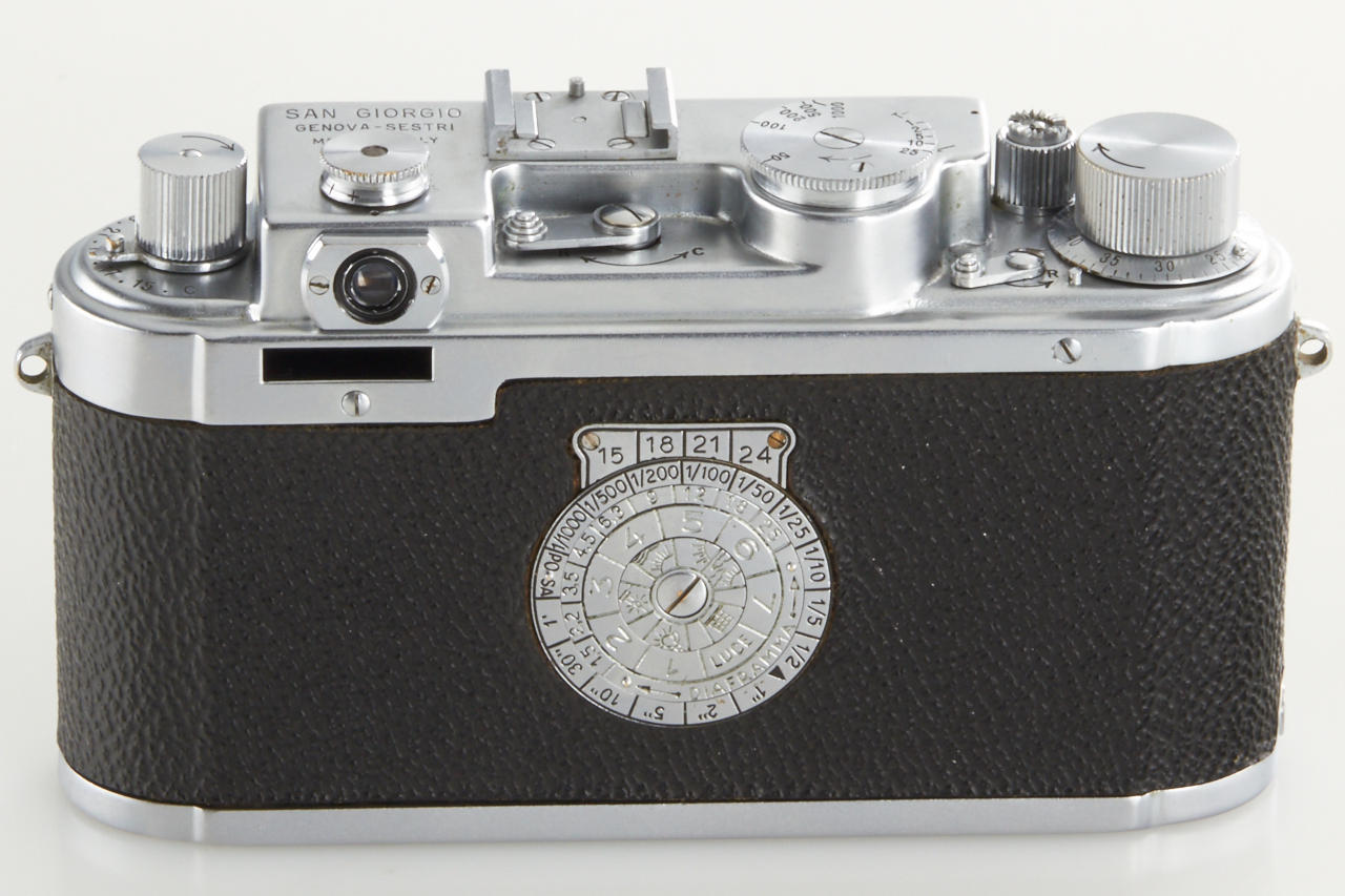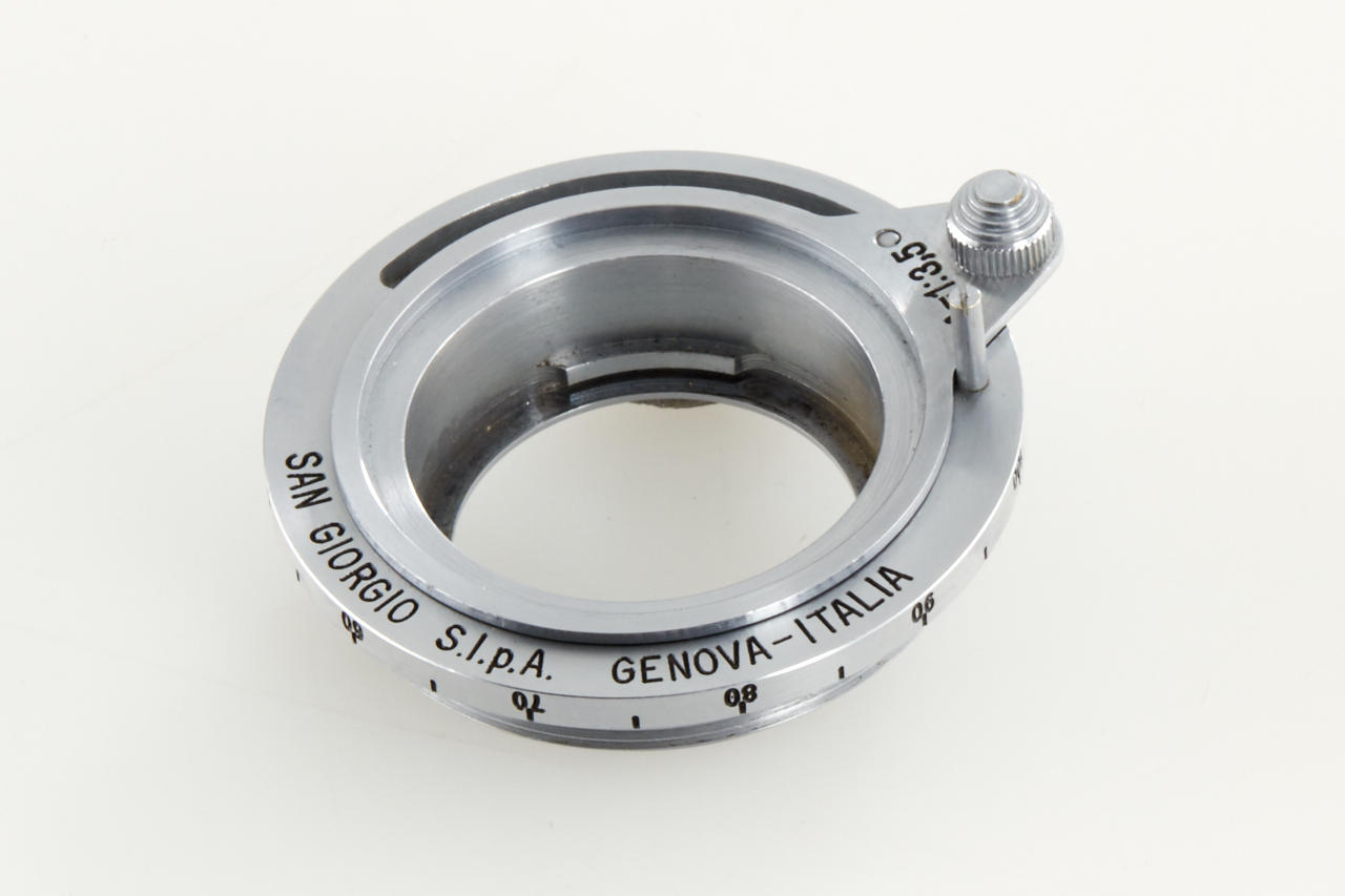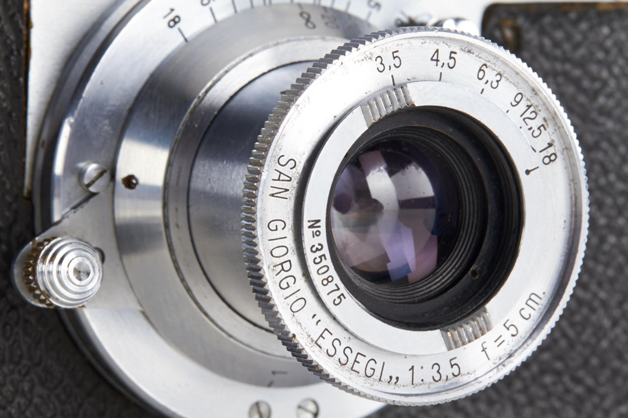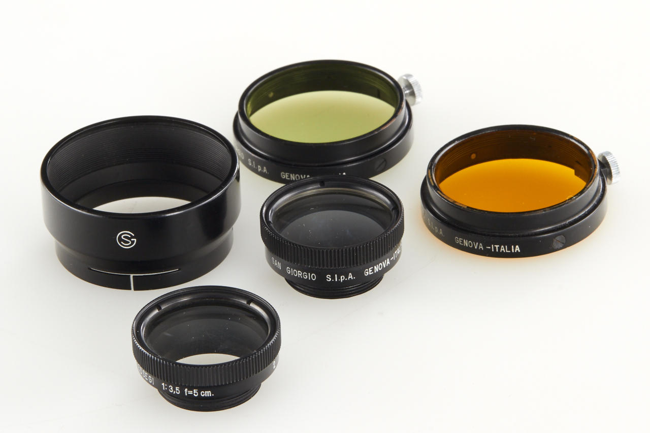 very rare Italian Leica copy in very good condition (base plate condition B-), Essegi 3.5/5cm no.350875, with uncommon original San Giorgio accessories: (1) close focus adapter for Janua lenses on M42 cameras, (2) slide viewer no.408321, (3) black hood for Essegi lens, (4 + 5) yellow and orange filter, (6 + 7) two close up lenses for Essegi lens, (8 + 9) film trimming template (ABLON copy) and film cutting blade