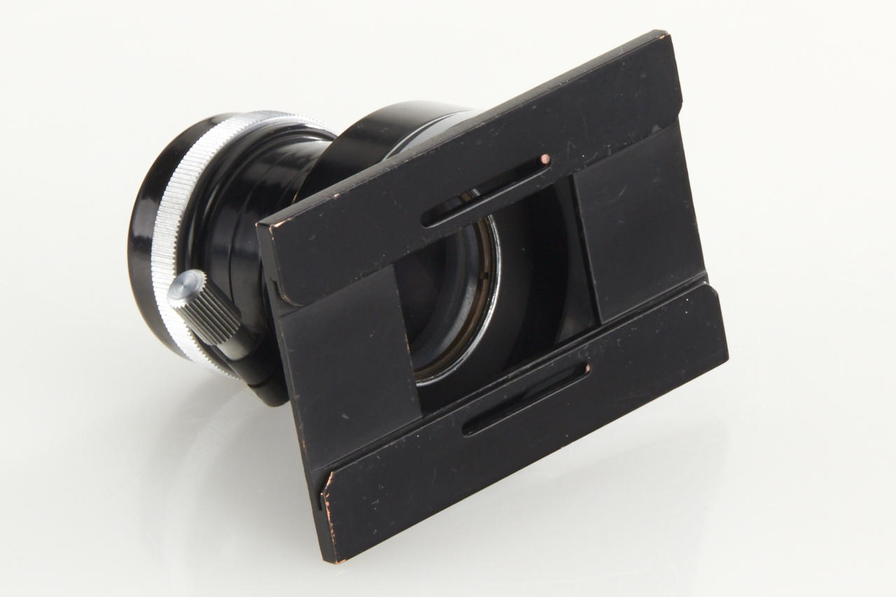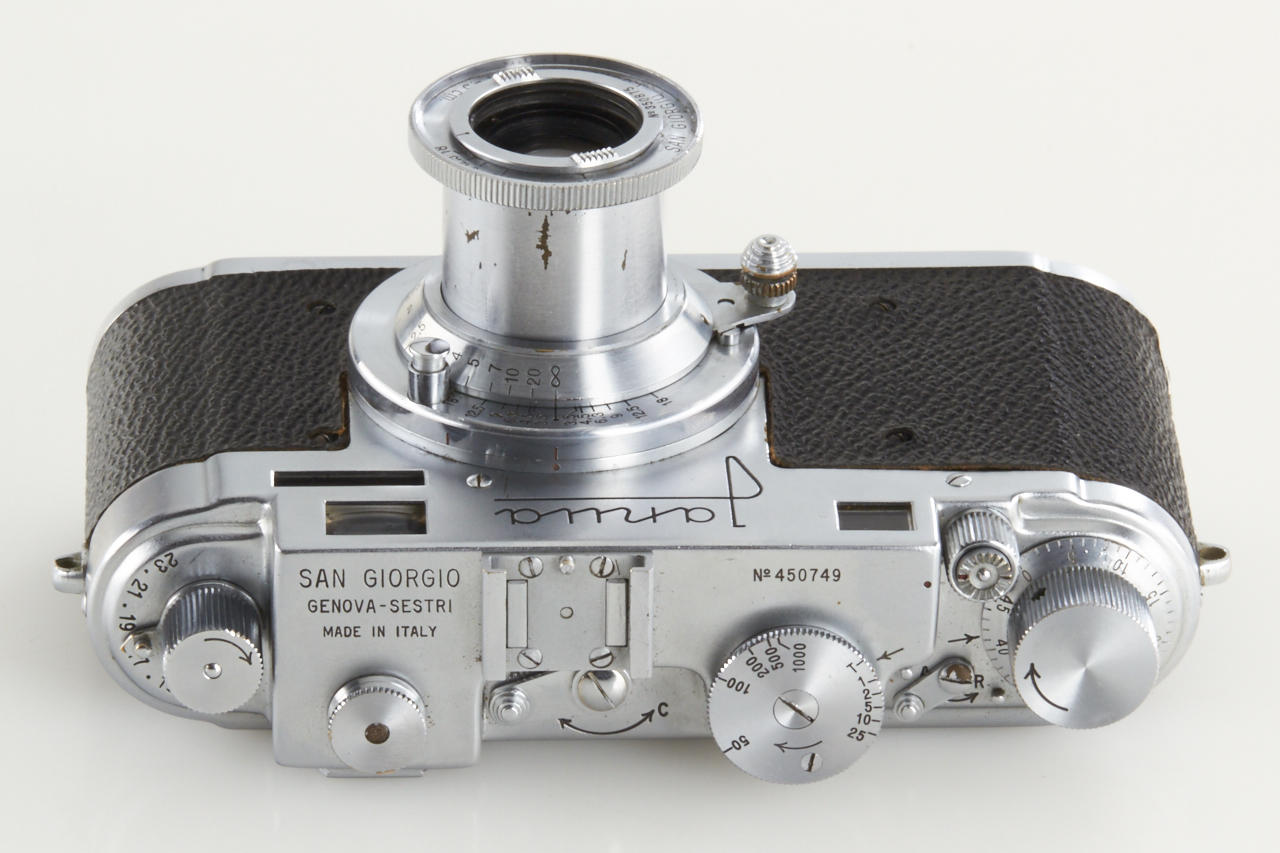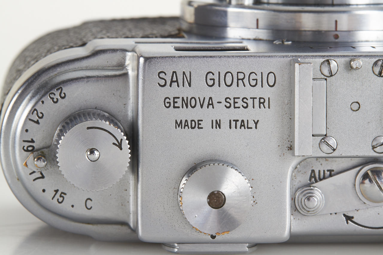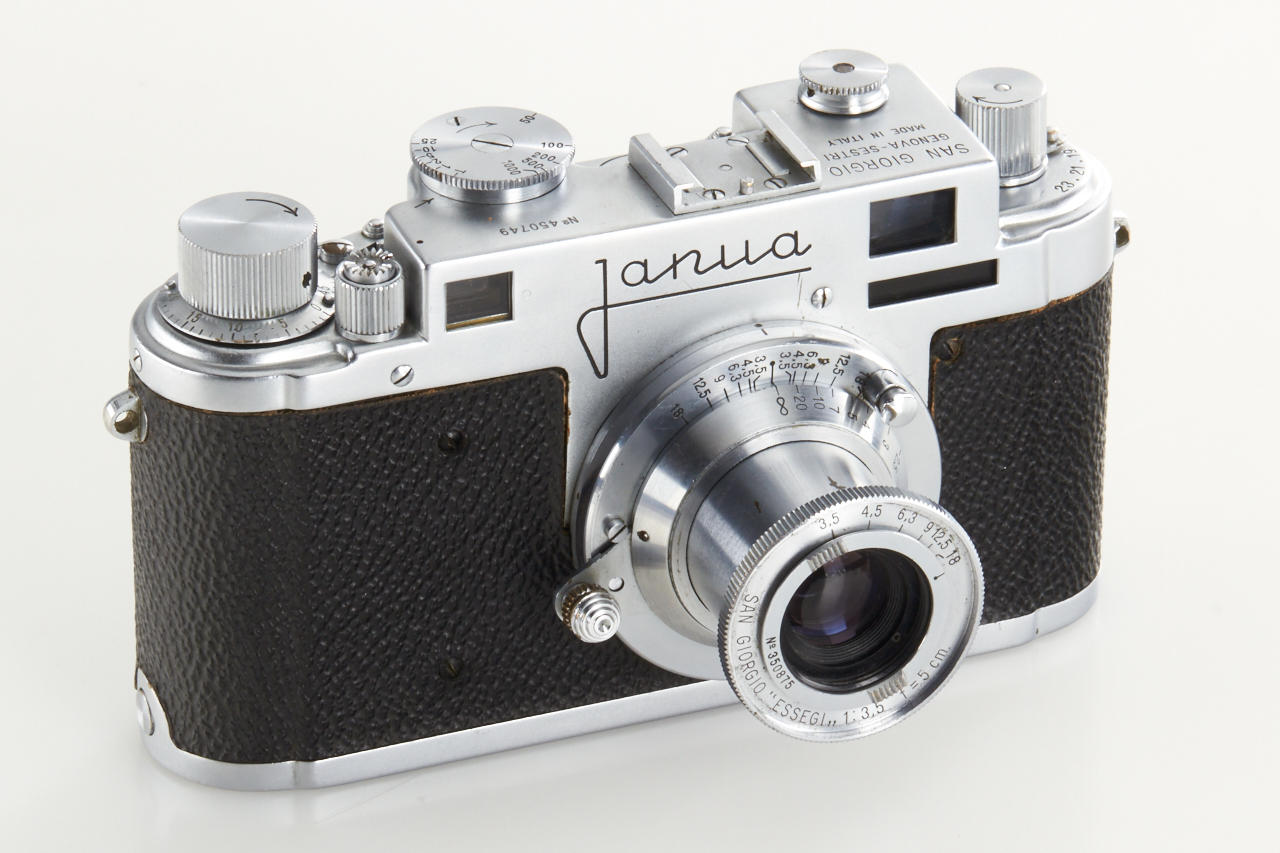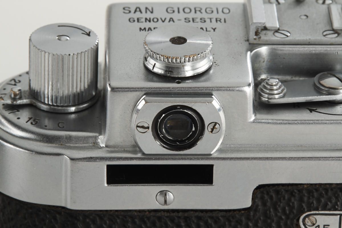 very rare Italian Leica copy in very good condition (base plate condition B-), Essegi 3.5/5cm no.350875, with uncommon original San Giorgio accessories: (1) close focus adapter for Janua lenses on M42 cameras, (2) slide viewer no.408321, (3) black hood for Essegi lens, (4 + 5) yellow and orange filter, (6 + 7) two close up lenses for Essegi lens, (8 + 9) film trimming template (ABLON copy) and film cutting blade