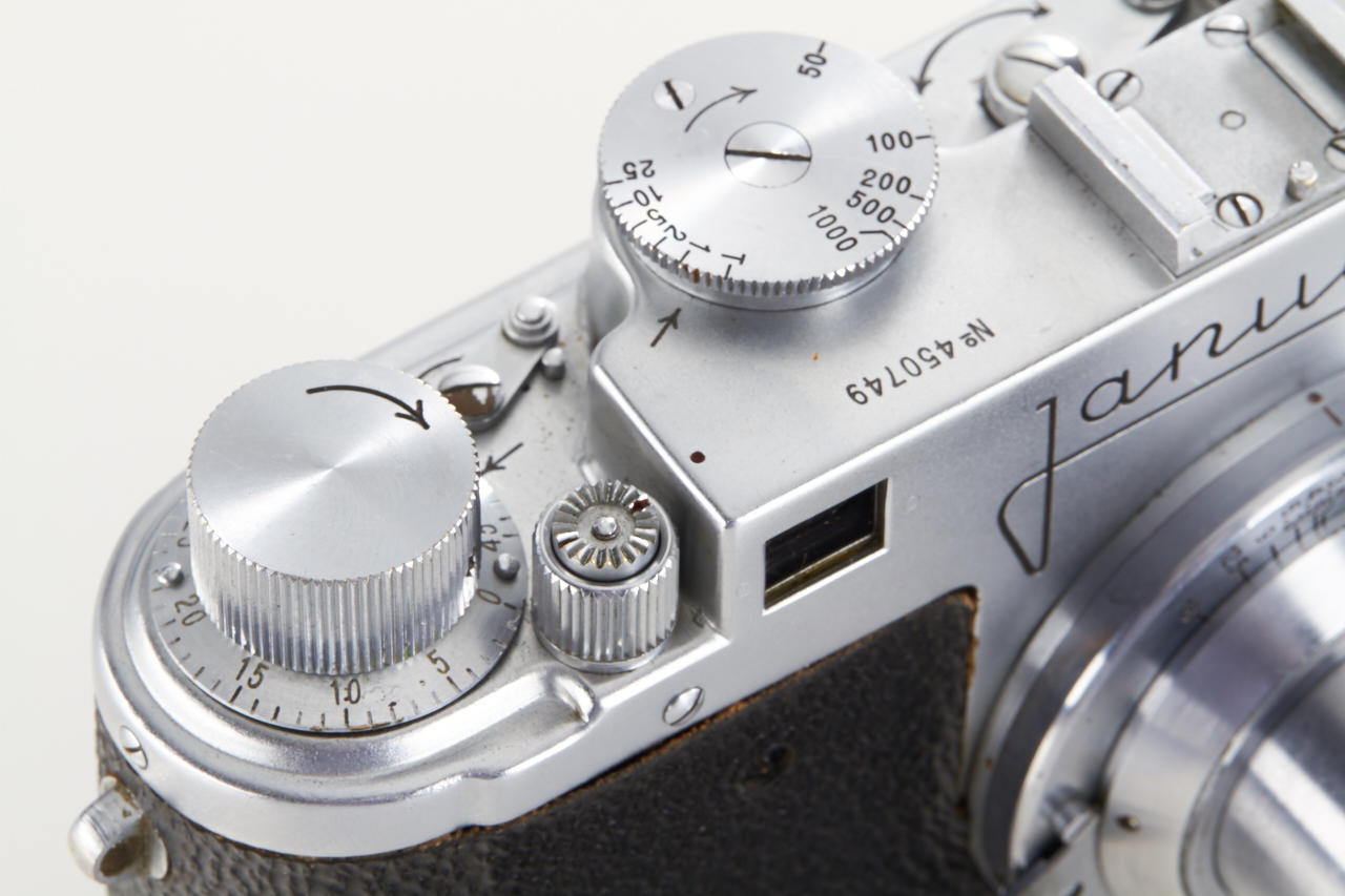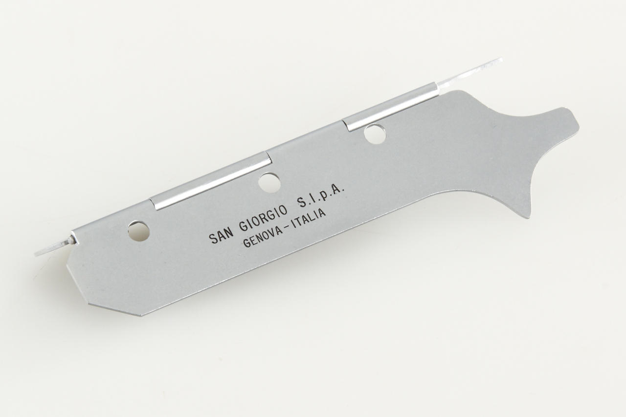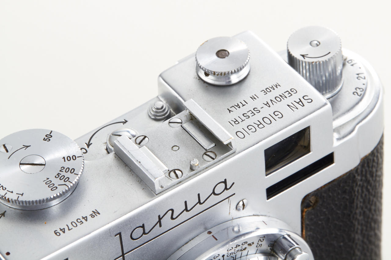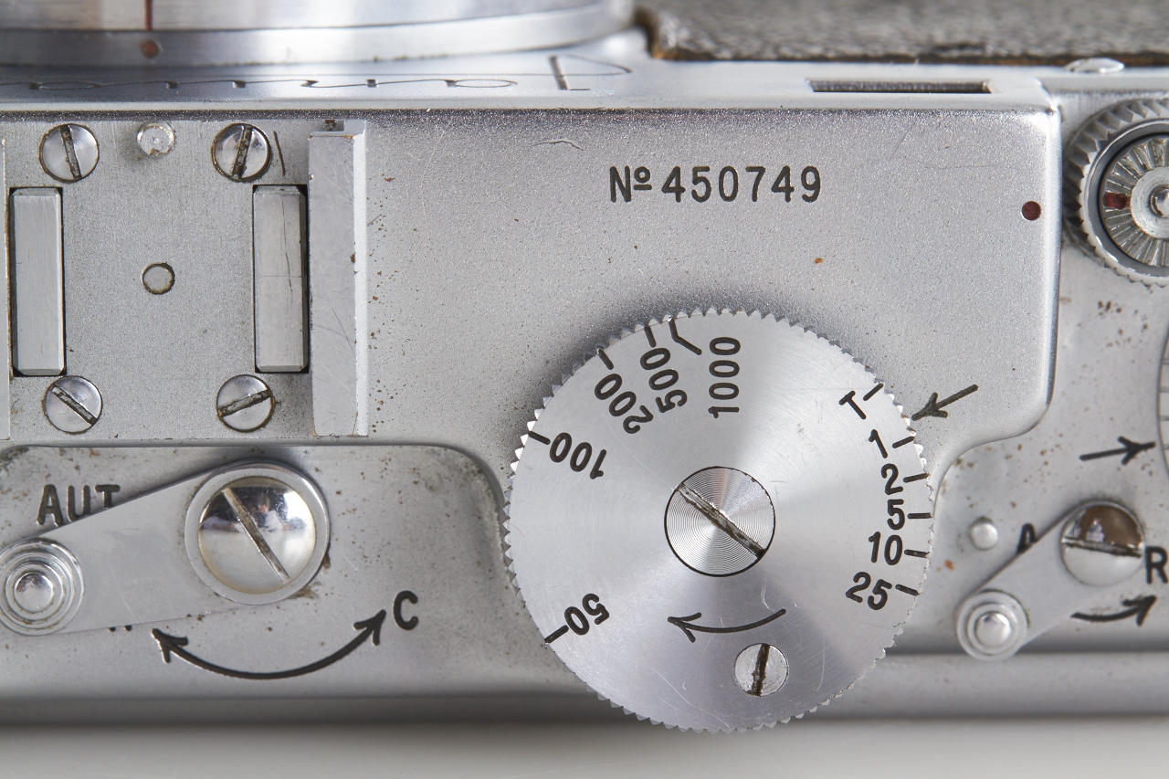 very rare Italian Leica copy in very good condition (base plate condition B-), Essegi 3.5/5cm no.350875, with uncommon original San Giorgio accessories: (1) close focus adapter for Janua lenses on M42 cameras, (2) slide viewer no.408321, (3) black hood for Essegi lens, (4 + 5) yellow and orange filter, (6 + 7) two close up lenses for Essegi lens, (8 + 9) film trimming template (ABLON copy) and film cutting blade