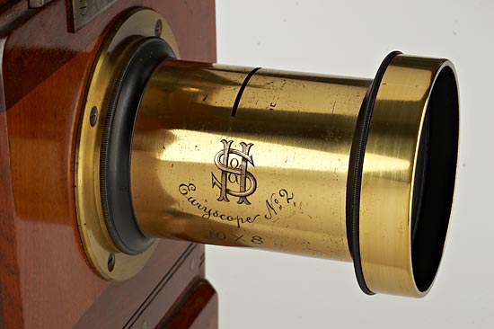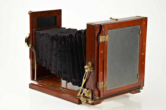 London, 6 1/2 x 8 1/2" with Sands & Hunter Euryscope No.2 10x8" lens, mahogany body with brass fittings and dark maroon leather bellows. A beautifully constructed British camera of unusual folding design in beautiful condition. Ex Spira Collection.