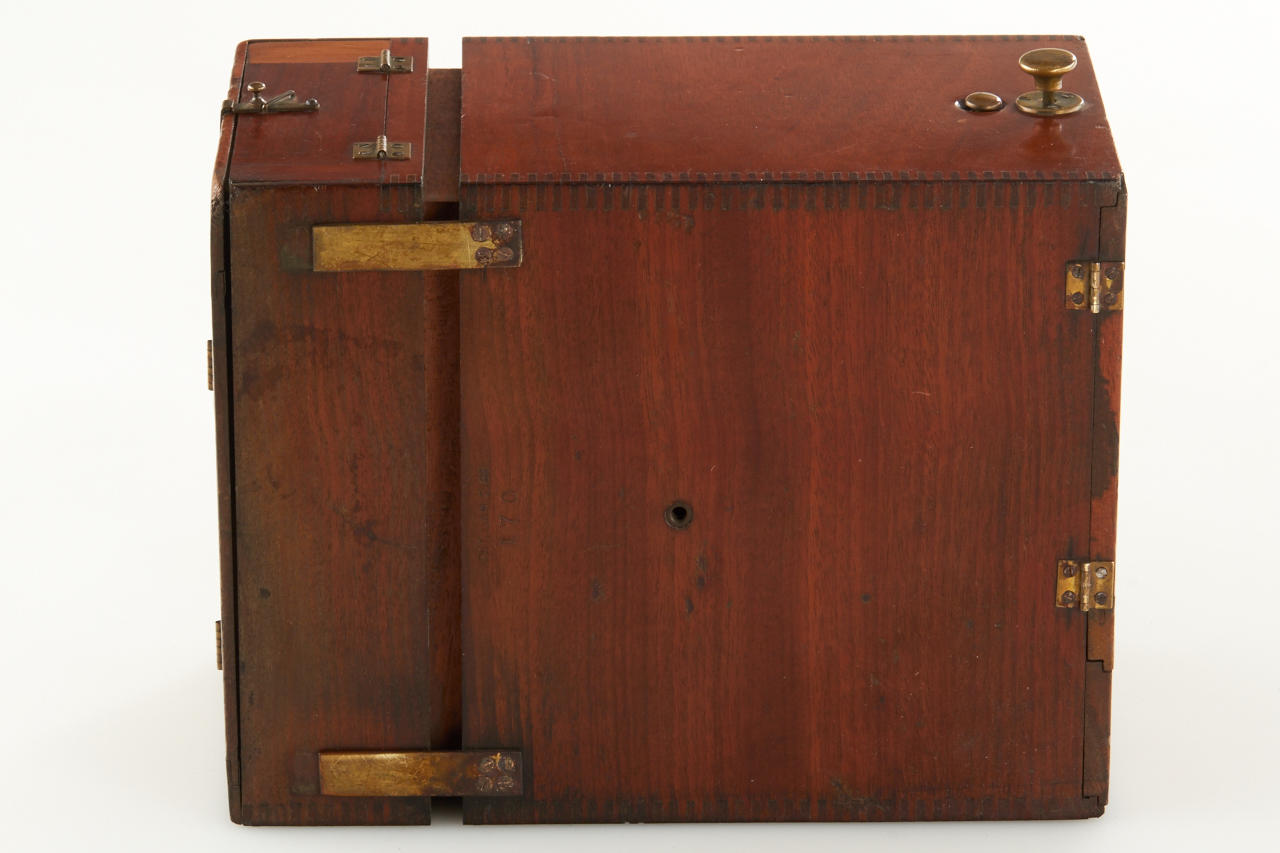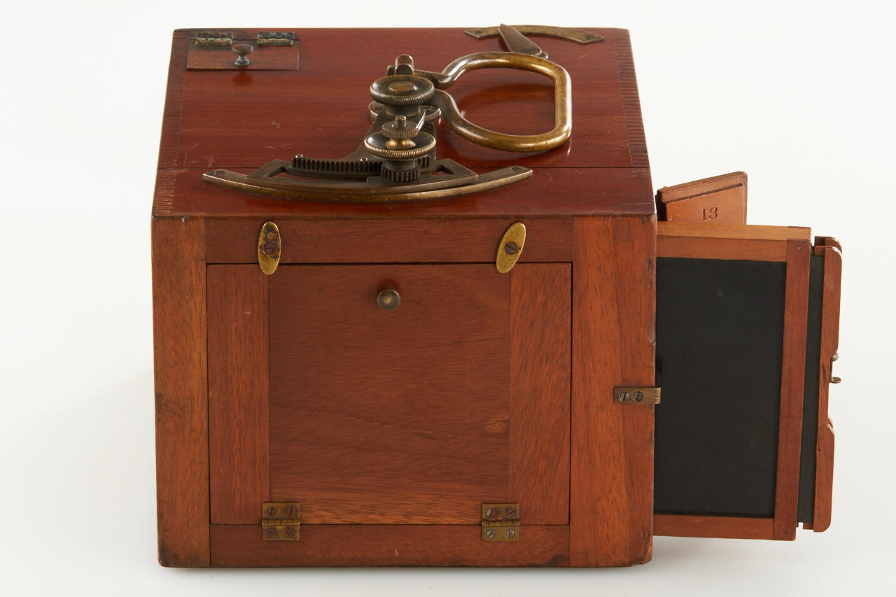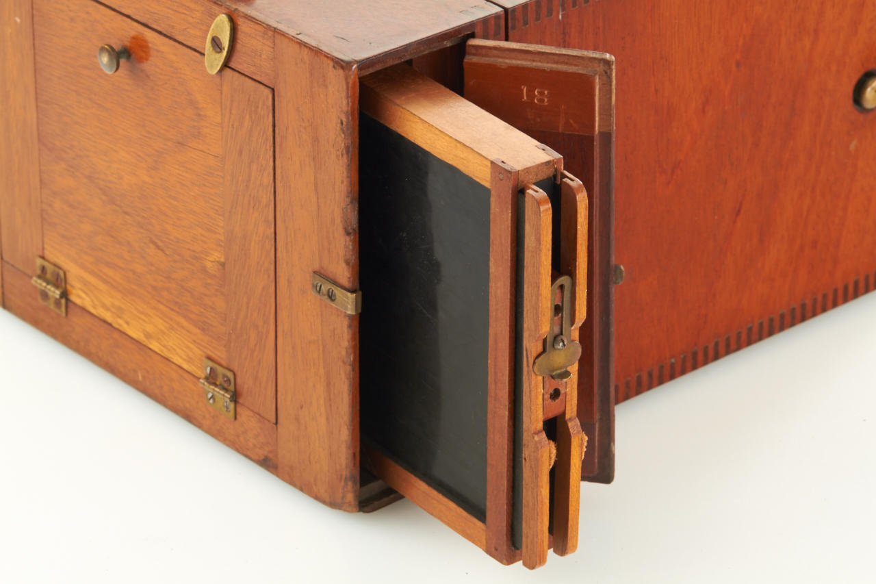 very rare and historically important wooden detective camera for 3 1/4x4 1/4" plates, invented by William Schmid, New York, produced by T.Anthony, this was the first commercially produced hand-held camera, second model with folding handle in beautiful, never restored original condition