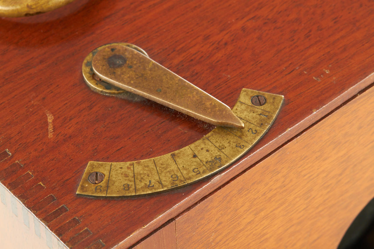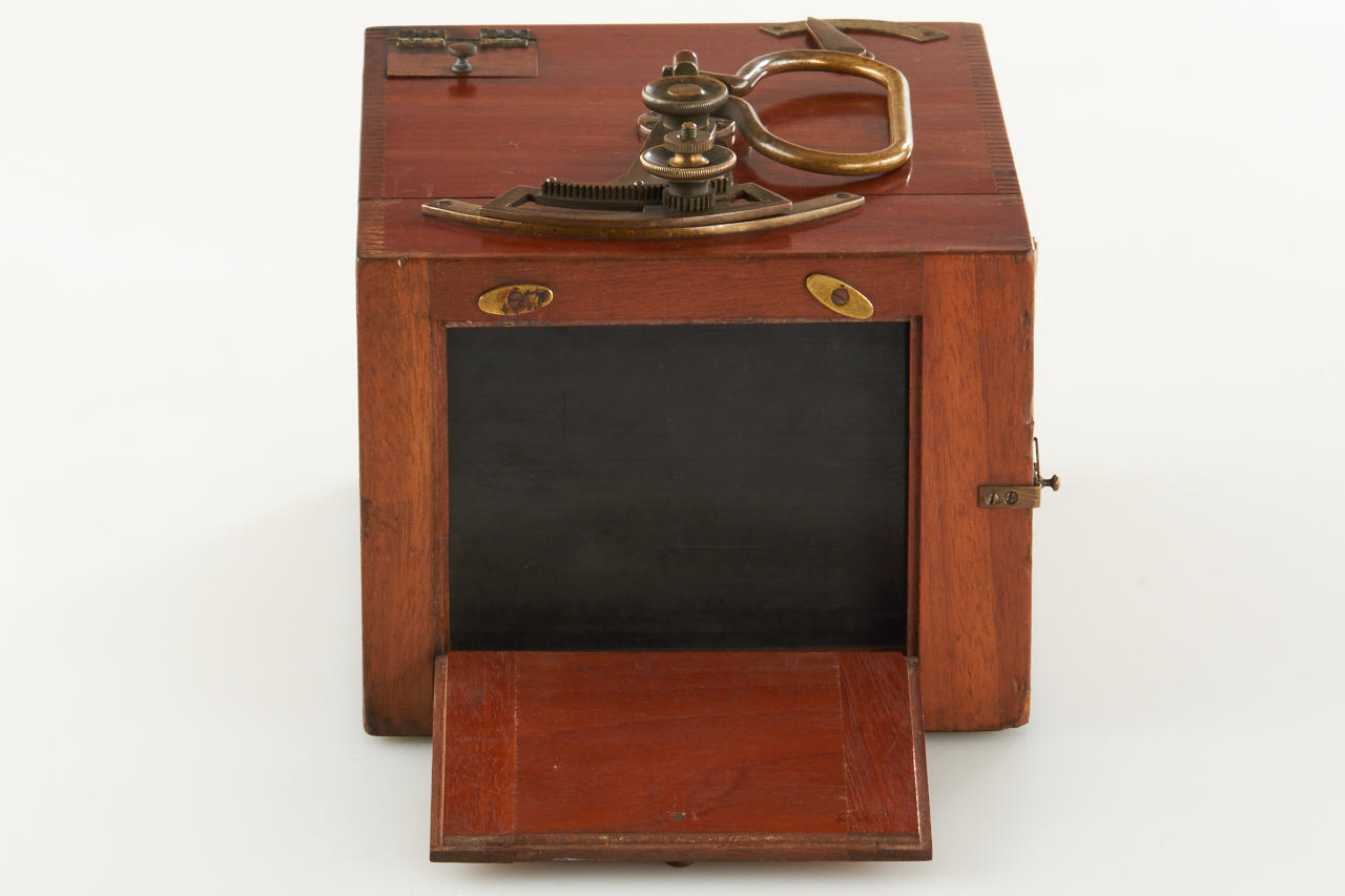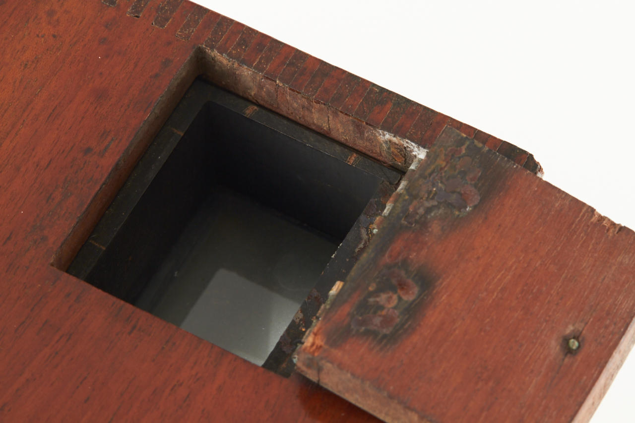 very rare and historically important wooden detective camera for 3 1/4x4 1/4" plates, invented by William Schmid, New York, produced by T.Anthony, this was the first commercially produced hand-held camera, second model with folding handle in beautiful, never restored original condition