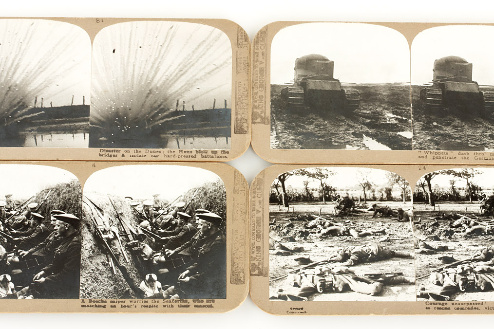 historically interesting set of forty 9x18cm stereo cards published by Realistic Travel of London giving a realistic and drastic scope on the static warfare in Flanders in 1916. Unlike the contemporary German and American cards this series avoids any kind of idealization and focuses on the barbarous destruction of civil targets by the Germans and the inhuman conditions of the British soldiers trapped in their trenches. All the cards are in very good condition.
