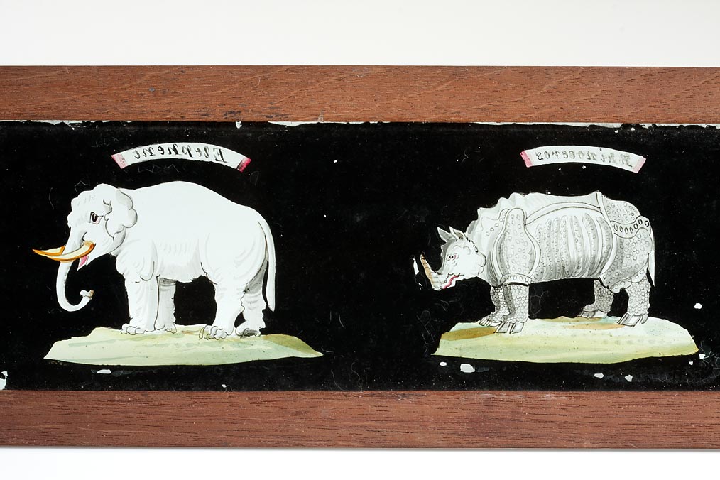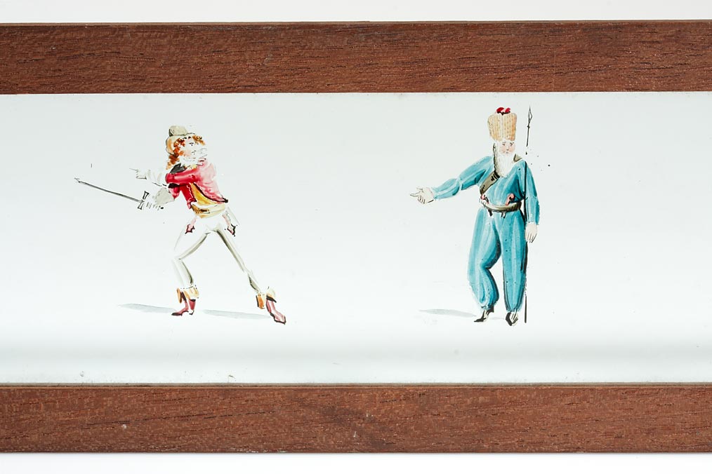 set of three German hand painted magic lantern slides, each slide is mounted in a wooden frame, (1) four animals with German descriptions, (2) four cavaliers, (3) five nationalities. All in good condition and with fresh colours.