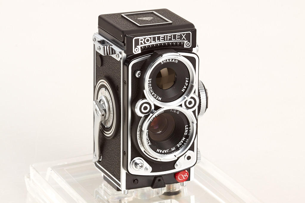 (1) black Leica IIIf Swedish Army Model (new in maker's box), (2) chrome M3 (new in maker's box), (3) Rolleiflex 2.8F (new in maker's box), (4) black Nikon F in mint condition, (5) black flash (new in maker's box) (5)