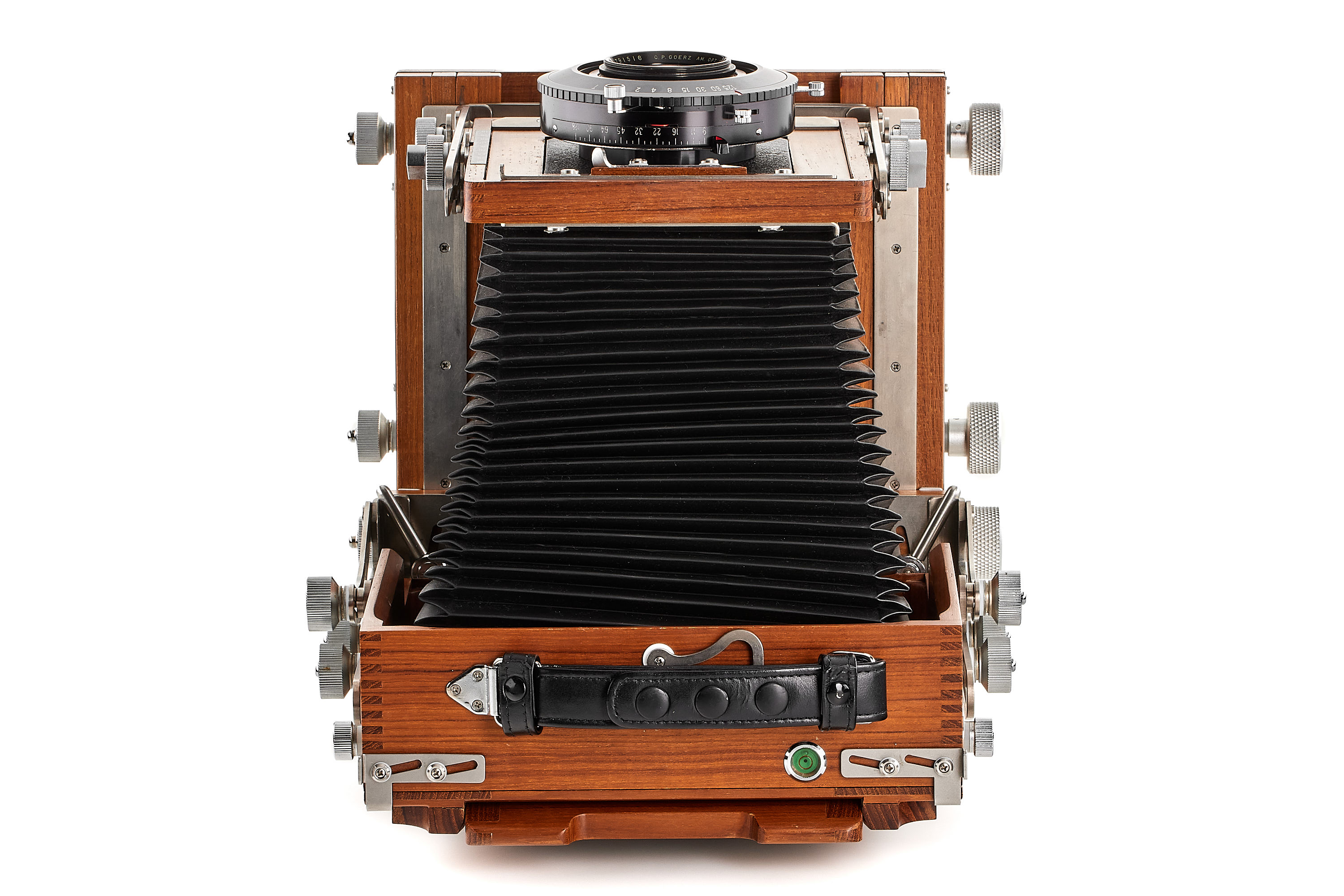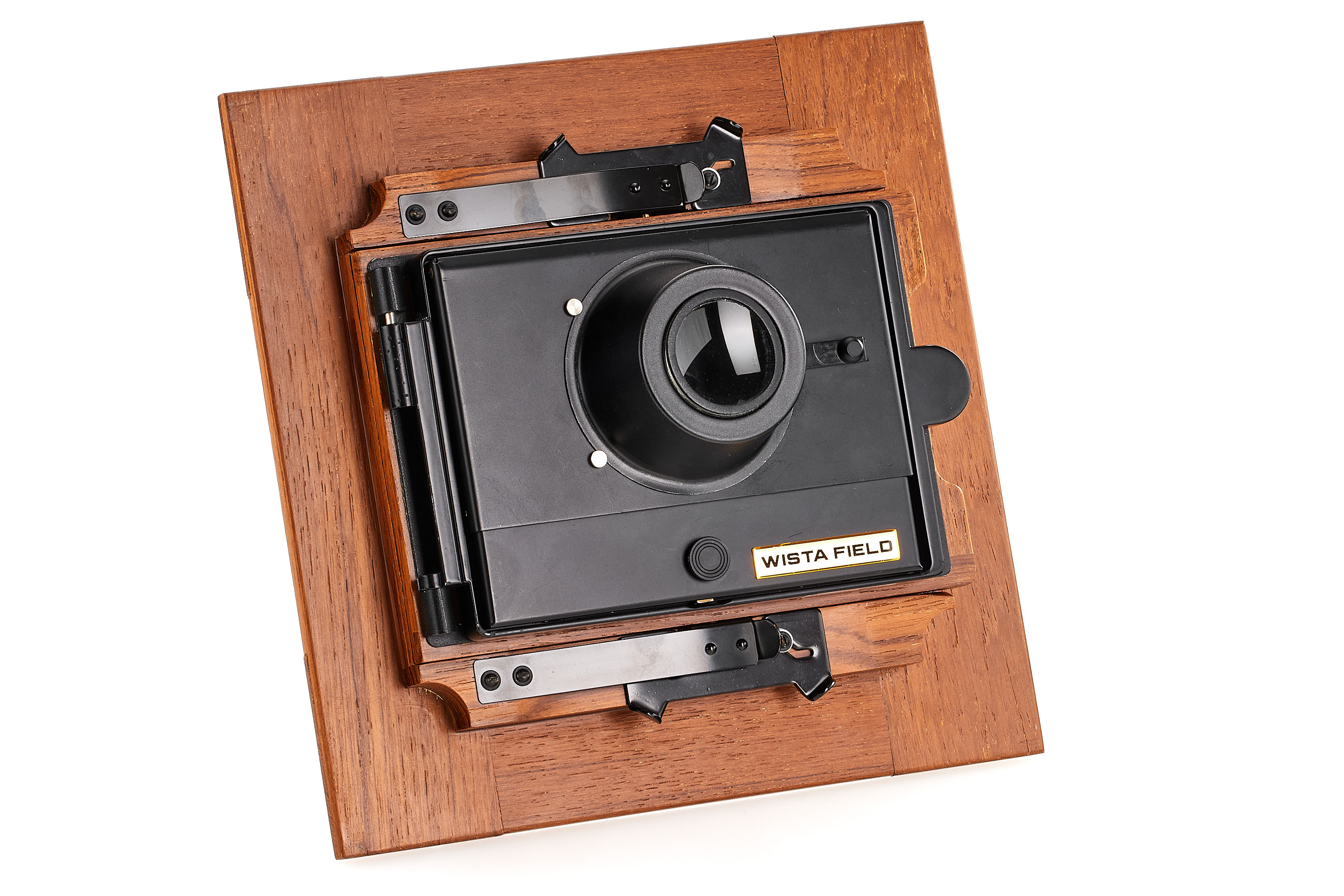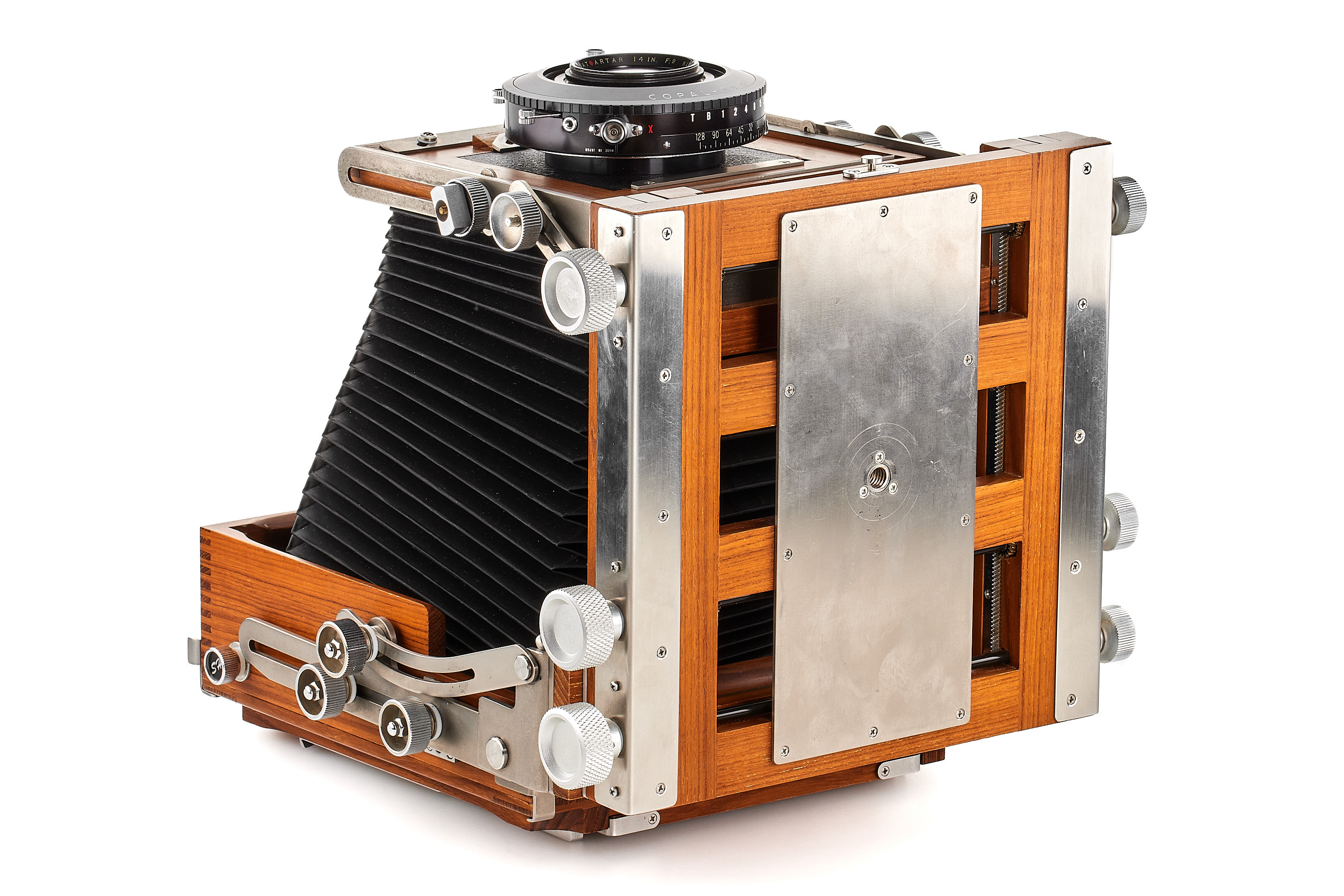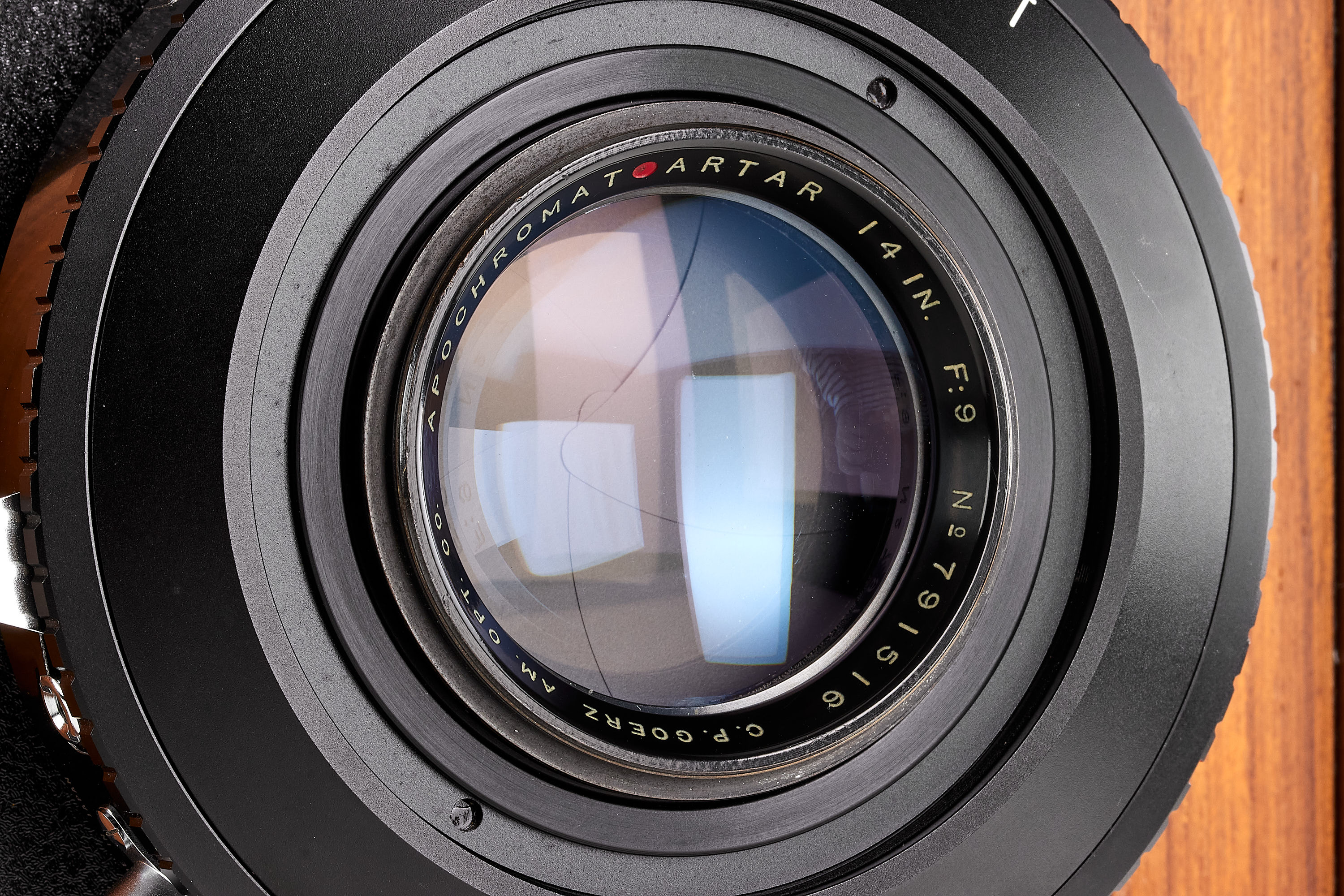 Very nice large format field camera for up to 5x7", in mint condition, including ground glass for 5x7", Wista Field ground glass back for 4x5", extra standard bellows, extra leather bellows, P617 6x17/6x12cm panorama back for 120 roll film, 5x 5x7" double film holders, together with Goerz Apochromat Artar 9/14" from the 1940s no.791516 with good coated optics only showing few cleaning marks, mounted in Copal-No.3 shutter (both caps), with outfit metal case.