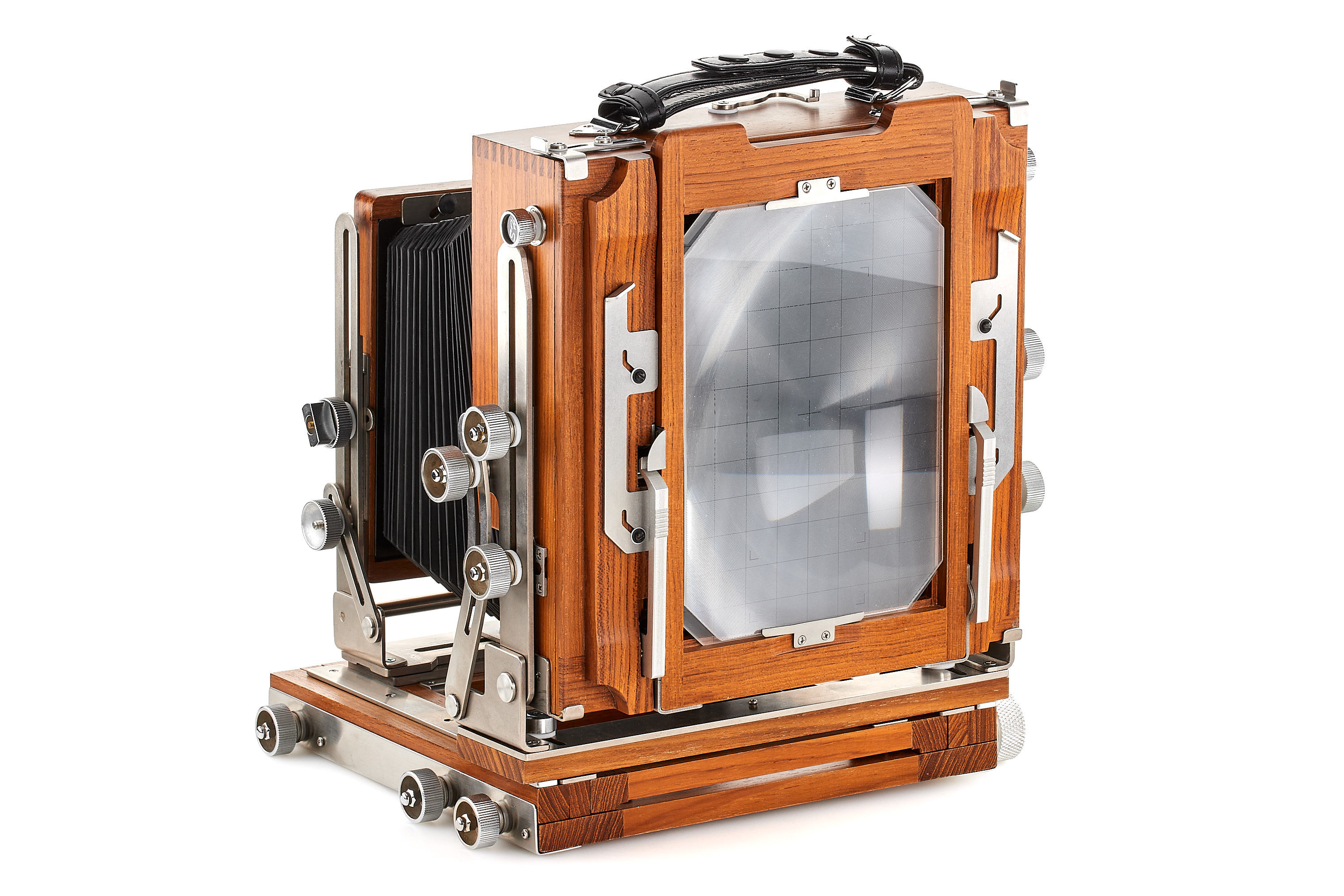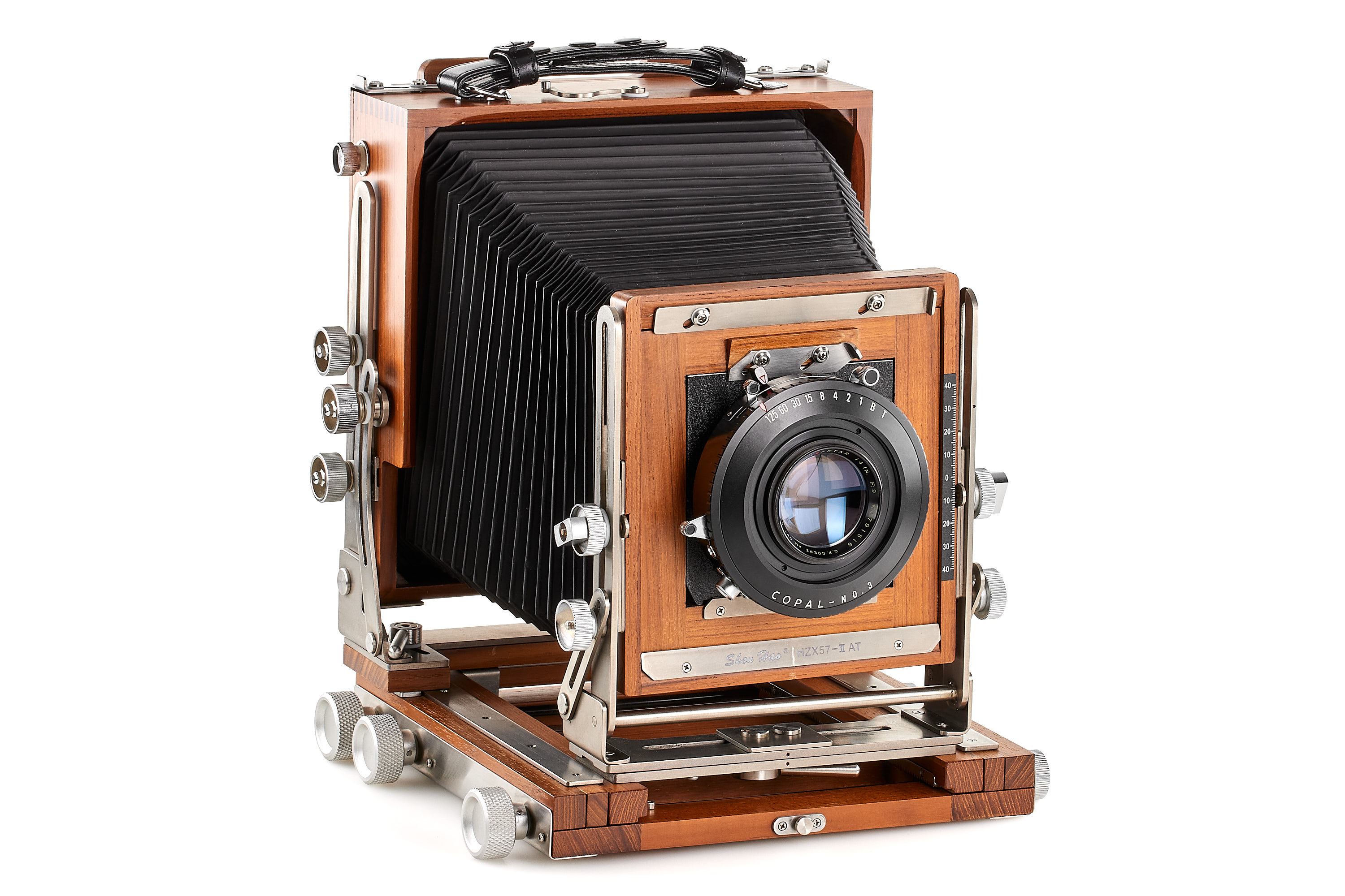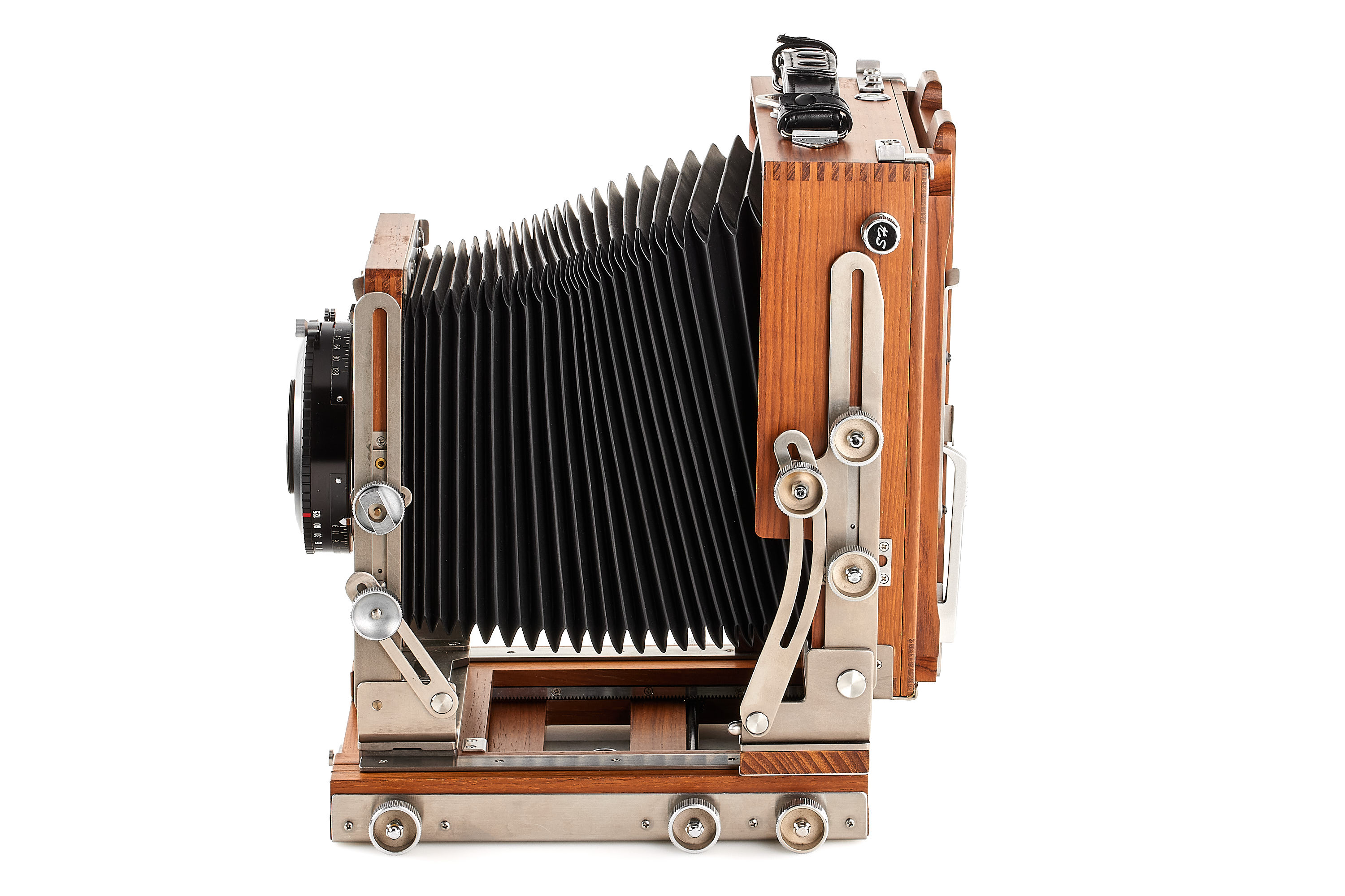 Very nice large format field camera for up to 5x7", in mint condition, including ground glass for 5x7", Wista Field ground glass back for 4x5", extra standard bellows, extra leather bellows, P617 6x17/6x12cm panorama back for 120 roll film, 5x 5x7" double film holders, together with Goerz Apochromat Artar 9/14" from the 1940s no.791516 with good coated optics only showing few cleaning marks, mounted in Copal-No.3 shutter (both caps), with outfit metal case.