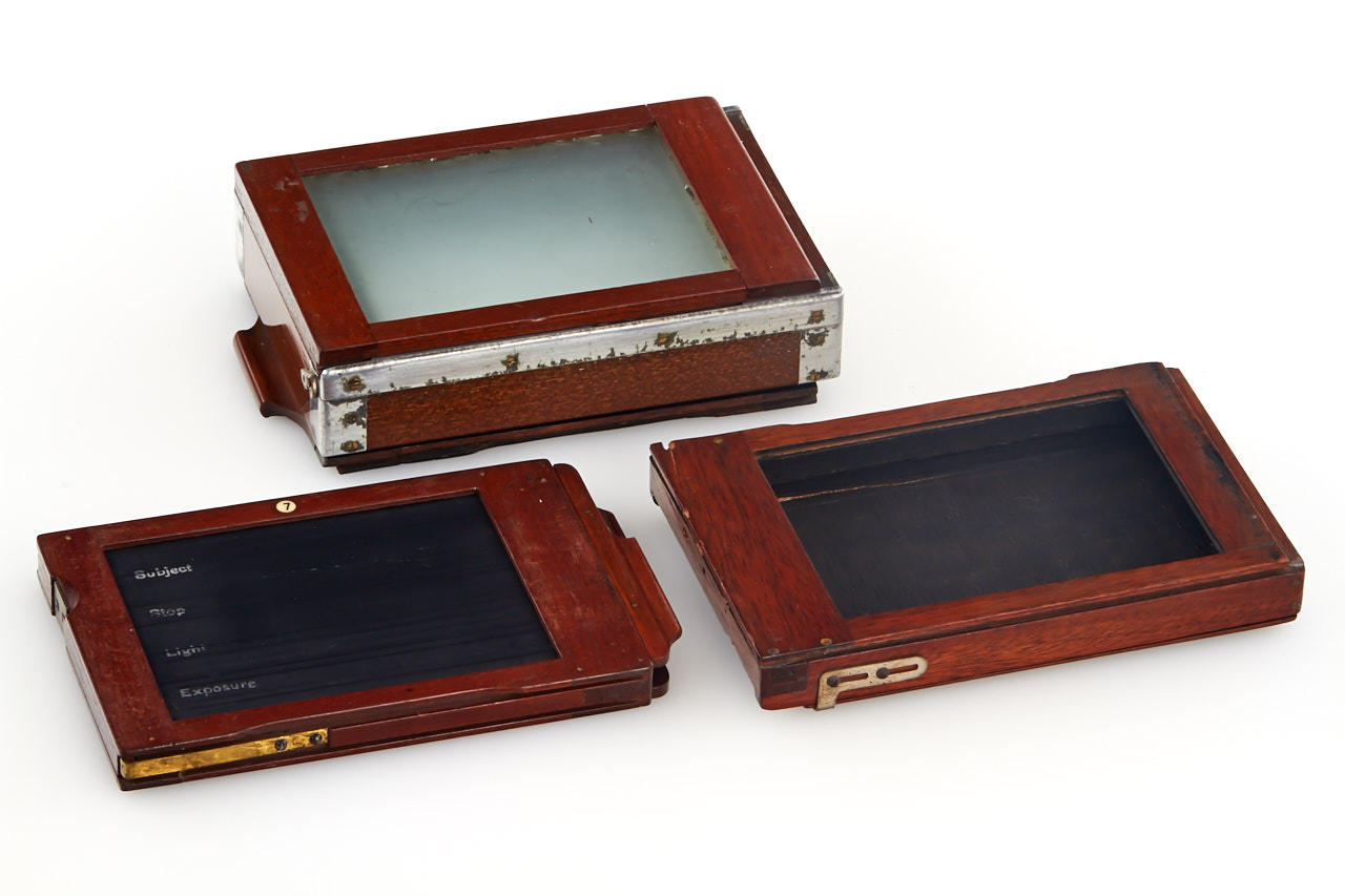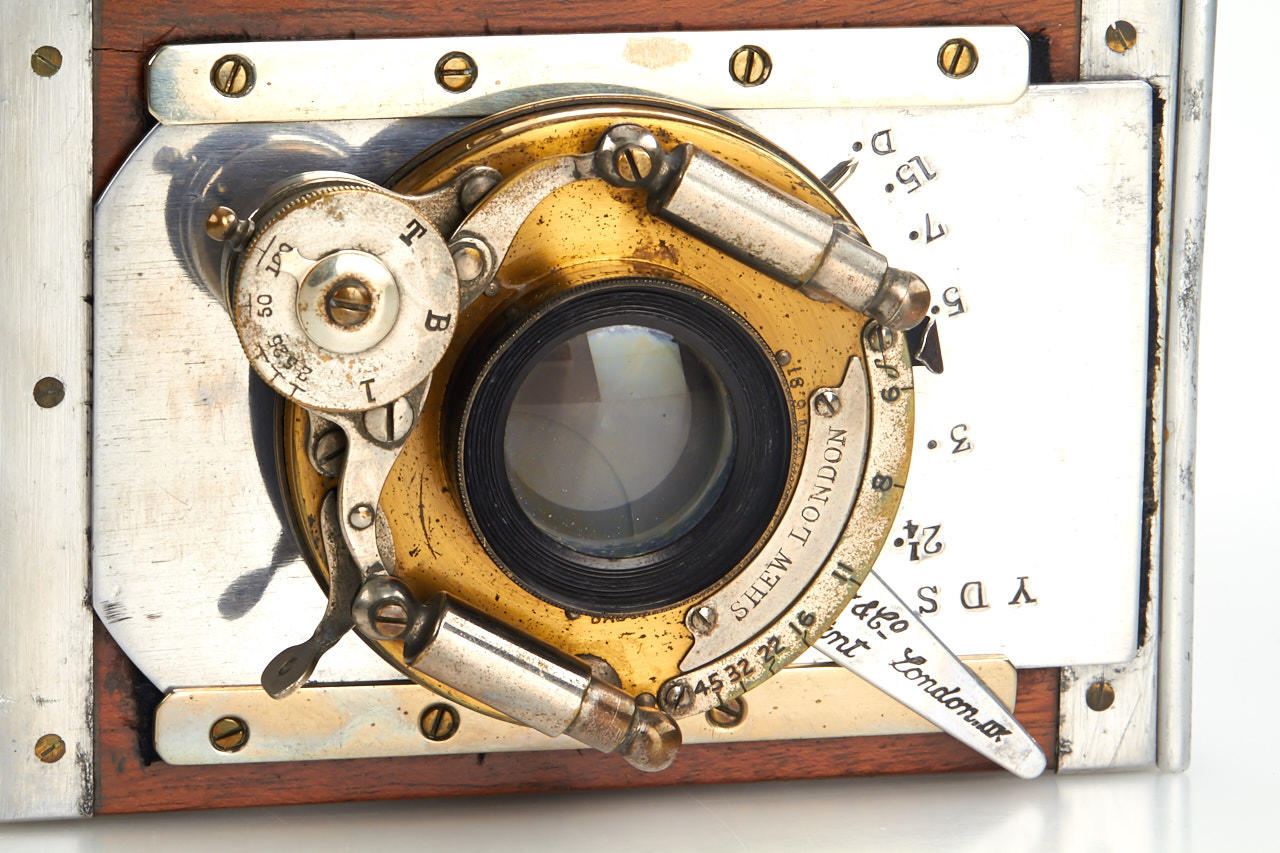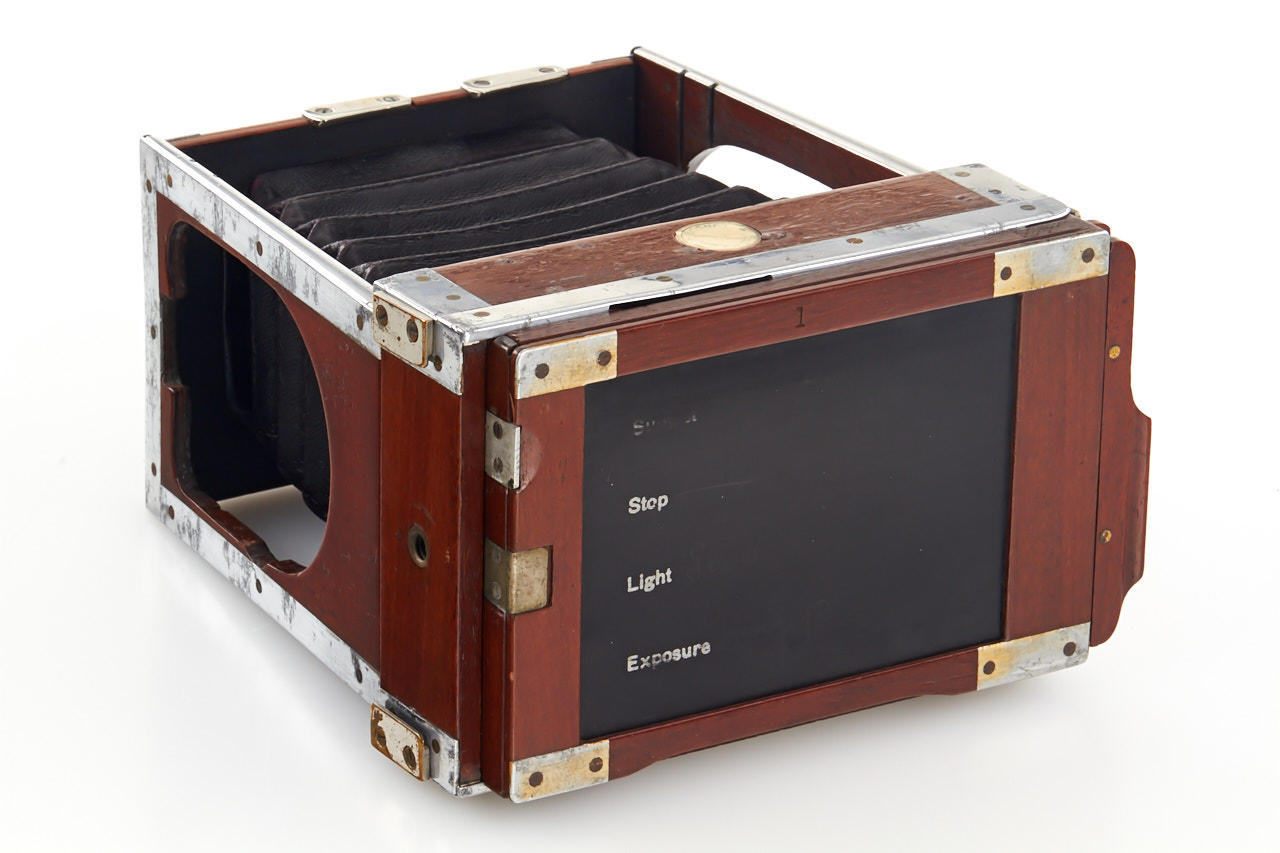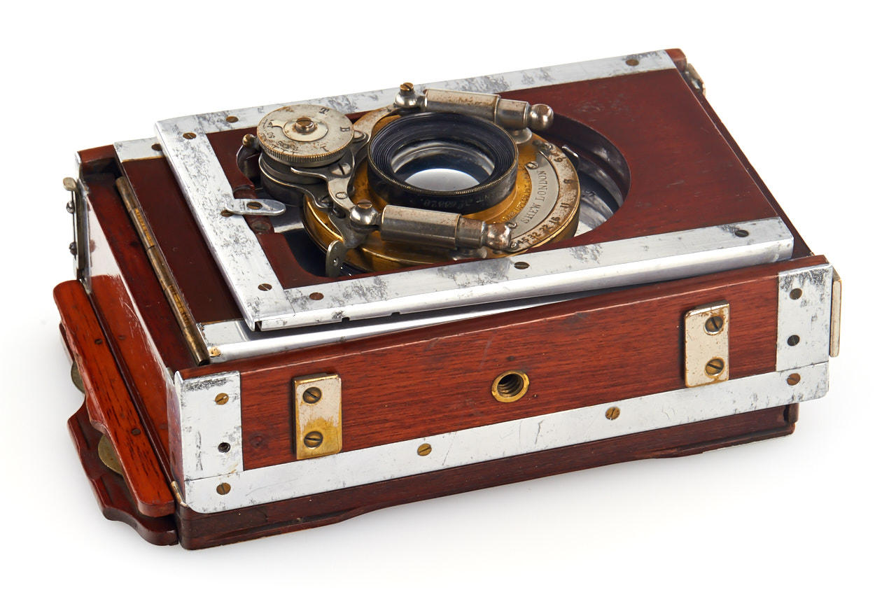 strut-folding mahogany camera for 1/4 plate, rare version of the more popular Eclipse, with aluminium instead of brass fittings, in good original condition, with Dallmeyer Stigmatic lens, extension bellows and three matching film holders