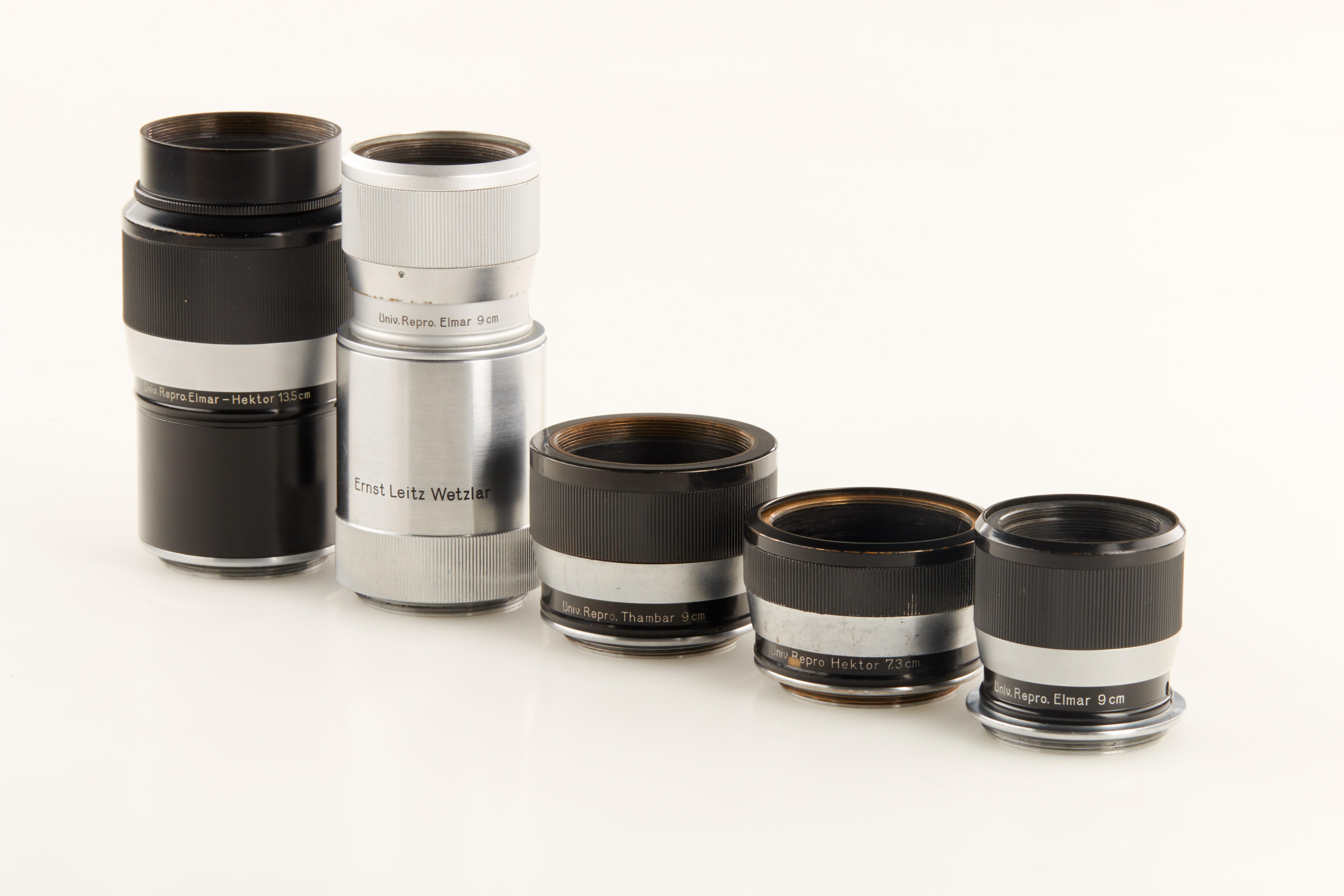 collection of very rare short focusing mounts including: (1) near mint black/chrome COOTL focusing mount for Thambar in red maker's box, (2) black/chrome COOAB focusing mount for Hektor 7.3cm in red maker's box, (3) black/chrome COOED focusing mount for Elmar 4/9cm, (4) chrome COOED focusing mount for Elmar 9cm, (5) black/chrome COOHS focusing mount for 135mm Hektor-Elmar in red maker's box, (6) chrome MOORB extension ring for Telyt 20cm (6) - ex Bawendi collection