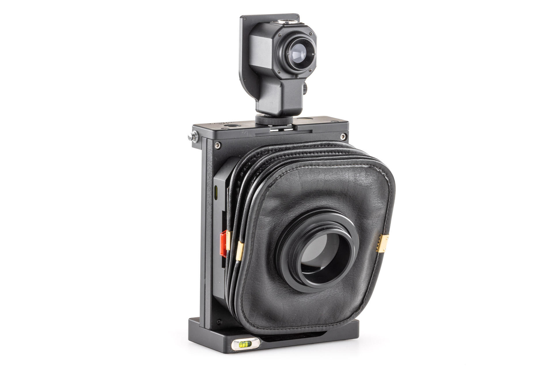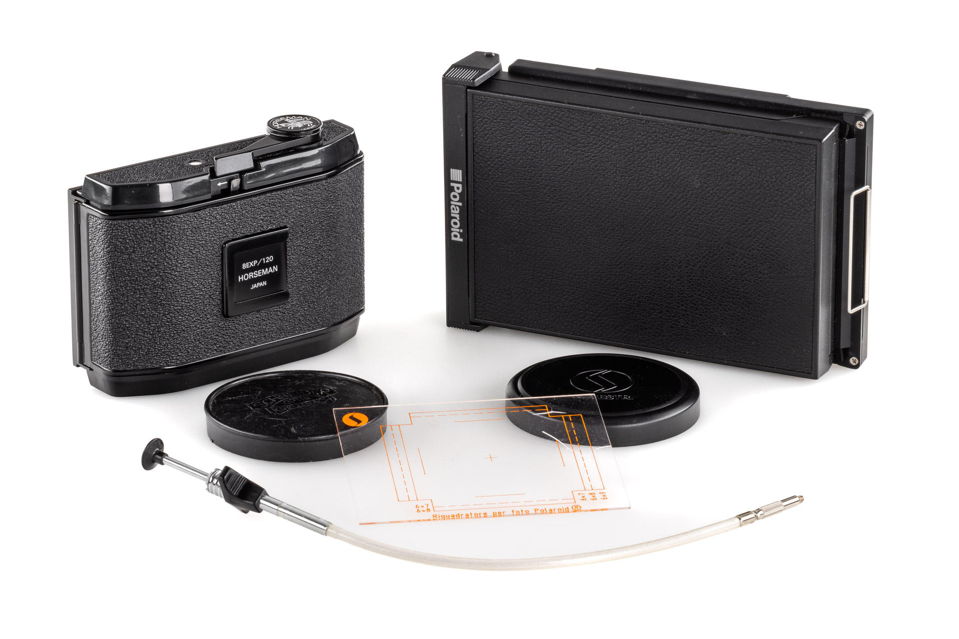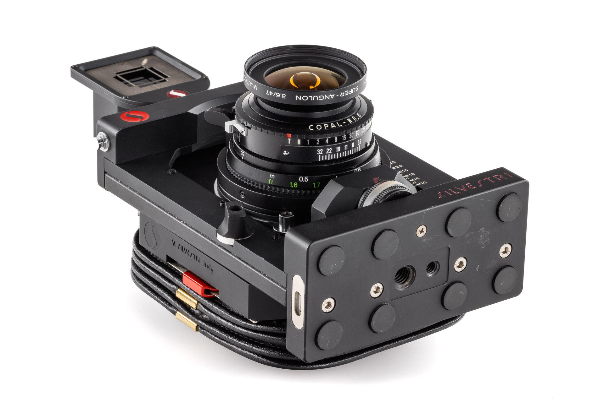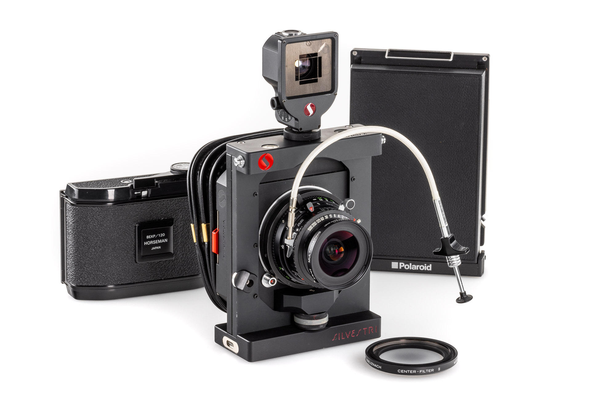 compact and very robust professional shift camera in near mint condition, with clean Super-Angulon 5.6/47mm no.14533122 (finder with matching mask, center-filter and both caps), ground glass with integrated loupe and bellows, Horseman 6x9cm 120 film back, special Polaroid back with mask, instructions and maker's boxes