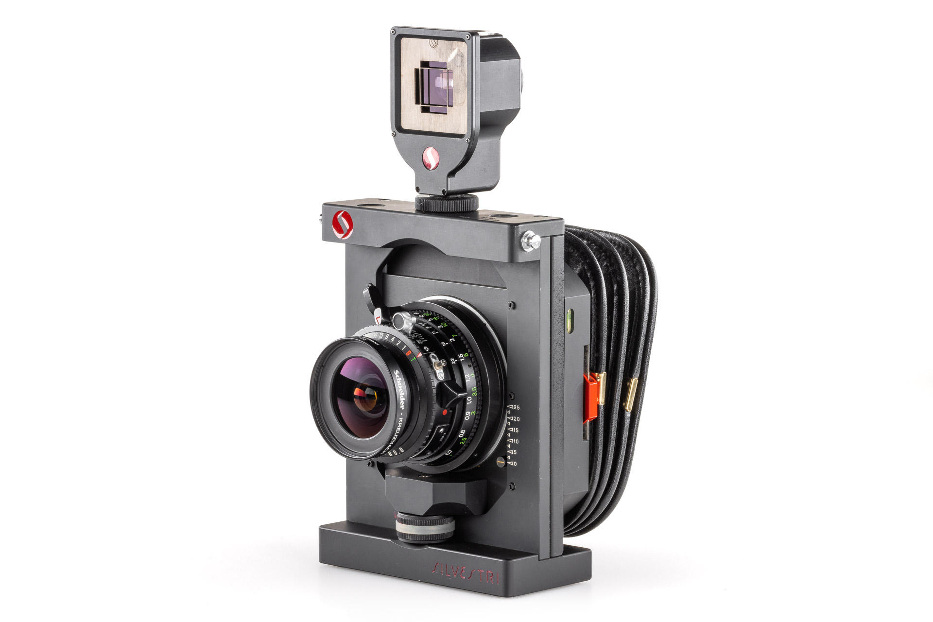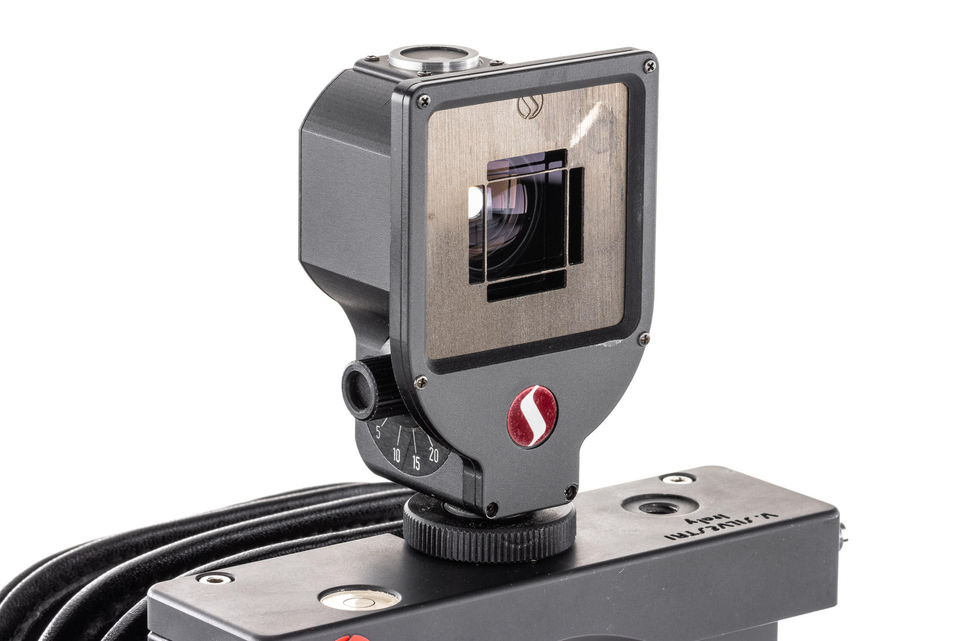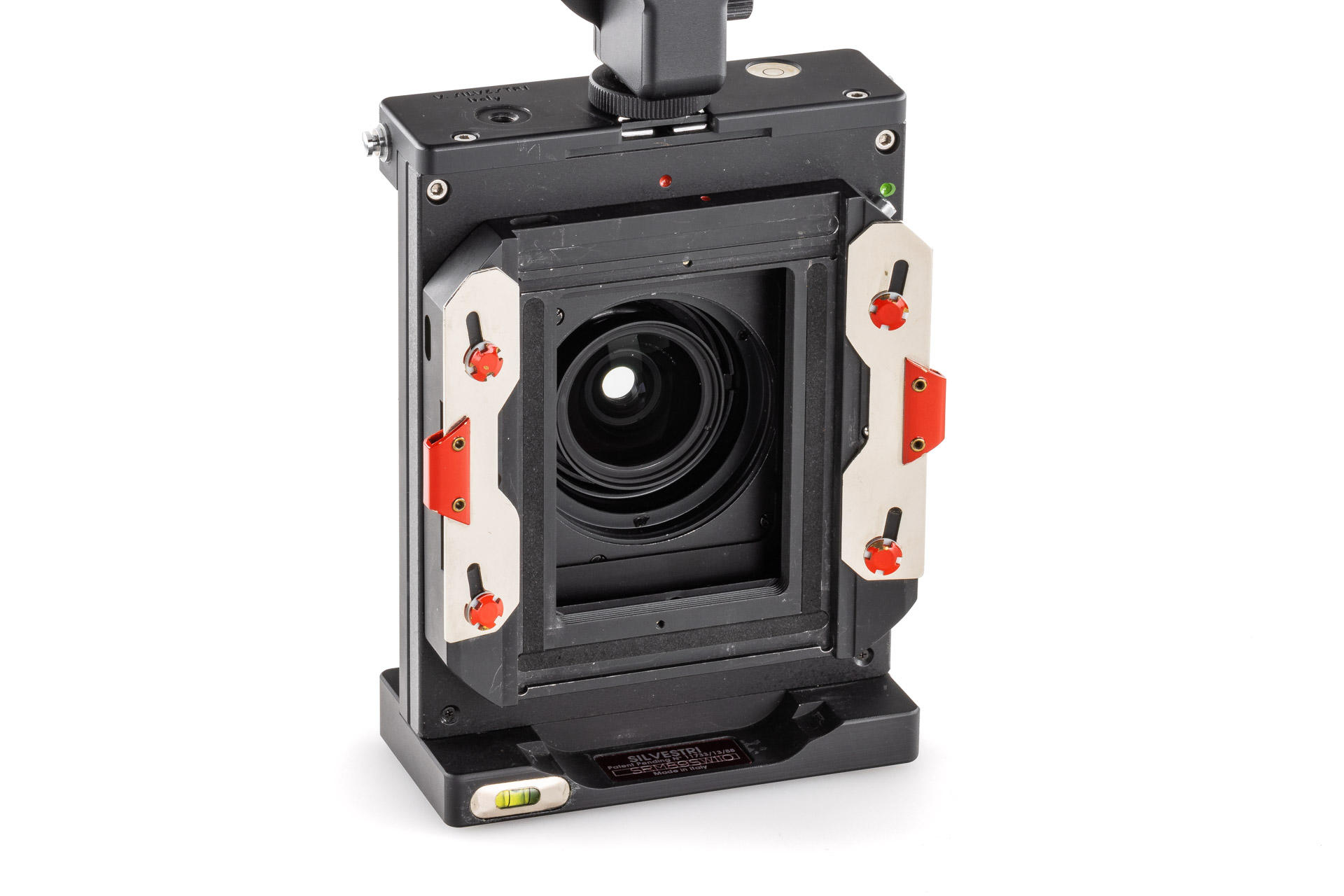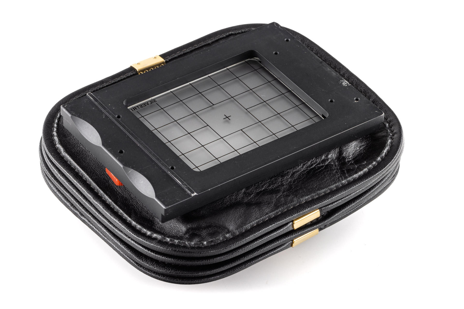 compact and very robust professional shift camera in near mint condition, with clean Super-Angulon 5.6/47mm no.14533122 (finder with matching mask, center-filter and both caps), ground glass with integrated loupe and bellows, Horseman 6x9cm 120 film back, special Polaroid back with mask, instructions and maker's boxes