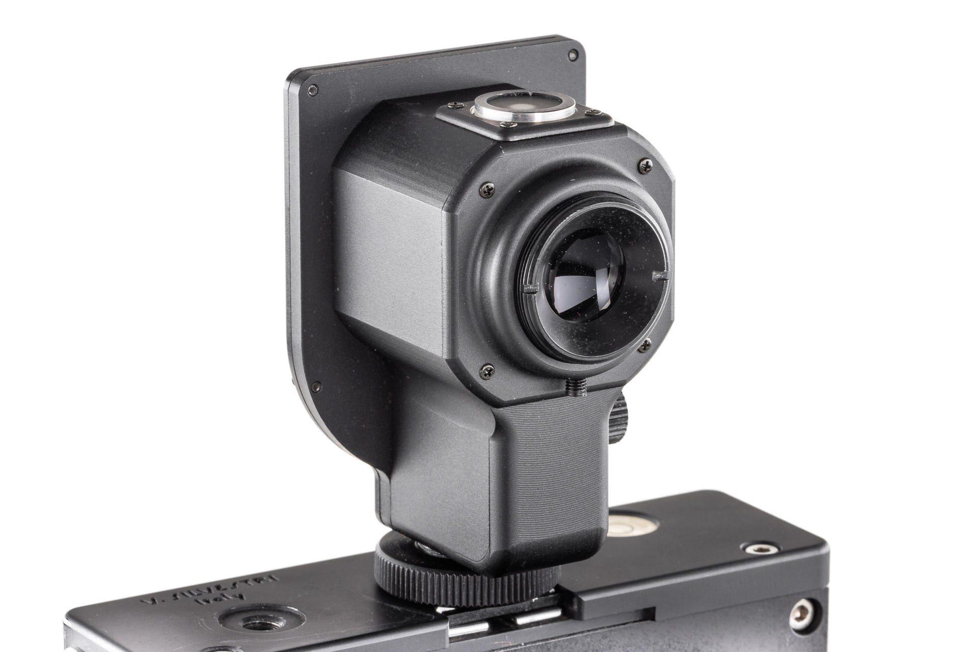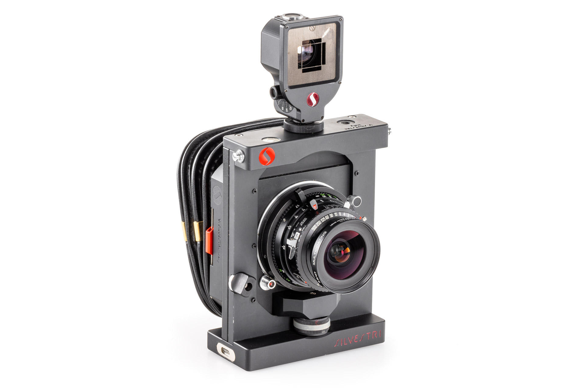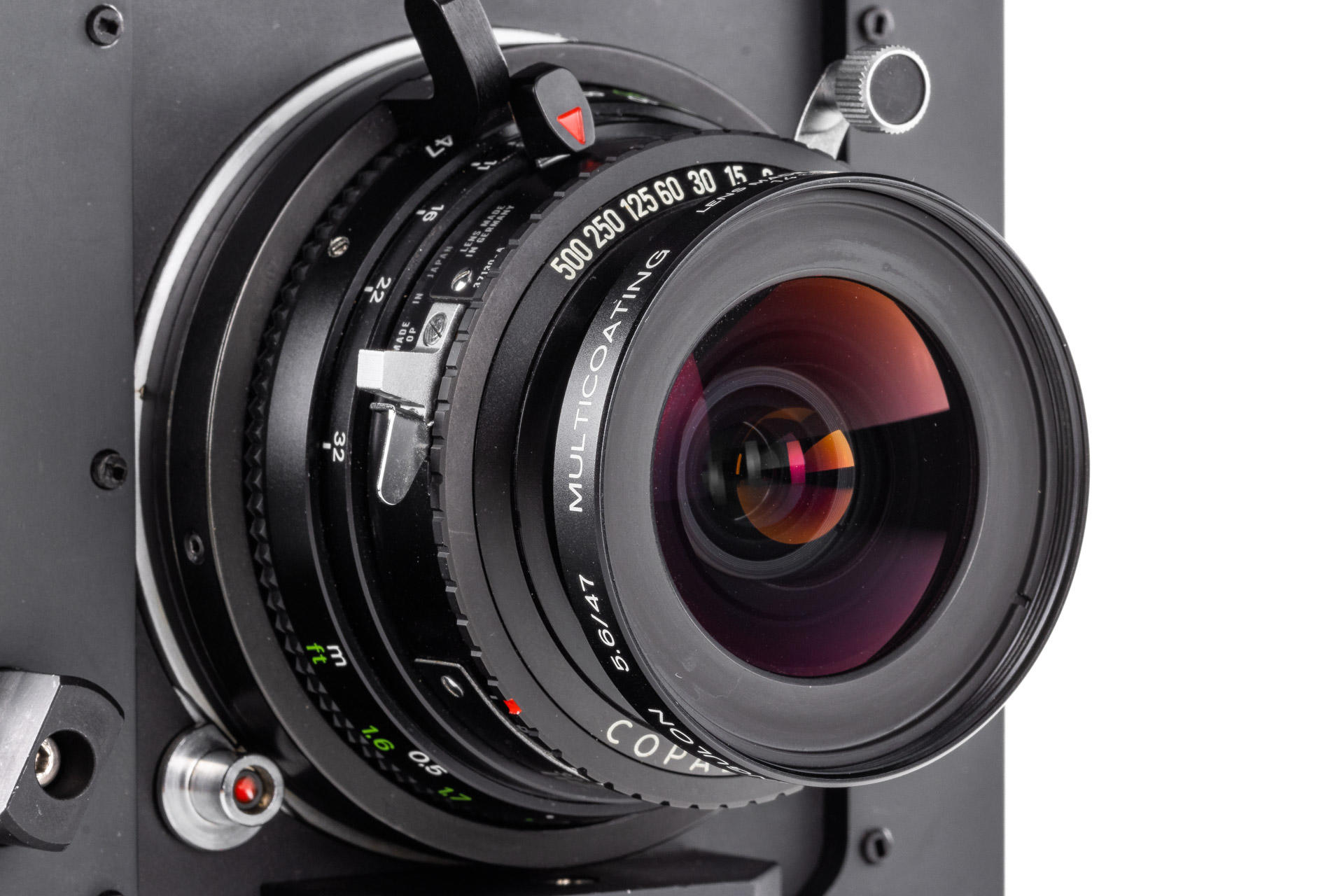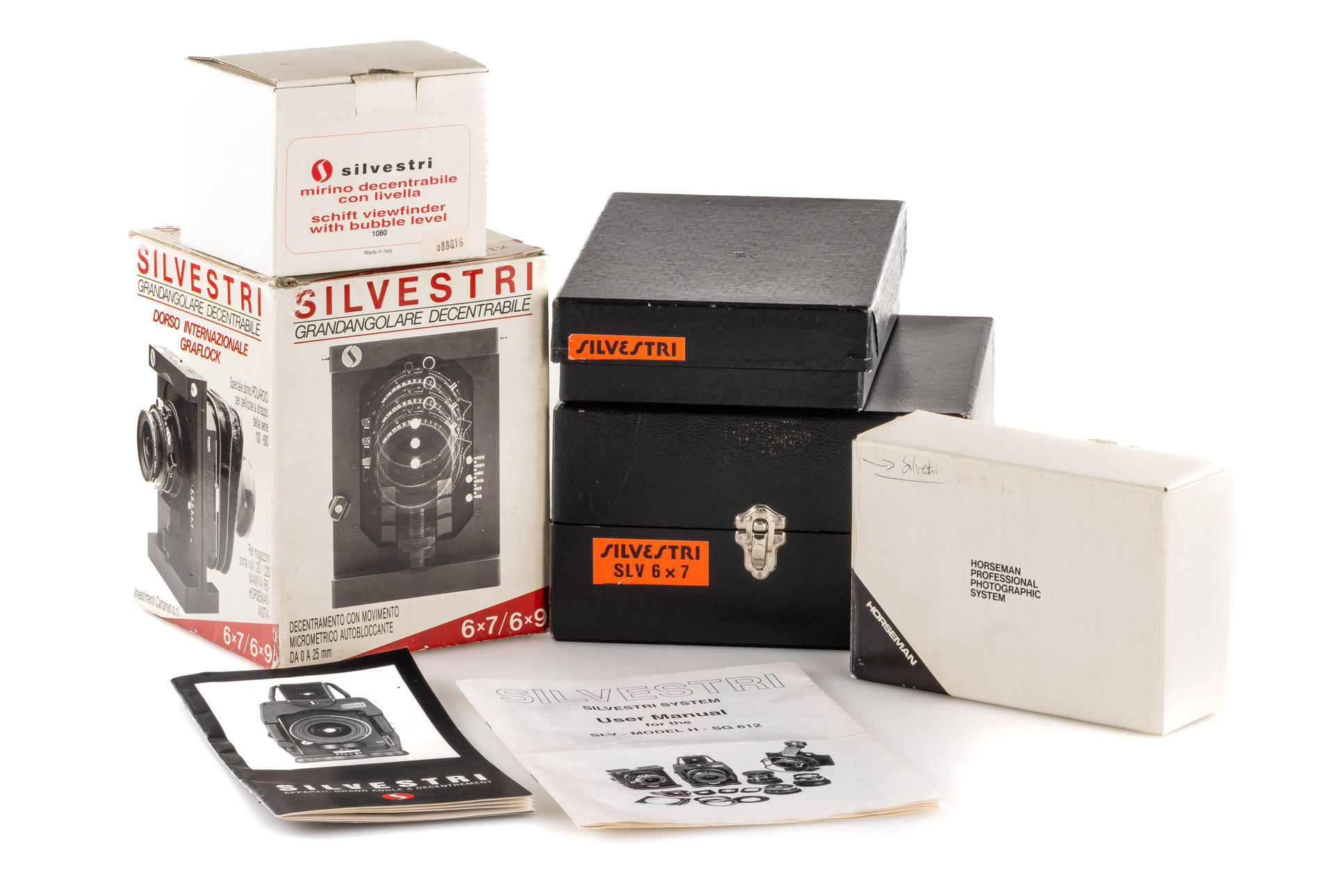 compact and very robust professional shift camera in near mint condition, with clean Super-Angulon 5.6/47mm no.14533122 (finder with matching mask, center-filter and both caps), ground glass with integrated loupe and bellows, Horseman 6x9cm 120 film back, special Polaroid back with mask, instructions and maker's boxes