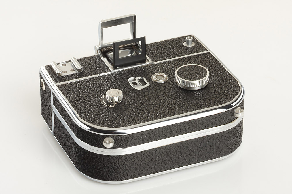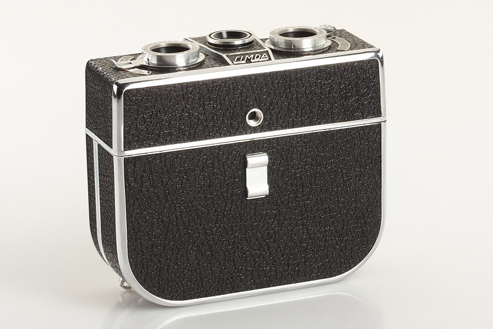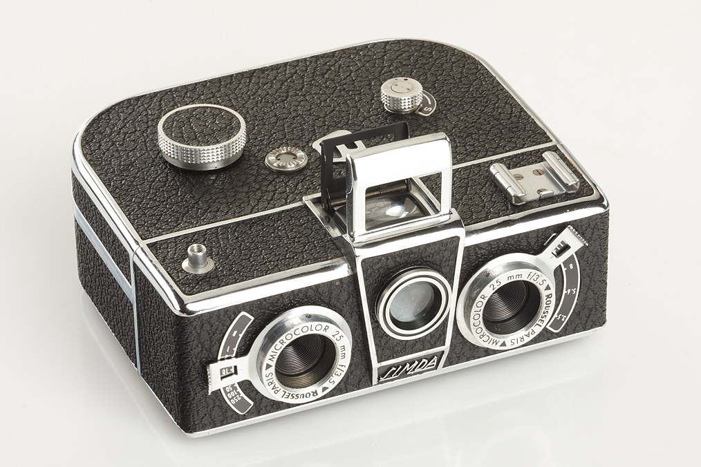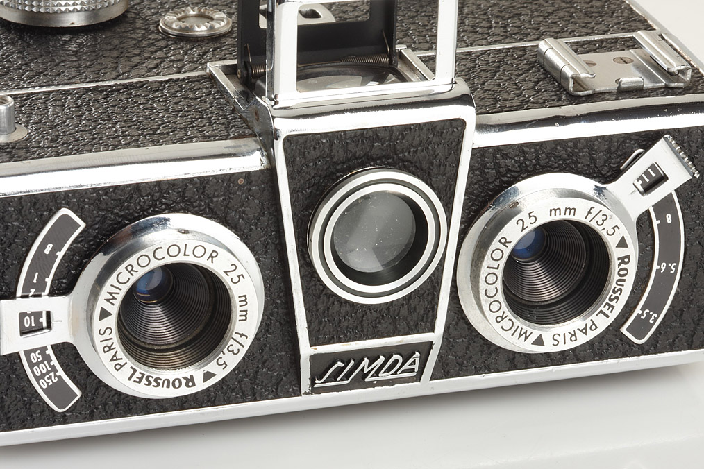 stereo camera for 300 exposures 10x20mm on 16mm film, early version with Roussel Microcolor 3.5/25mm lenses, black leather covering, in mint condition with viewer, strap and maker's box