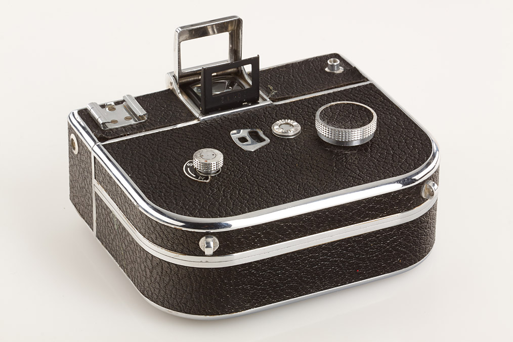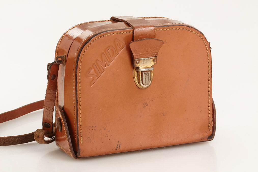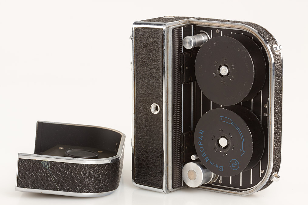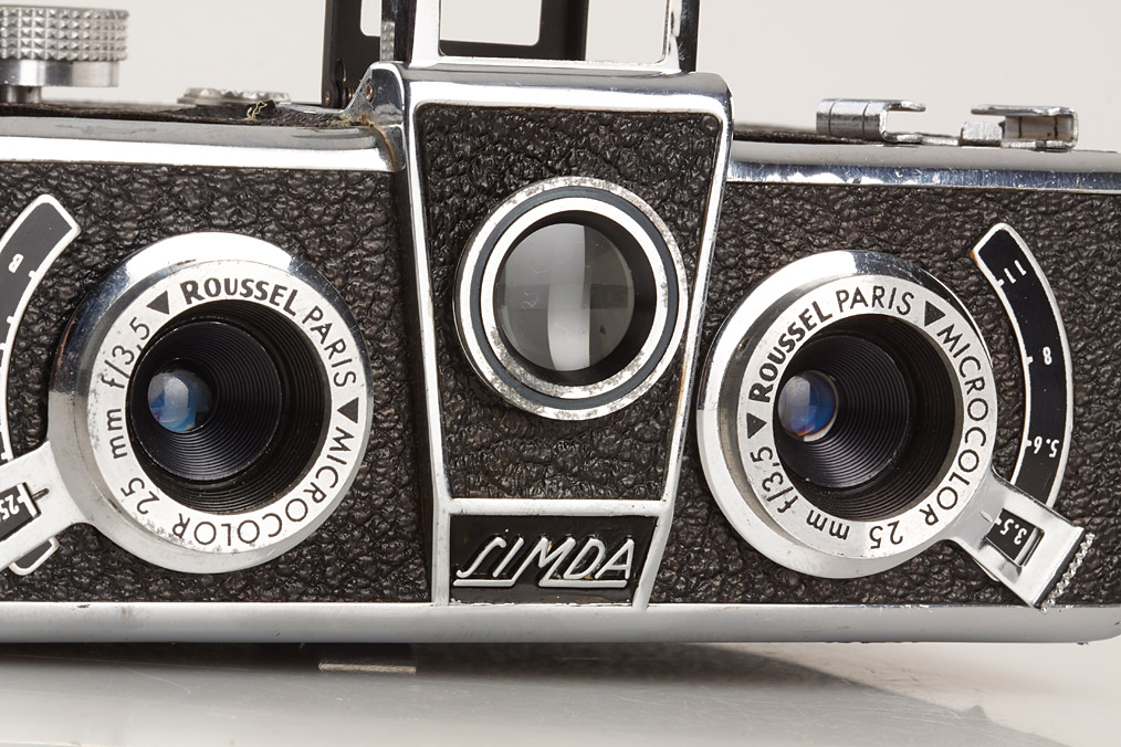 stereo camera for 300 exposures 10x20mm on 16mm film, early version with Roussel Microcolor 3.5/25mm lenses, black leather covering, in very fine condition with original case