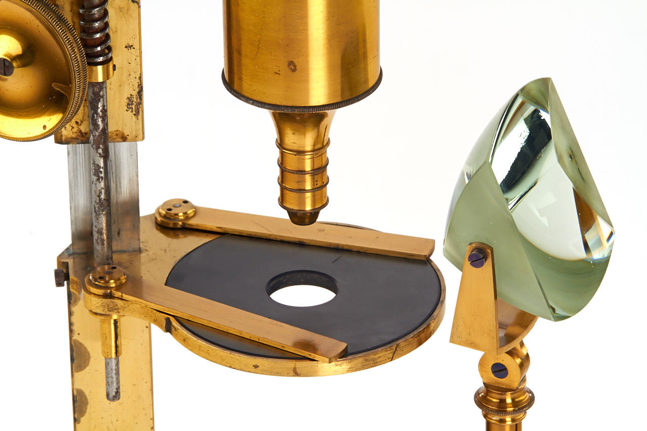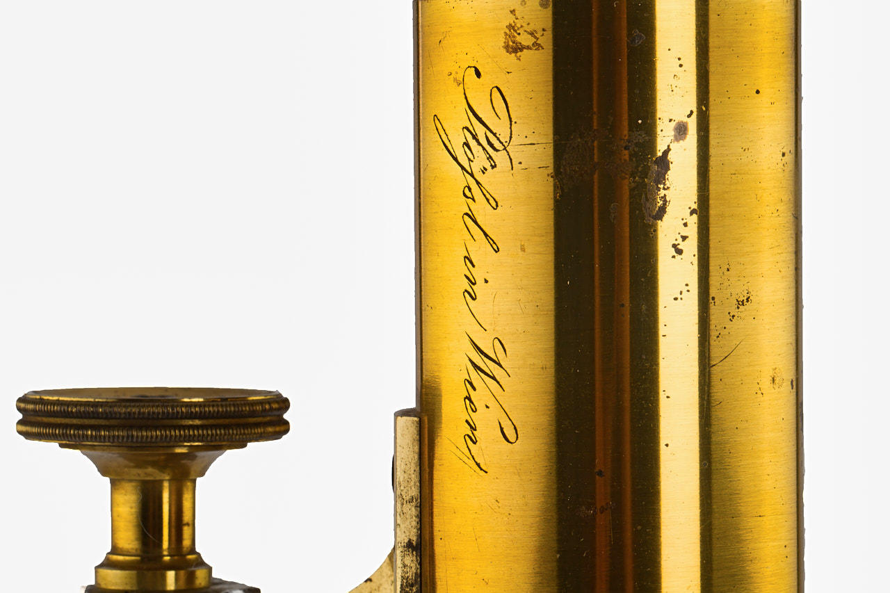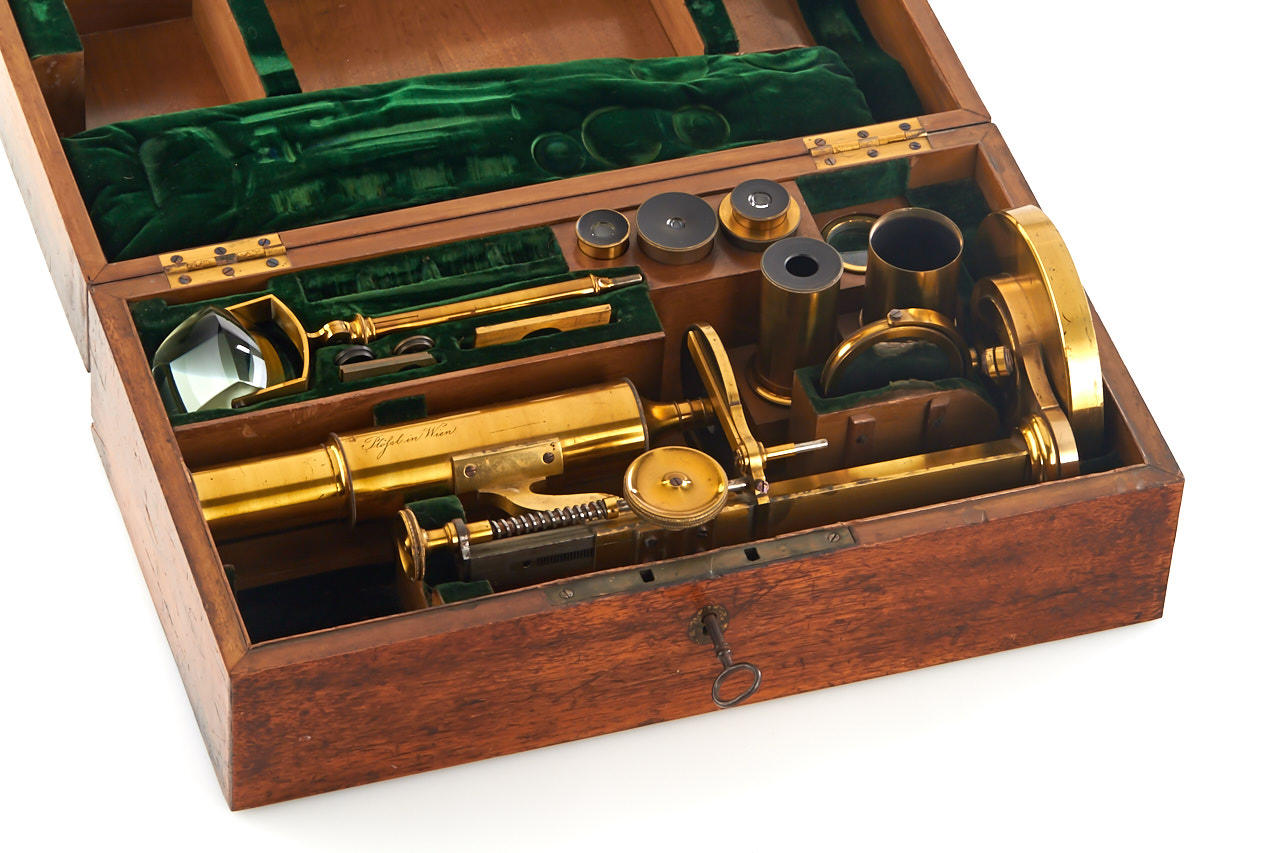 very rare and early Viennese microscope, large model with circular stand, signed on the tube 'Plössl in Wien', lacquered brass, blue and burnished steel. Three eyepieces nos.1, 2, 3, three lenses nos.1,2,3 and accessories. All in fitted green velvet-lined walnut-veneered case