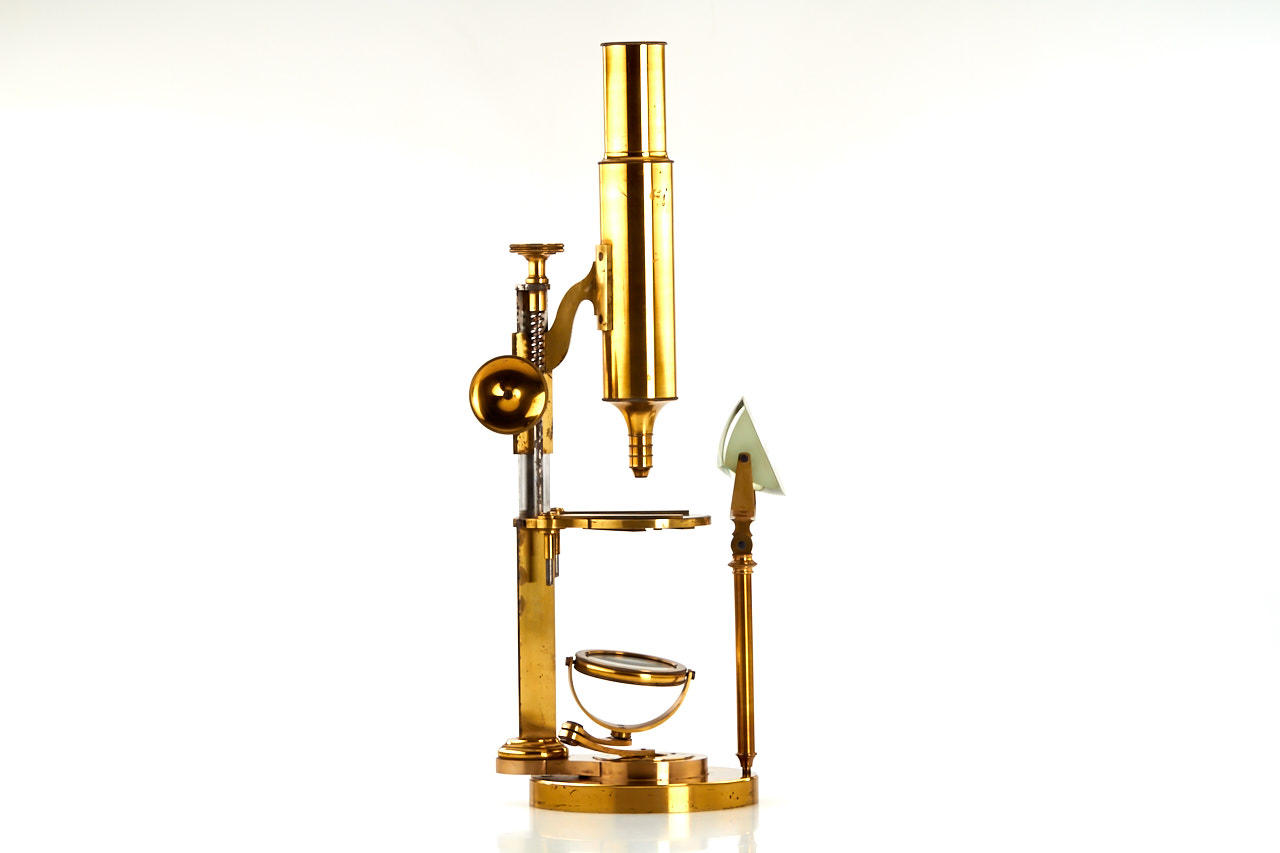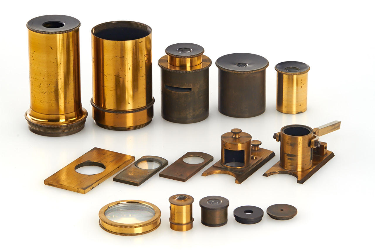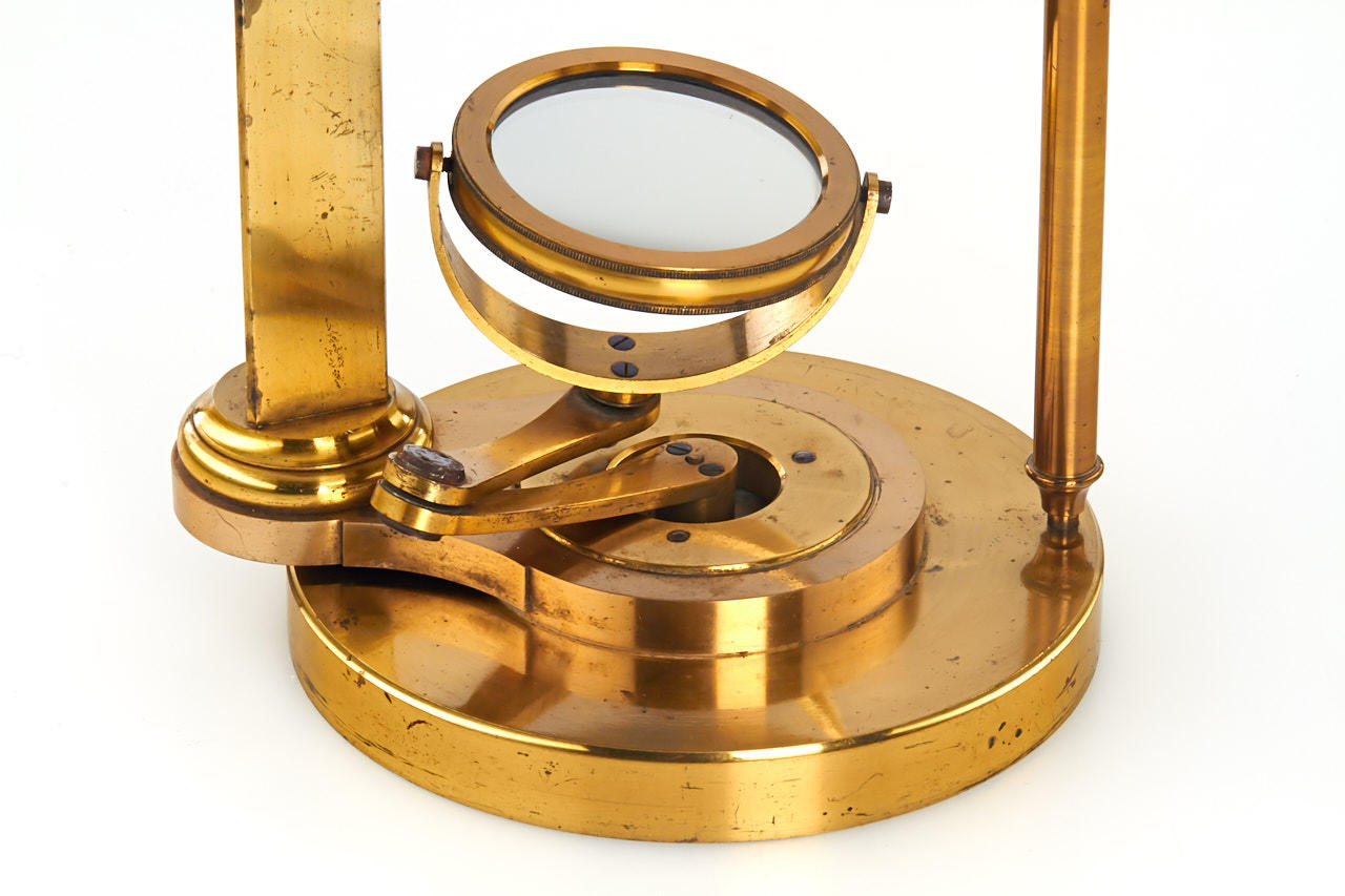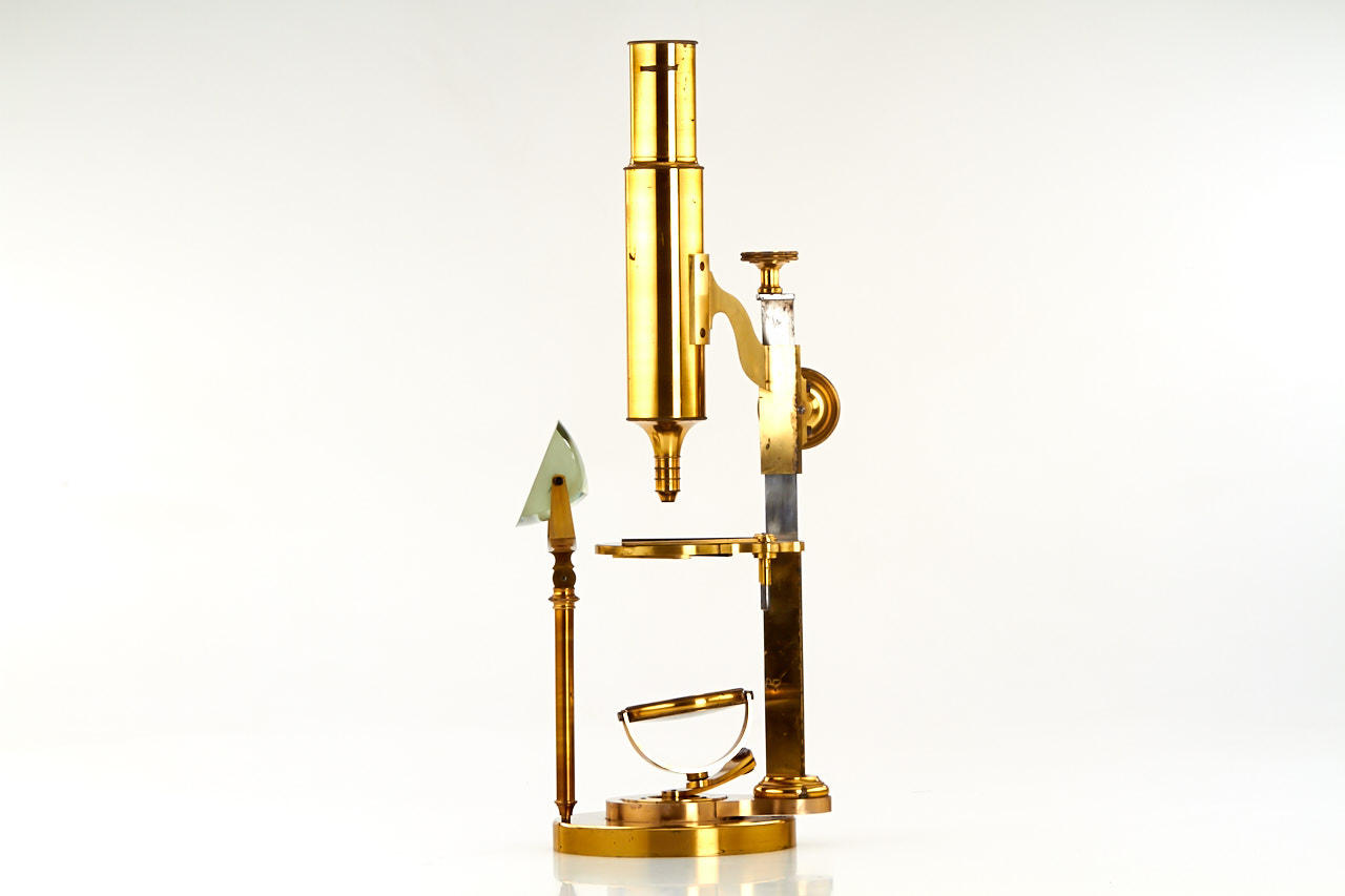 very rare and early Viennese microscope, large model with circular stand, signed on the tube 'Plössl in Wien', lacquered brass, blue and burnished steel. Three eyepieces nos.1, 2, 3, three lenses nos.1,2,3 and accessories. All in fitted green velvet-lined walnut-veneered case