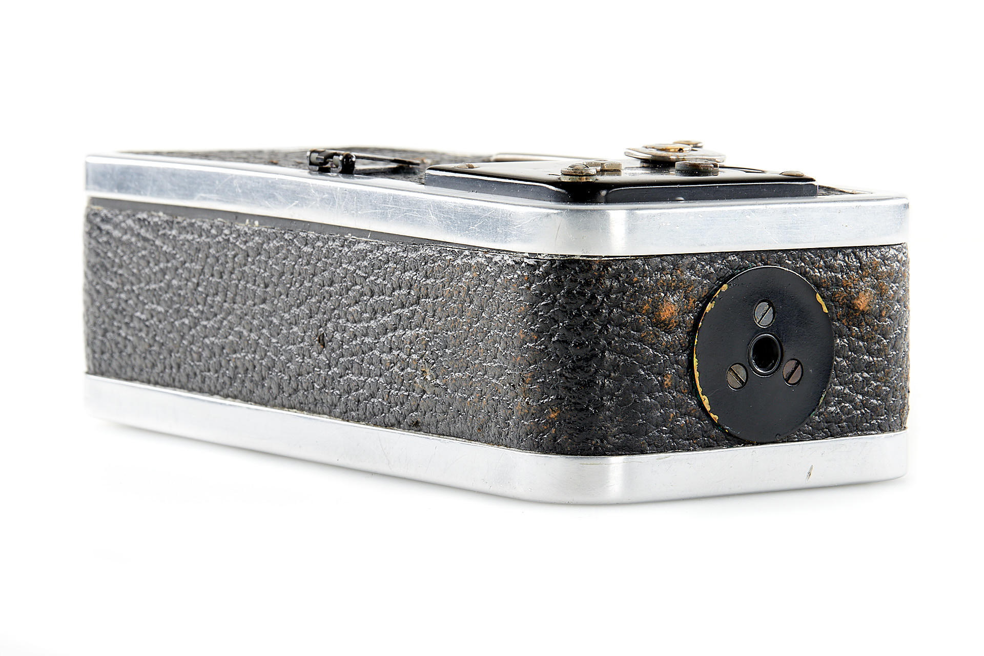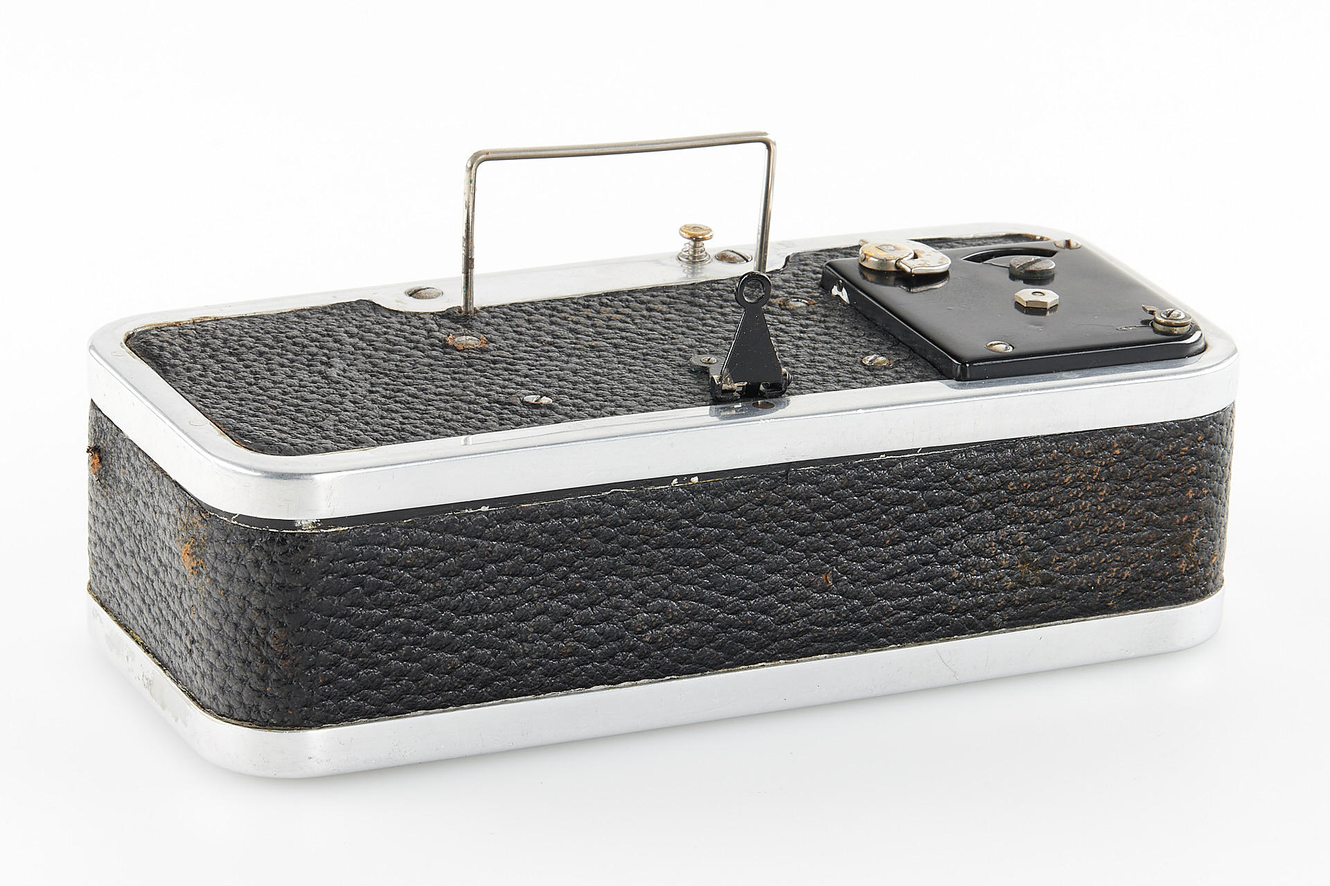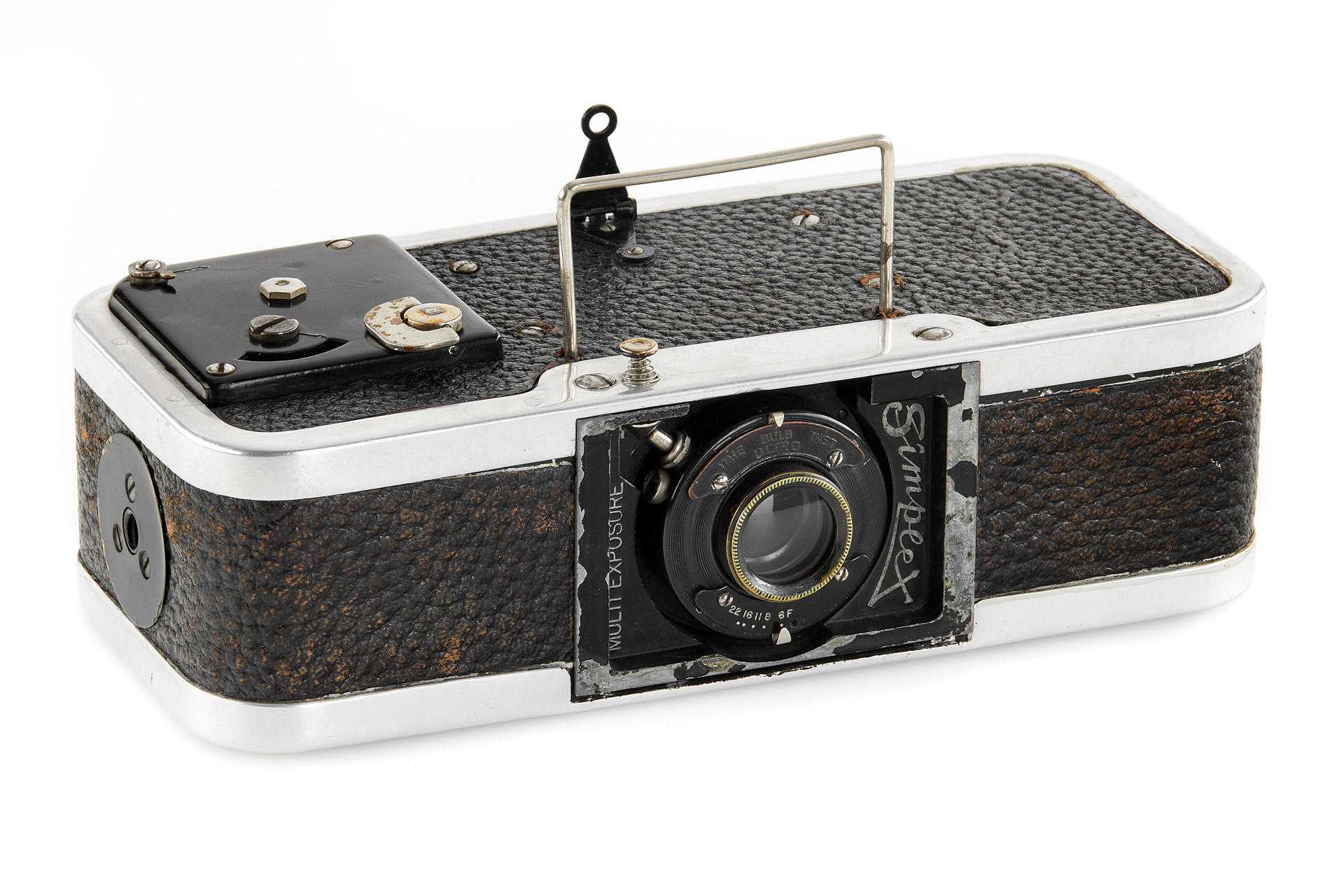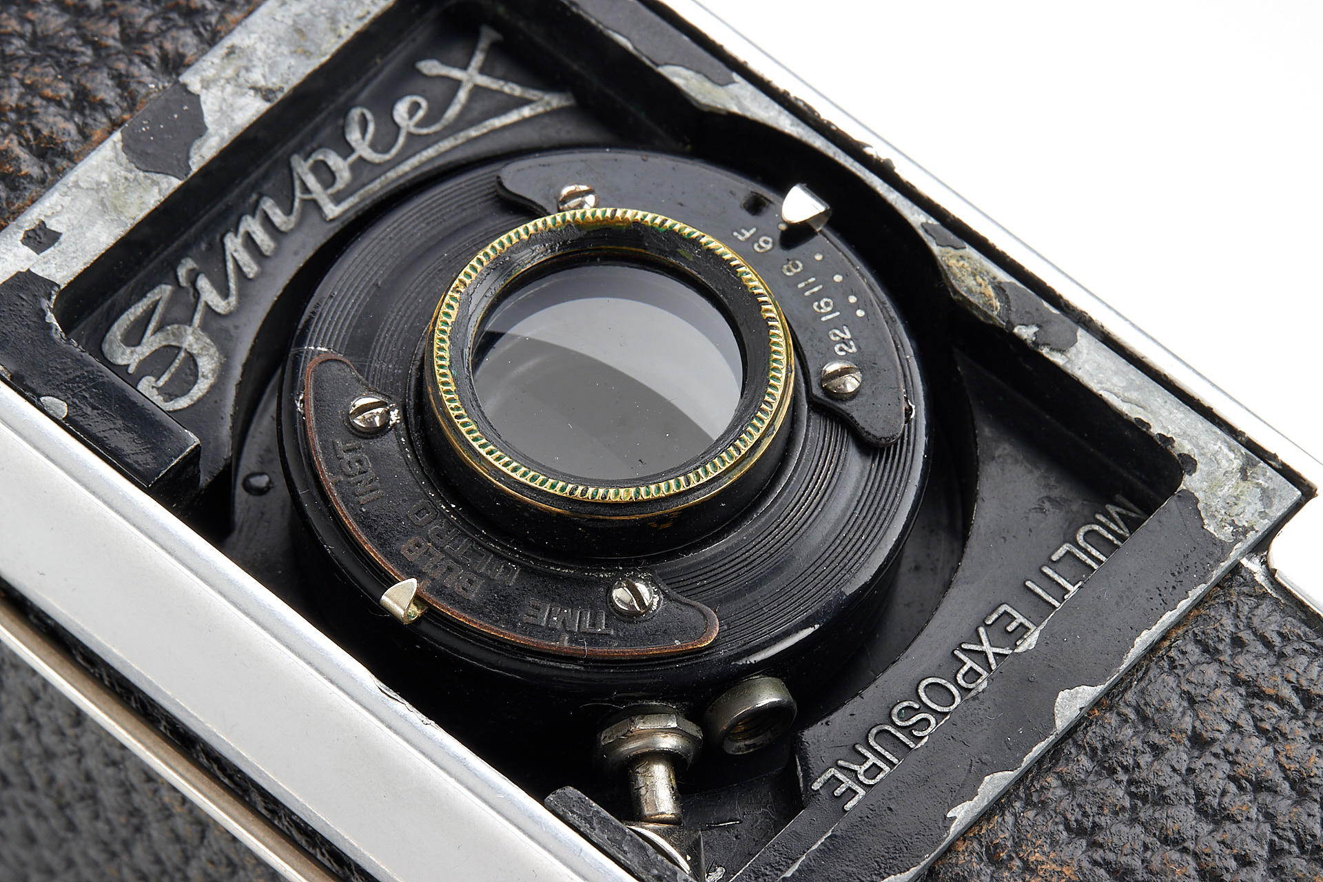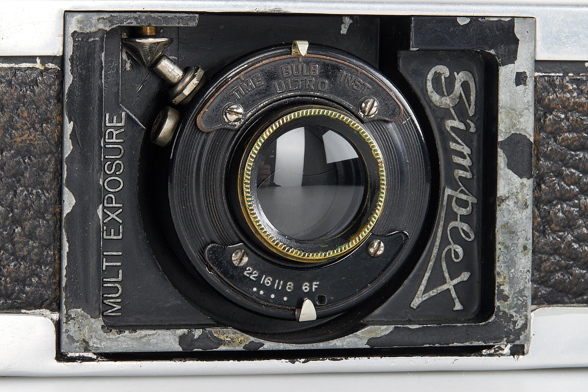 Designed and manufactured in New York City, the 1915 Simplex Multi-Exposure Model B was the first commercially sold full-frame 35mm camera. The Simplex lineup was produced in four models with an estimated total production of fewer than 50 cameras. The economy Model B here was the only version to offer full-frame format only, the other Simplex models were convertible full or half frame. The Multi-Exposure used 50-feet film magazines, with a capacity of up to 400 exposures and a fixed 6/50mm lens (no ser.no.) in an Ultro shutter, two original spools for perforated 35mm film, back internally engraved ´3026´ While the Tourist Multiple and the French Homeos received earlier patents (both half-frame cameras), the original Simplex Multi-Exposure was sold over the counter to customers in 1914, beating the Tourist Multiple by a few months. Alas, the Simplex Multiple-Exposure camera line did not survive the marketing unpleasantries of WWI. The Simplex Model B is one of the rarest and earliest 35mm cameras.