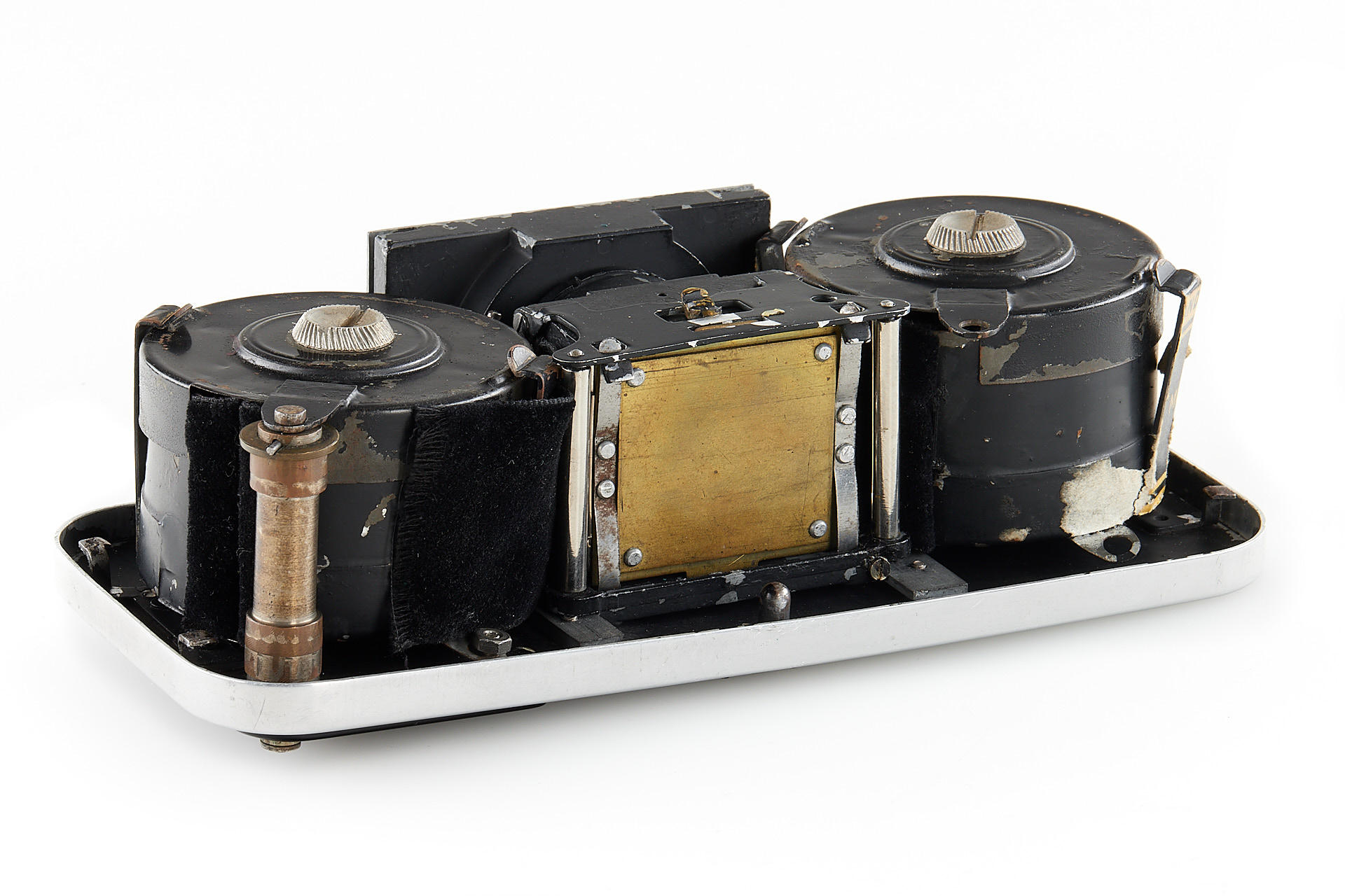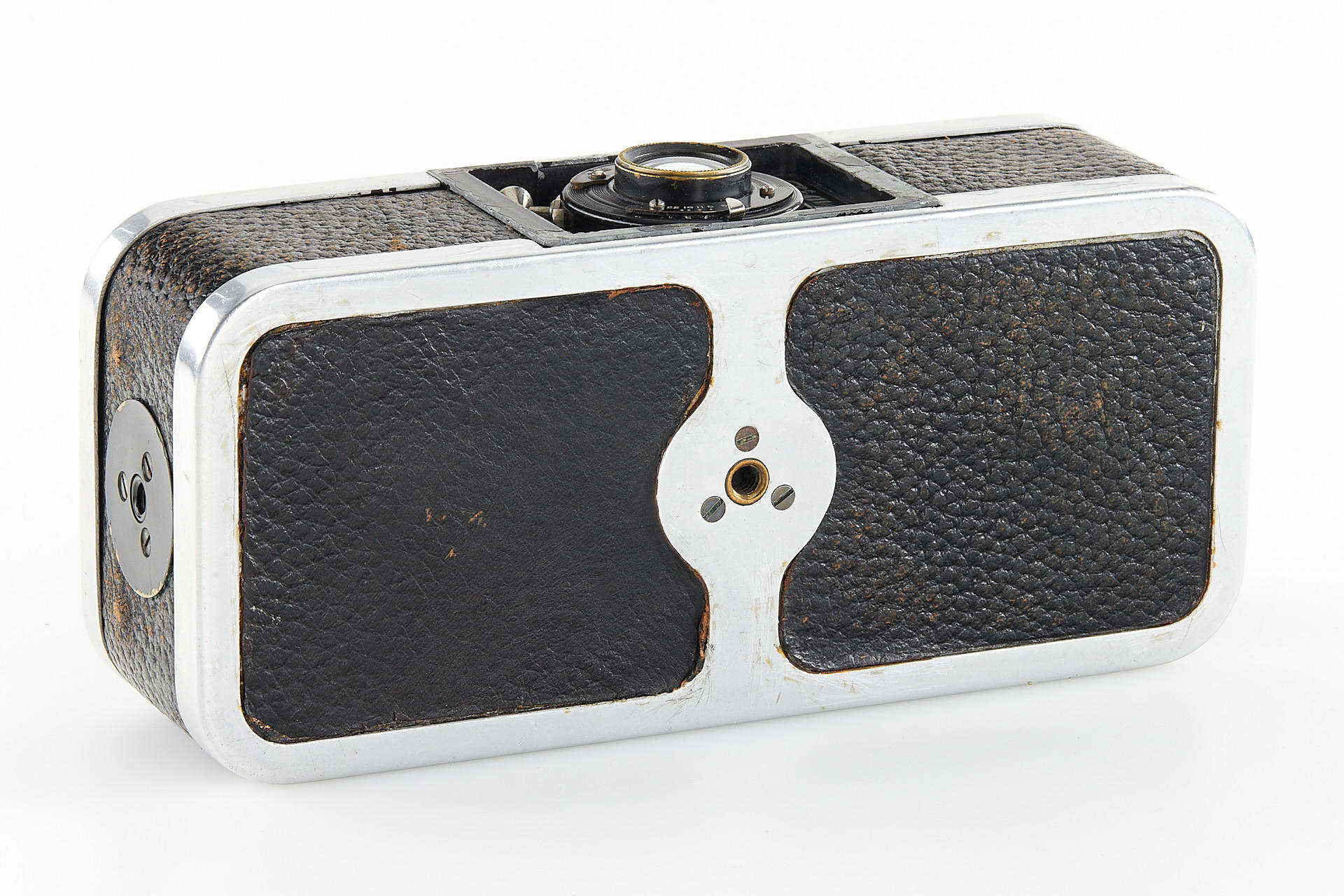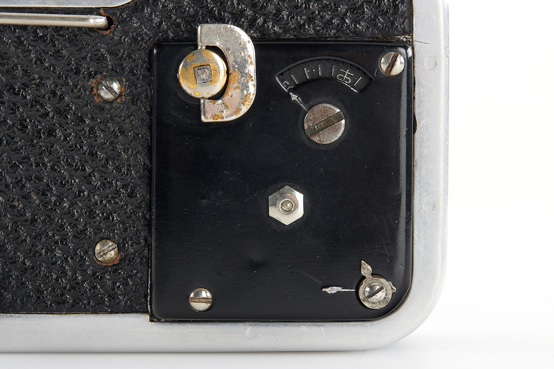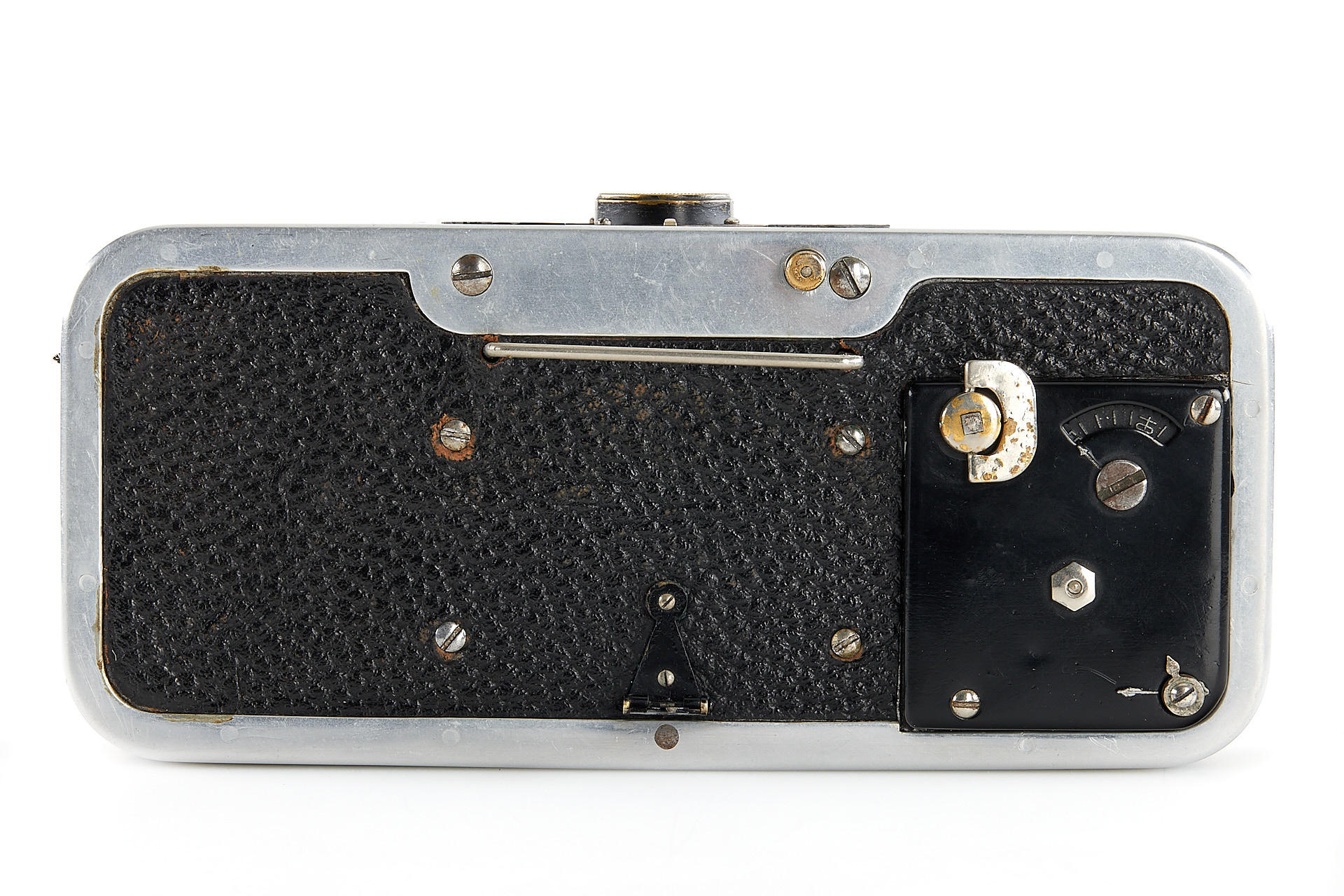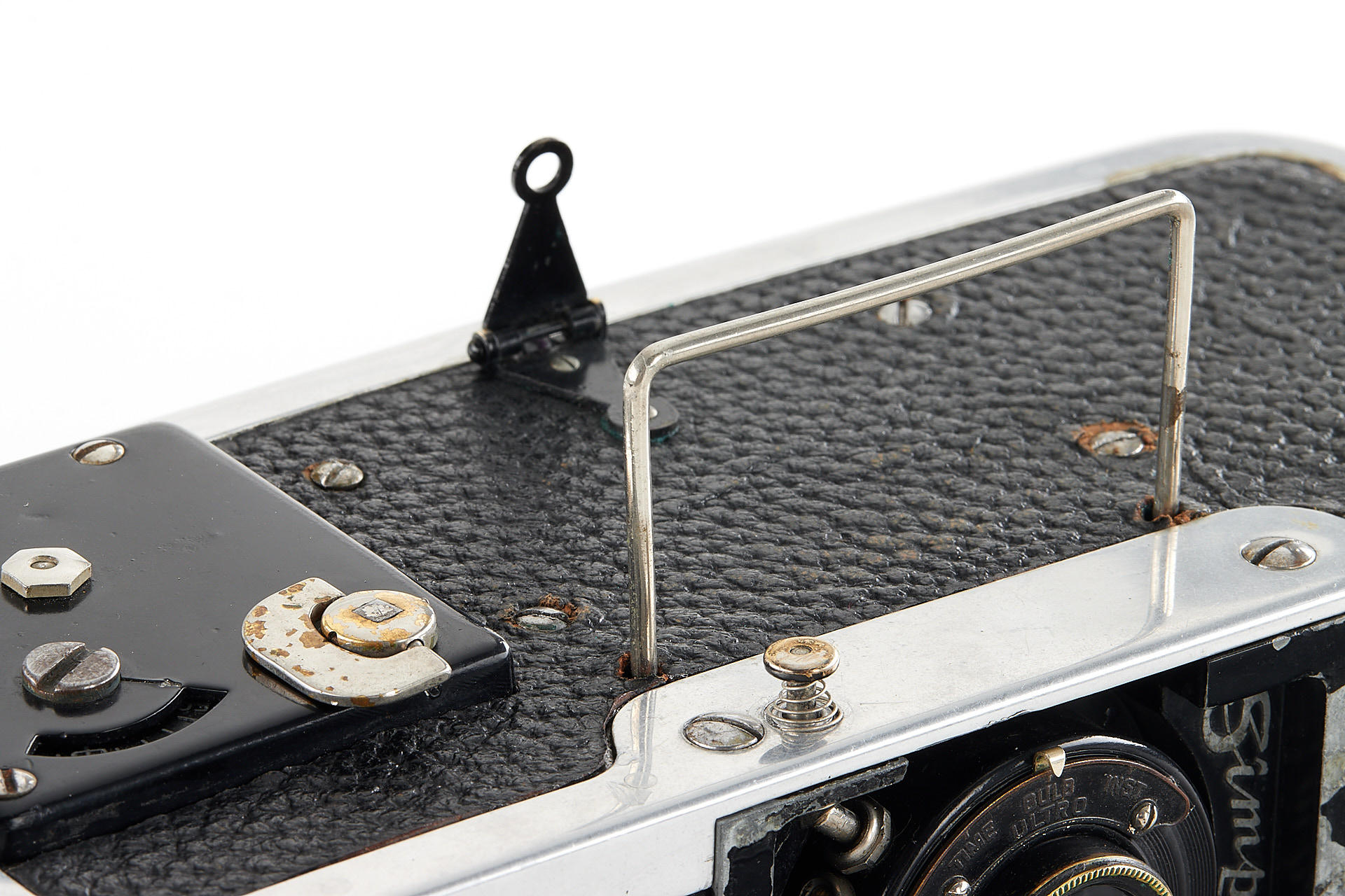 Designed and manufactured in New York City, the 1915 Simplex Multi-Exposure Model B was the first commercially sold full-frame 35mm camera. The Simplex lineup was produced in four models with an estimated total production of fewer than 50 cameras. The economy Model B here was the only version to offer full-frame format only, the other Simplex models were convertible full or half frame. The Multi-Exposure used 50-feet film magazines, with a capacity of up to 400 exposures and a fixed 6/50mm lens (no ser.no.) in an Ultro shutter, two original spools for perforated 35mm film, back internally engraved ´3026´ While the Tourist Multiple and the French Homeos received earlier patents (both half-frame cameras), the original Simplex Multi-Exposure was sold over the counter to customers in 1914, beating the Tourist Multiple by a few months. Alas, the Simplex Multiple-Exposure camera line did not survive the marketing unpleasantries of WWI. The Simplex Model B is one of the rarest and earliest 35mm cameras.
