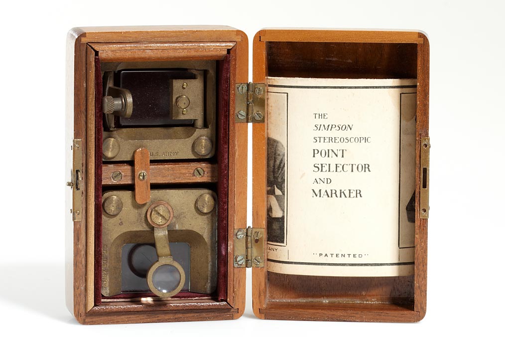 rare WWI point selector and marker for photogrammetry to be used with a stereoscope, compact design for military field use in fitted walnut box, instructions, in good condition.