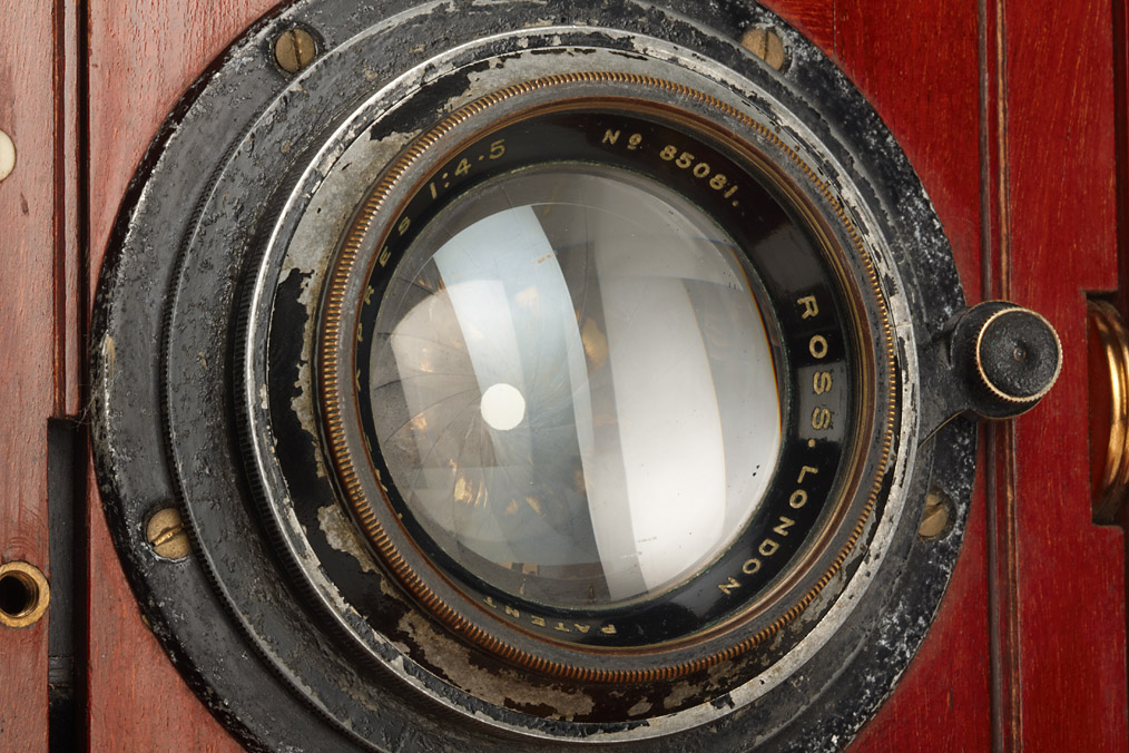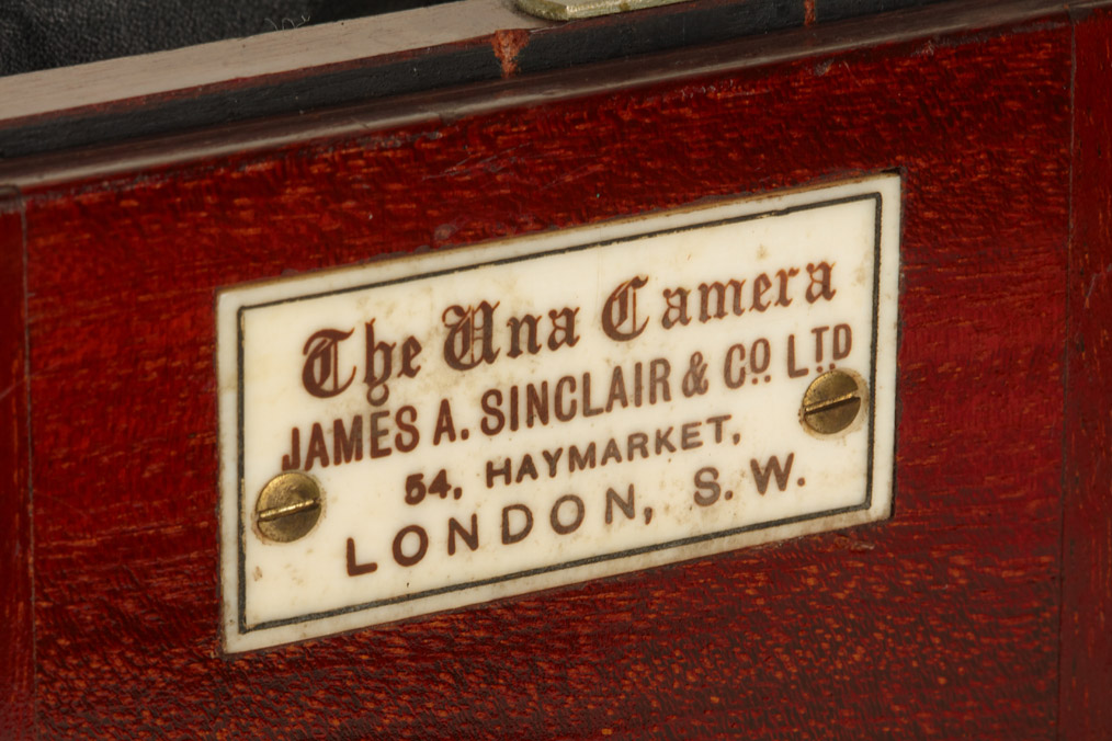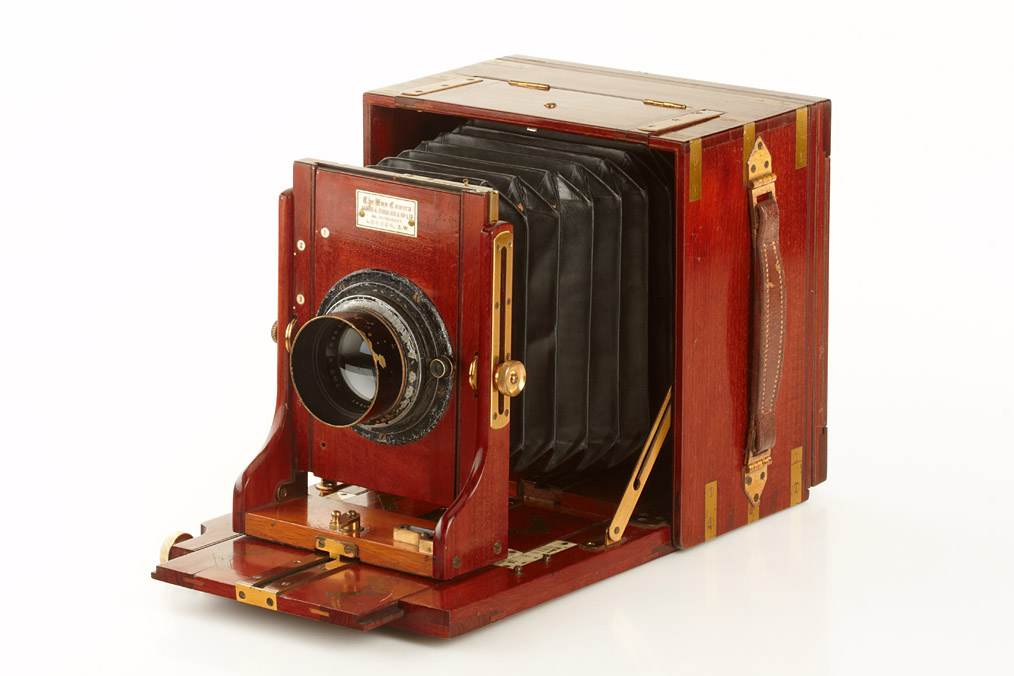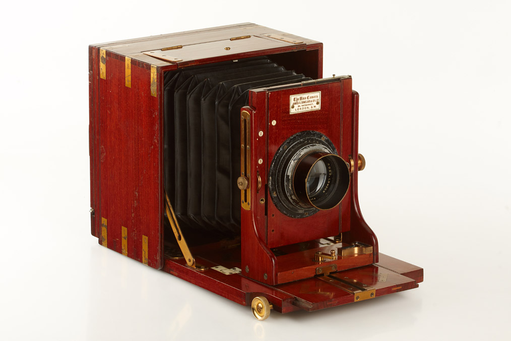 4x5" version of this rare camera with triple-extension in very good condition, brass fittings, polished-mahogany body, Ross 4.5/7 1/4" no.85081, original ground glass screen, six double plate film holders, Sinclair leather case
