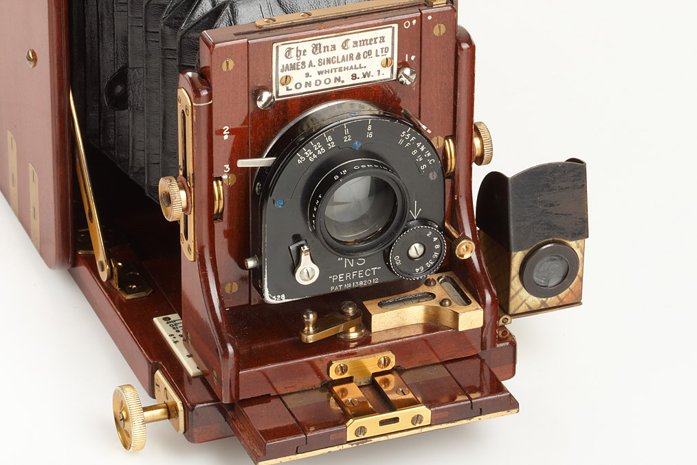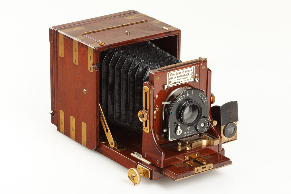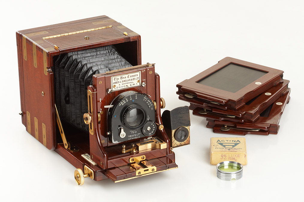 6x9cm version of this rare camera in stunning condition, brass fittings, polished-mahogany body, Ross Combinable 8" lens in NS Perfect shutter, 3 double plate filmholders, Sinclair leather outfit case