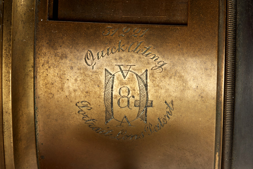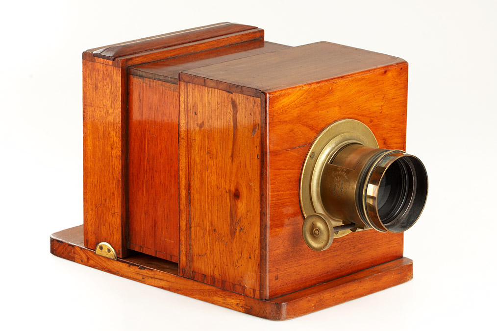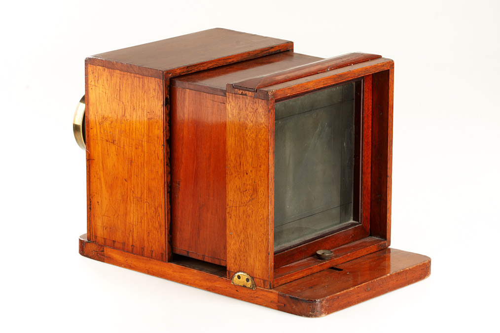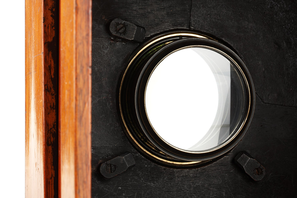 wholeplate British mahogany camera in fine condition, complete with mahogany plate holder, Petzval type lens for waterhouse stops: Quick Acting Portrait Lens Patent no.31221 (cap), focusing screen adapter, original and rare contemporary glass developing tank