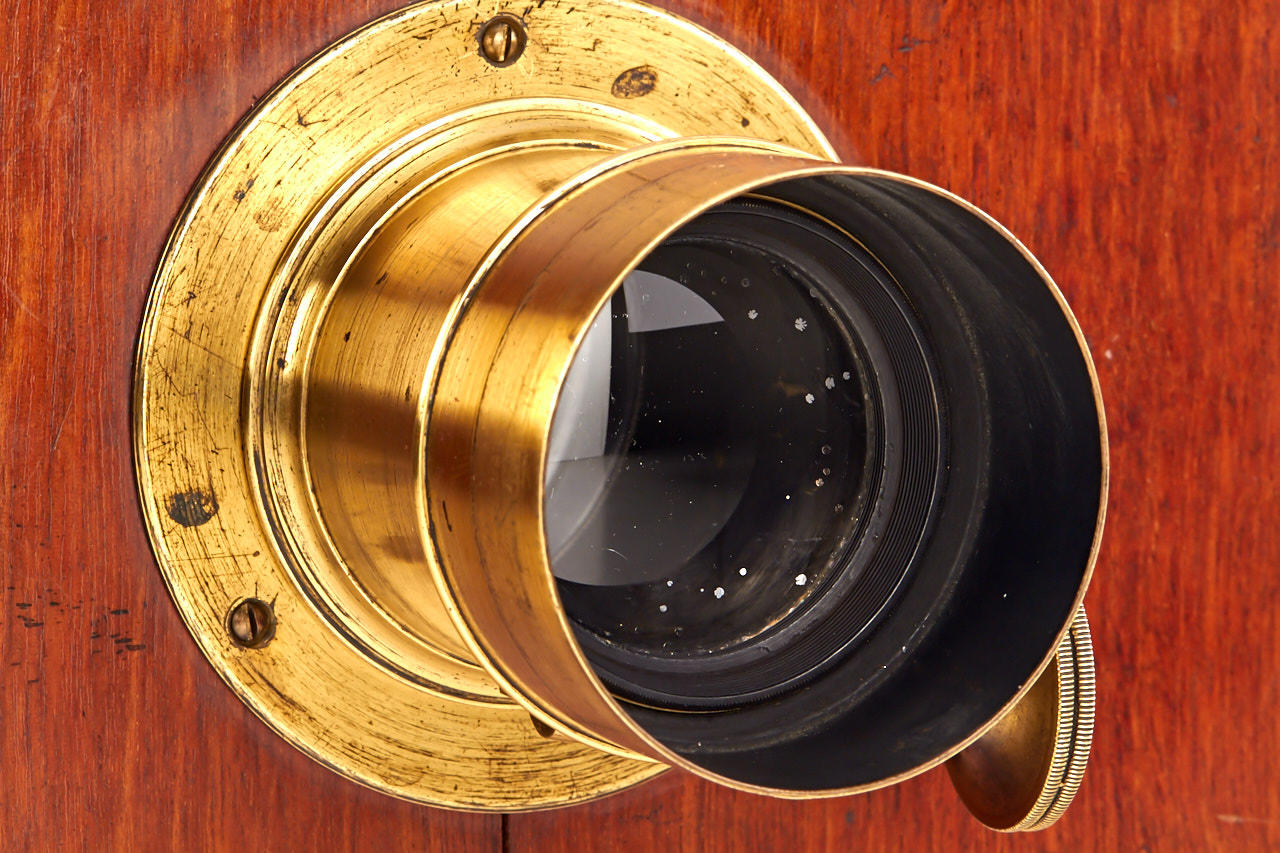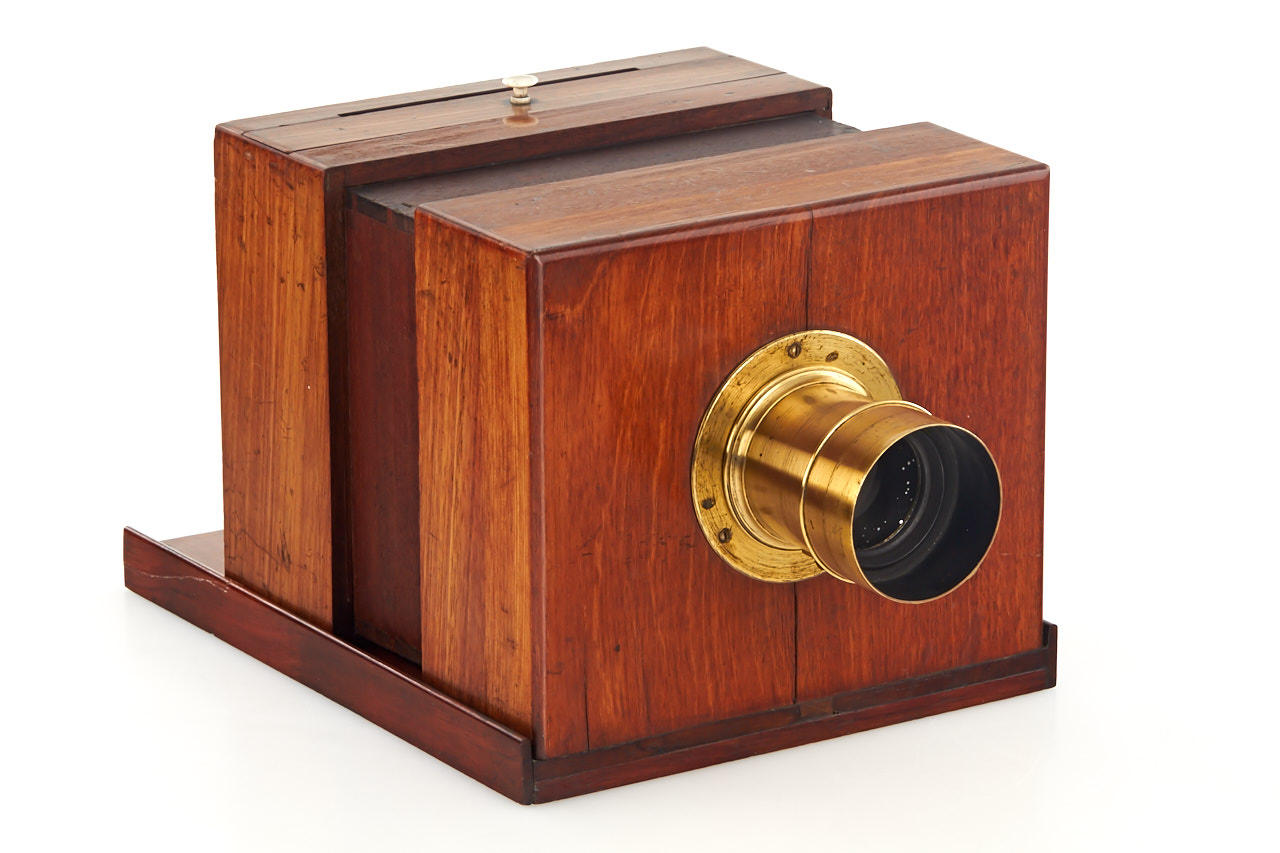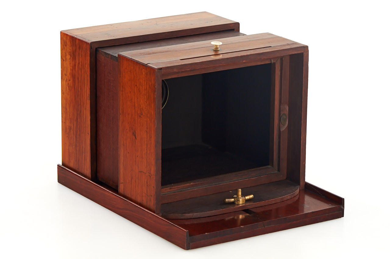early American Daguerreotype sliding-box camera, beautifully crafted mahogany body, half-plate size, except for the ground glass no missing parts, with early unmarked Petzval type lens (c.15cm focal length, total height with hood 11cm) - in fantastic and 100% original condition