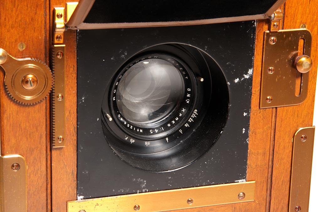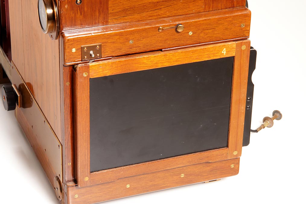 13x18cm, very rare large format Tropical Reflex in superb condition, teak body with brass inlets, red leather bellows and focusing hood, Ross X Press 4.5/8.5 Inch lens no.125640, focal plane shutter, 9 double dark slides, fitted Wallace & Heaton leather case