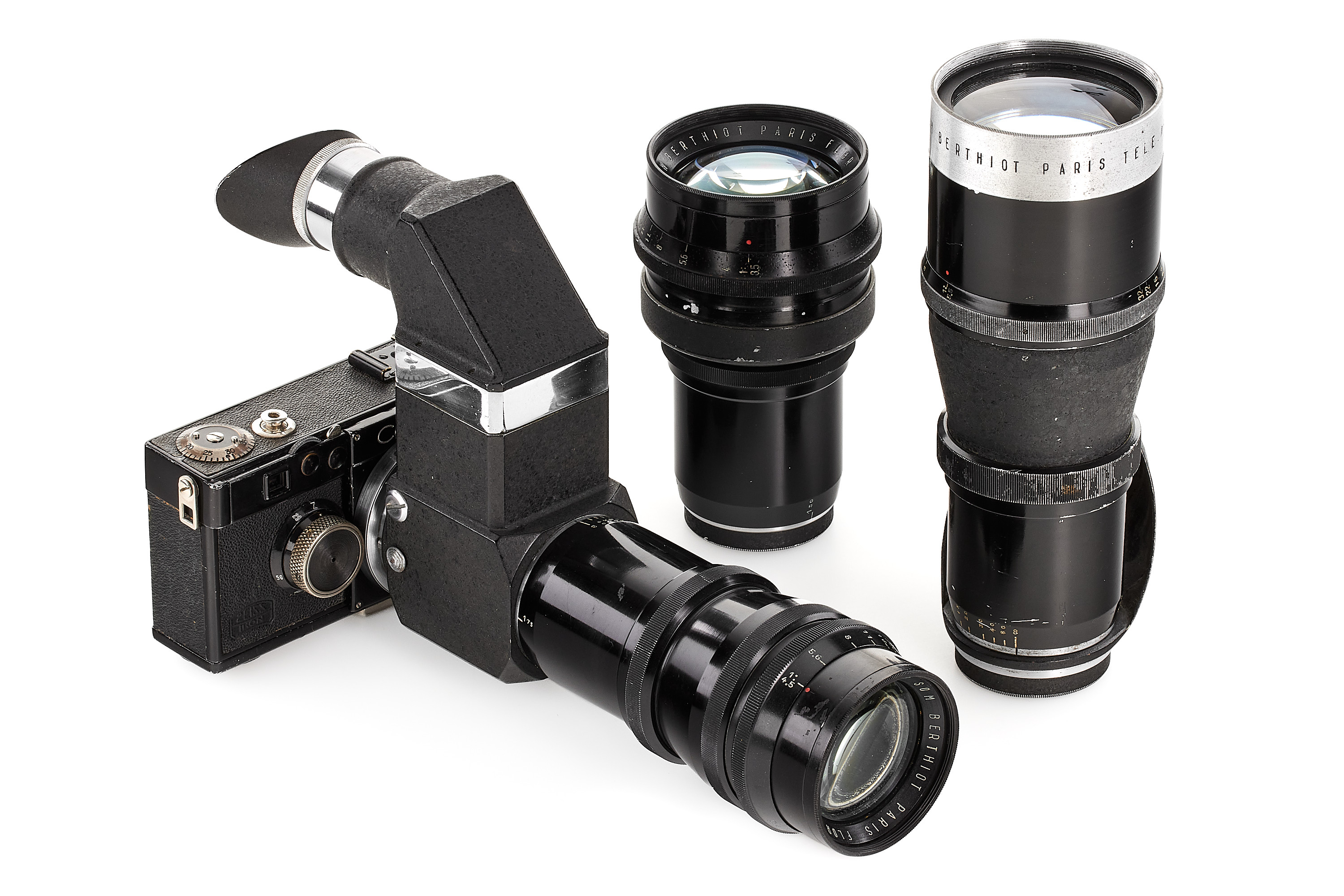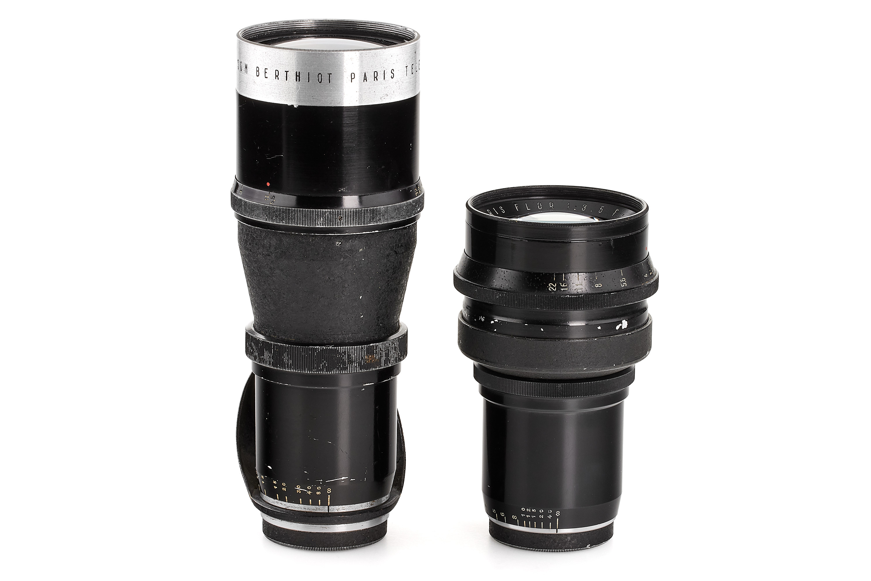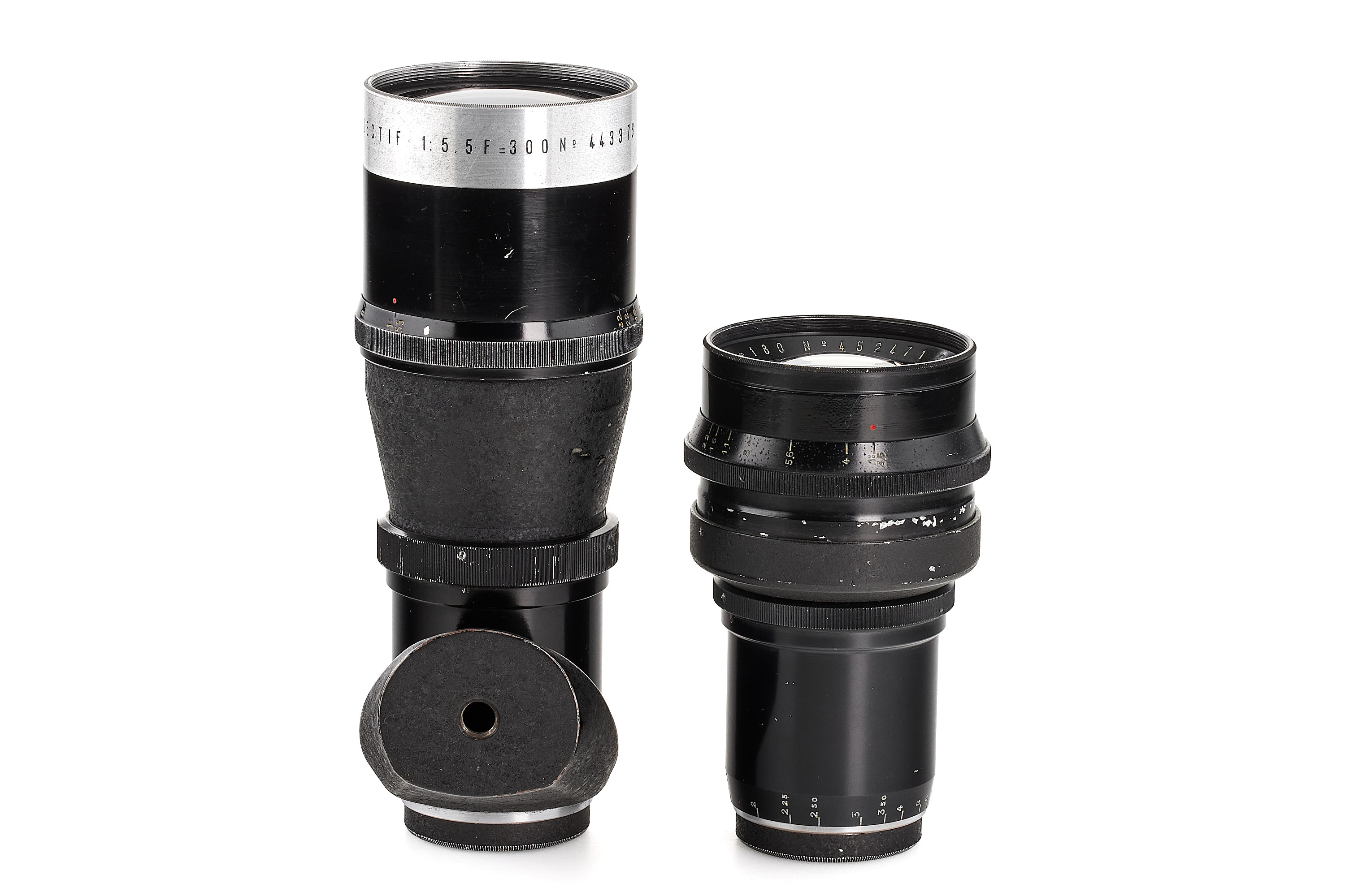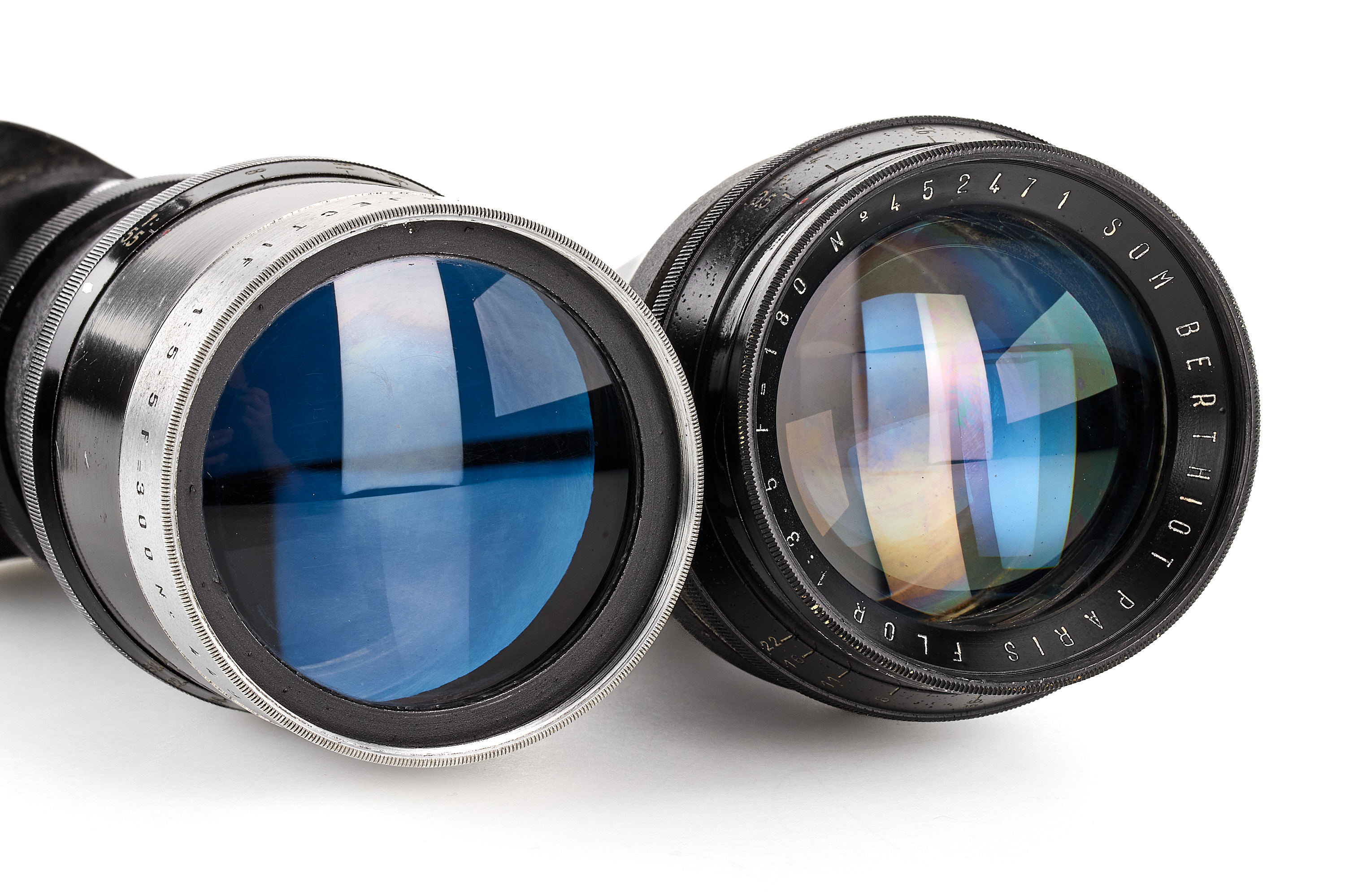 Very interesting set of Som Berthiot lenses, including a Flor 3.5/180mm no.452471 with very good coated optics (both caps and hood), a Flor 4.5/200mm no.484617, optics showing some blemishes in the coating and cleaning marks (front cap and hood), a Tele.Objectif 5.5/300mm no.443378 with good optics only showing some cleaning marks (both caps and hood), together with reflex housing and early Contax I no.A.U.65678.